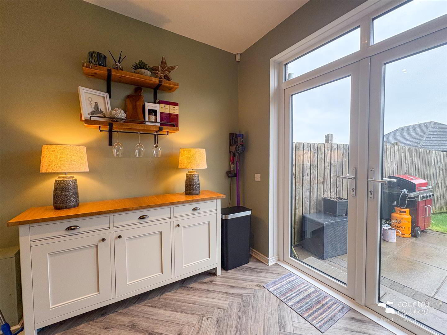 - Herringbone laminate flooring extending through to kitchen/ dining.