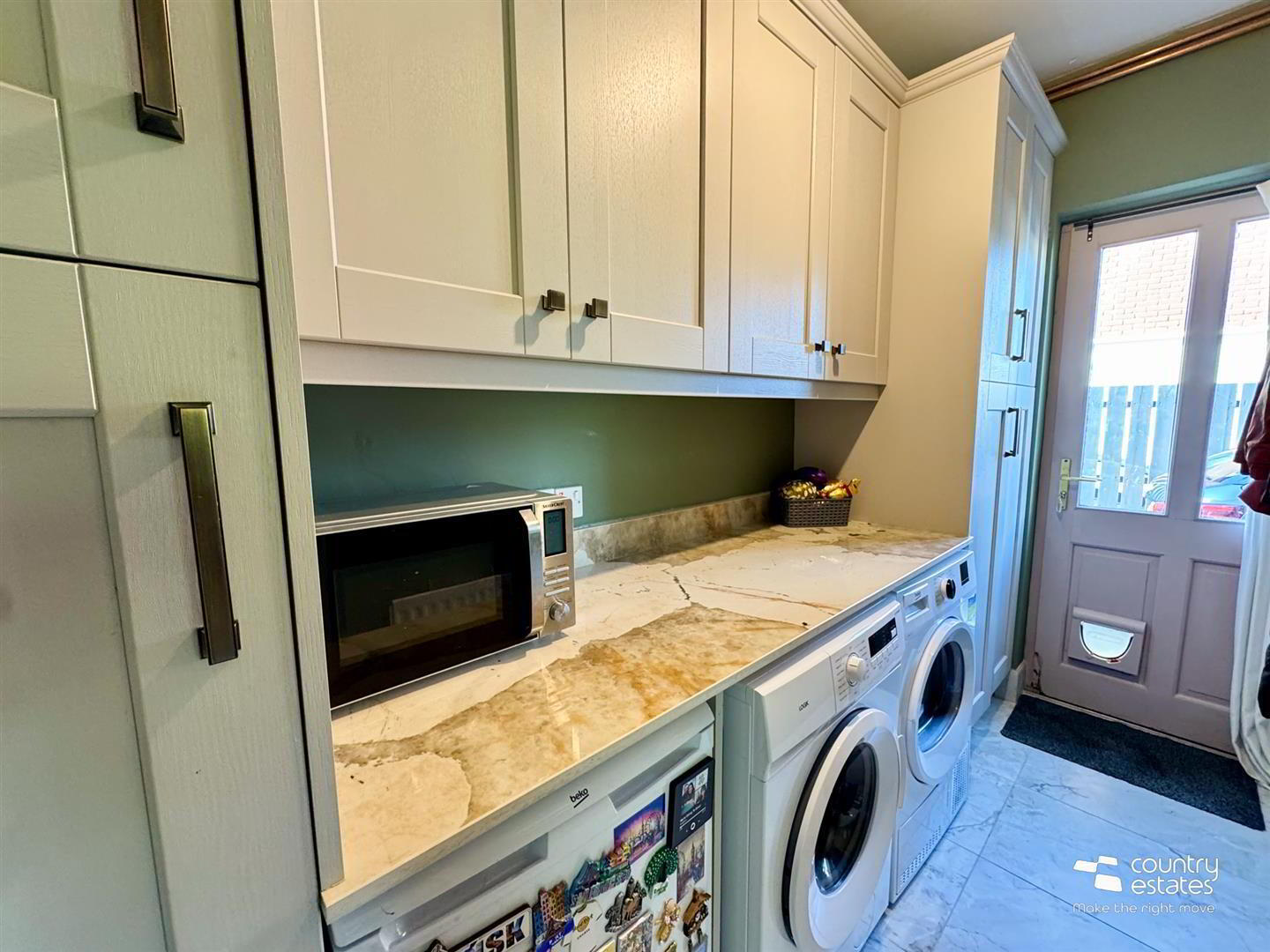 - Recently fitted to an exceptional standard, this stylish utility room features a range of modern Shaker-style cashmere units, complemented by premium Cosentino Khalo worktops and matching upstands. The space includes an integrated full-height fridge, along with provision for three undercounter appliances, including plumbing for a washing machine and space for a tumble dryer.