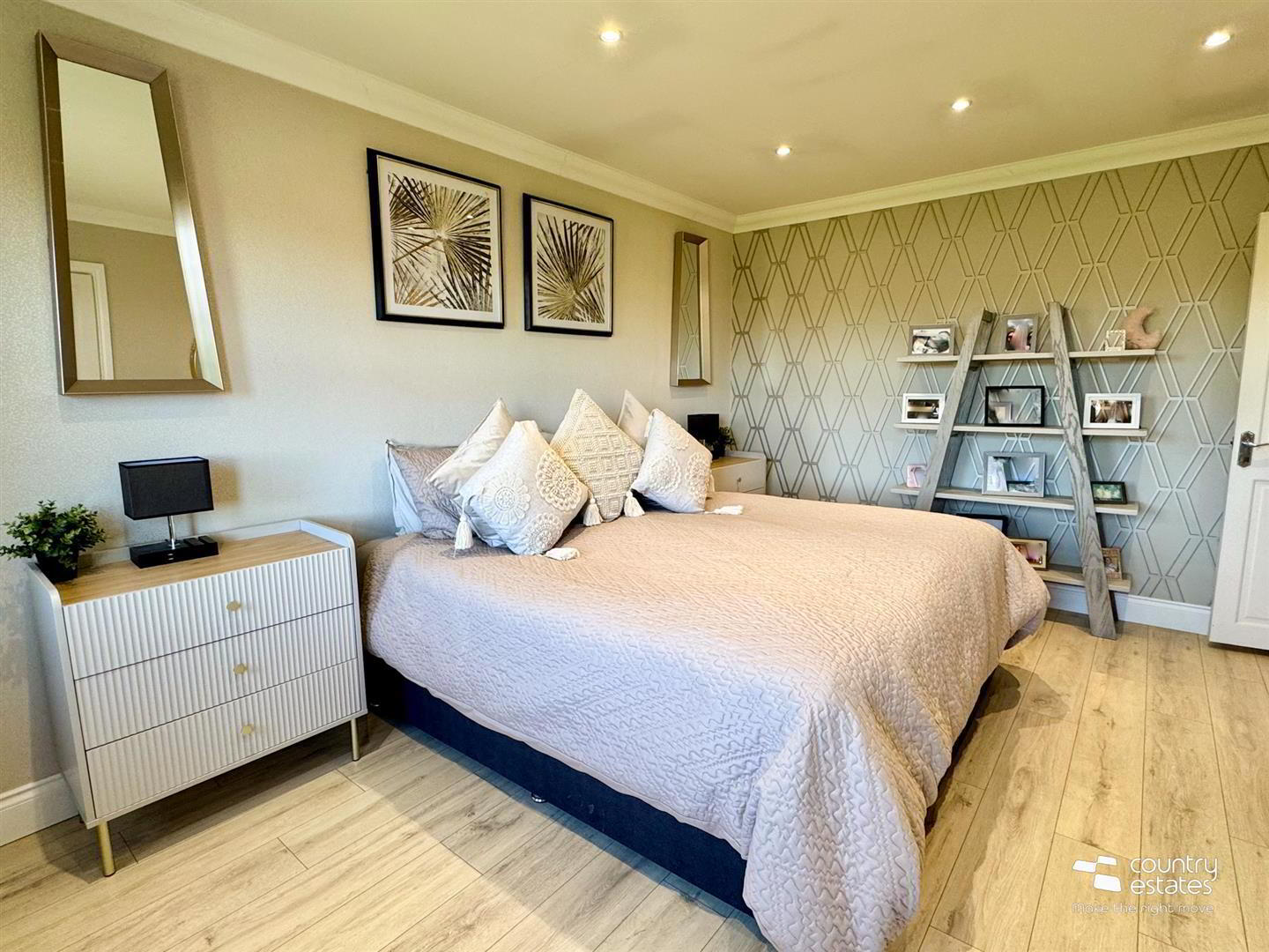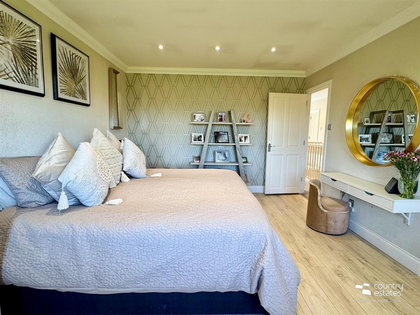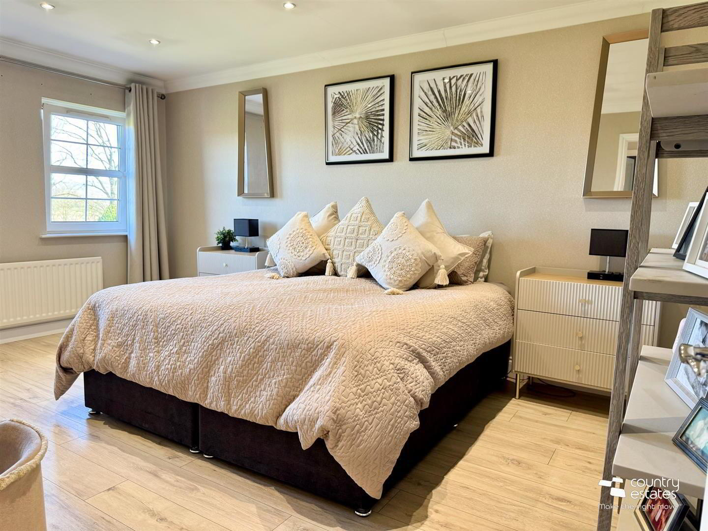 - Spacious principal bedroom featuring laminate flooring and low voltage recessed downlighting. The room enjoys pleasant rear-facing views over the gardens, extending across the surrounding open countryside, creating a comfortable and relaxing retreat.