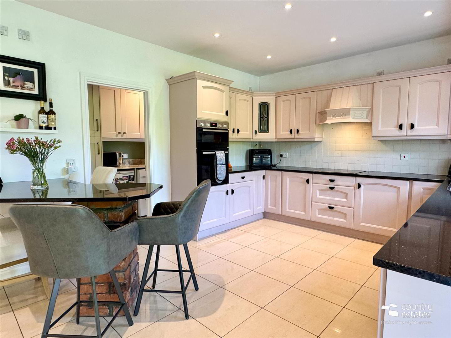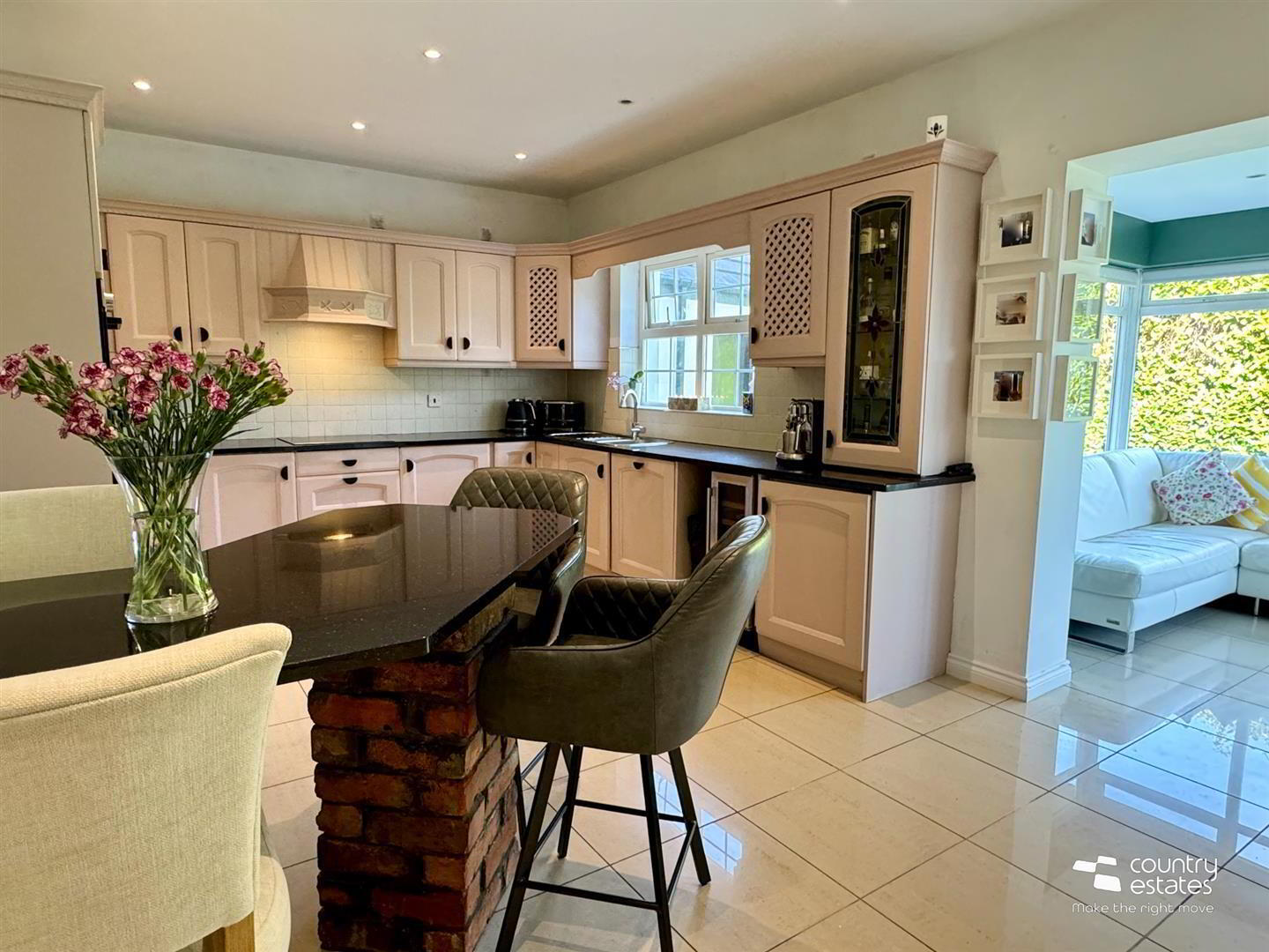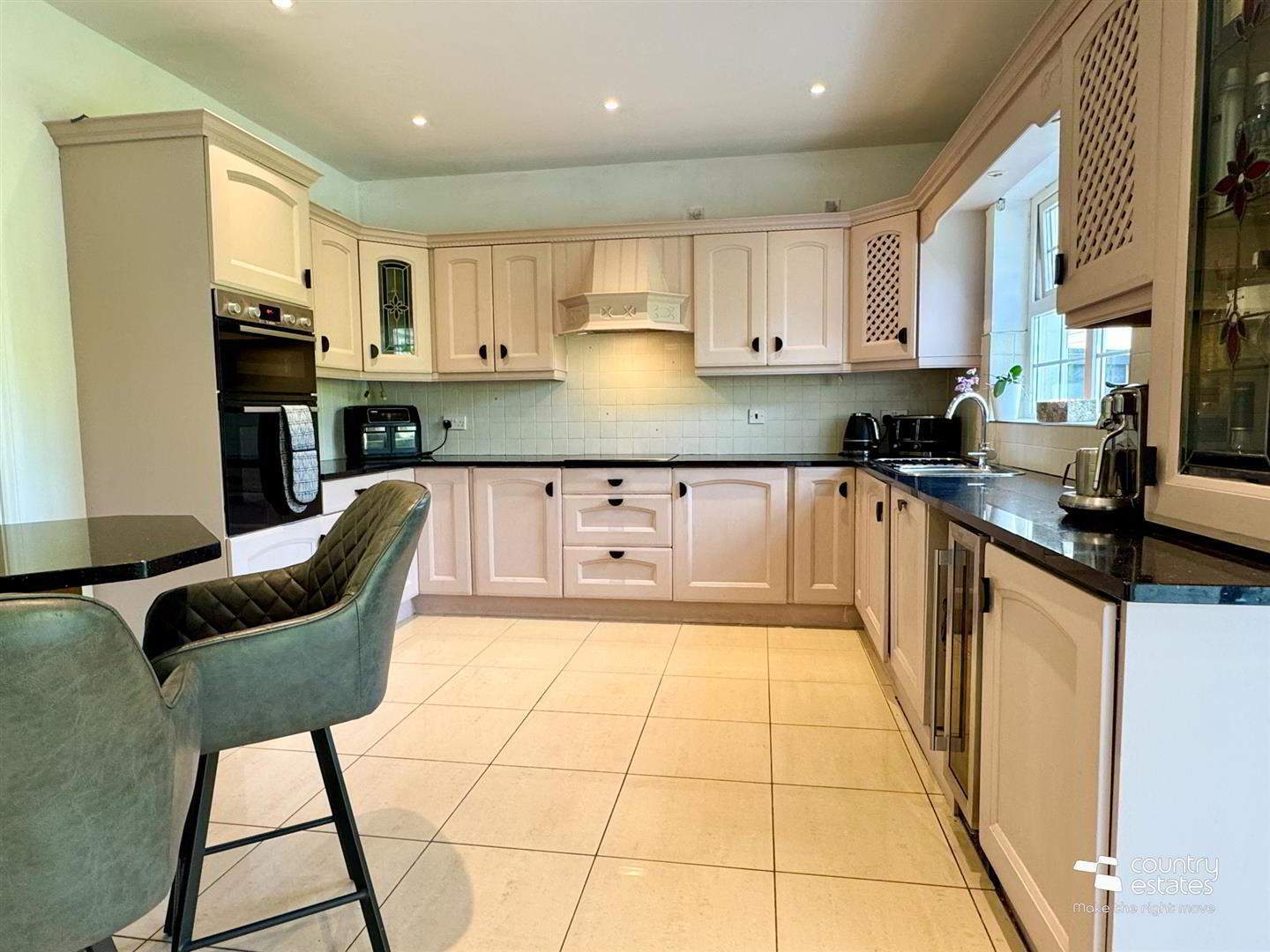 Additional integrated appliances include a dishwasher, wine cooler and under-counter fridge. Decorative leaded glass display cabinets and an over-window pelmet with low voltage downlighting enhance the overall finish. A standout feature is the reclaimed brick-built breakfast bar with dog-leg polished granite worktops, providing an ideal informal dining and entertaining space.