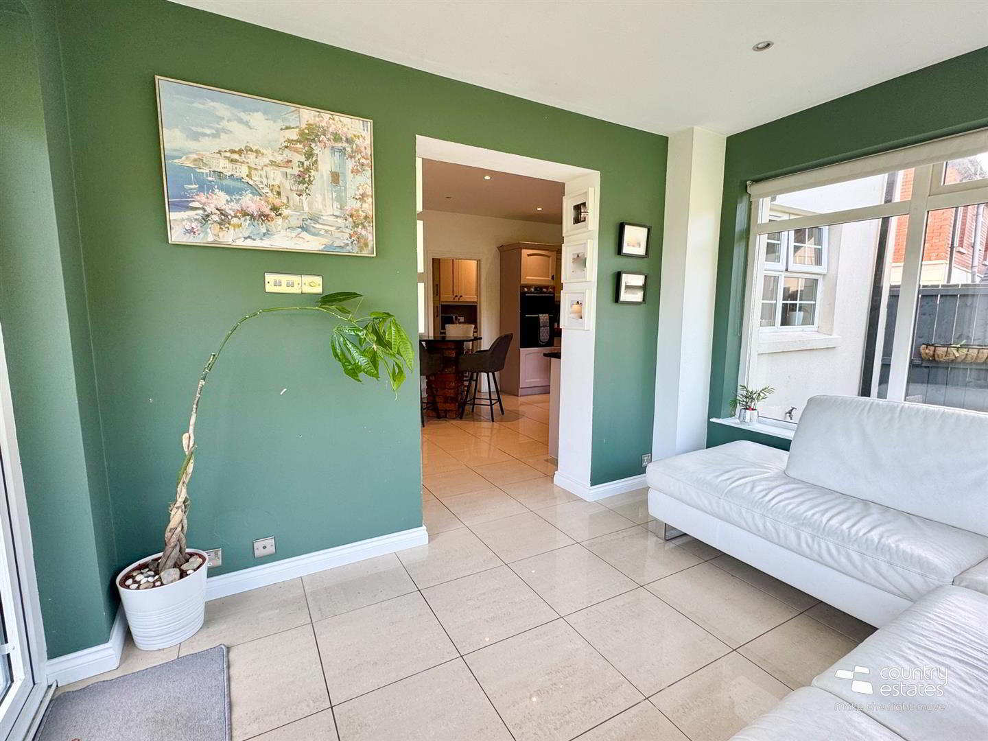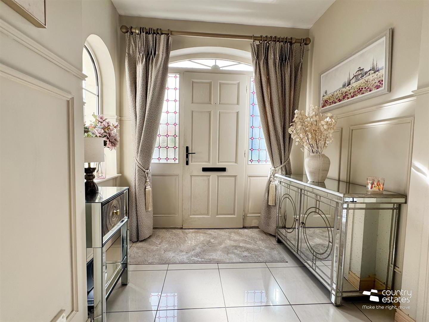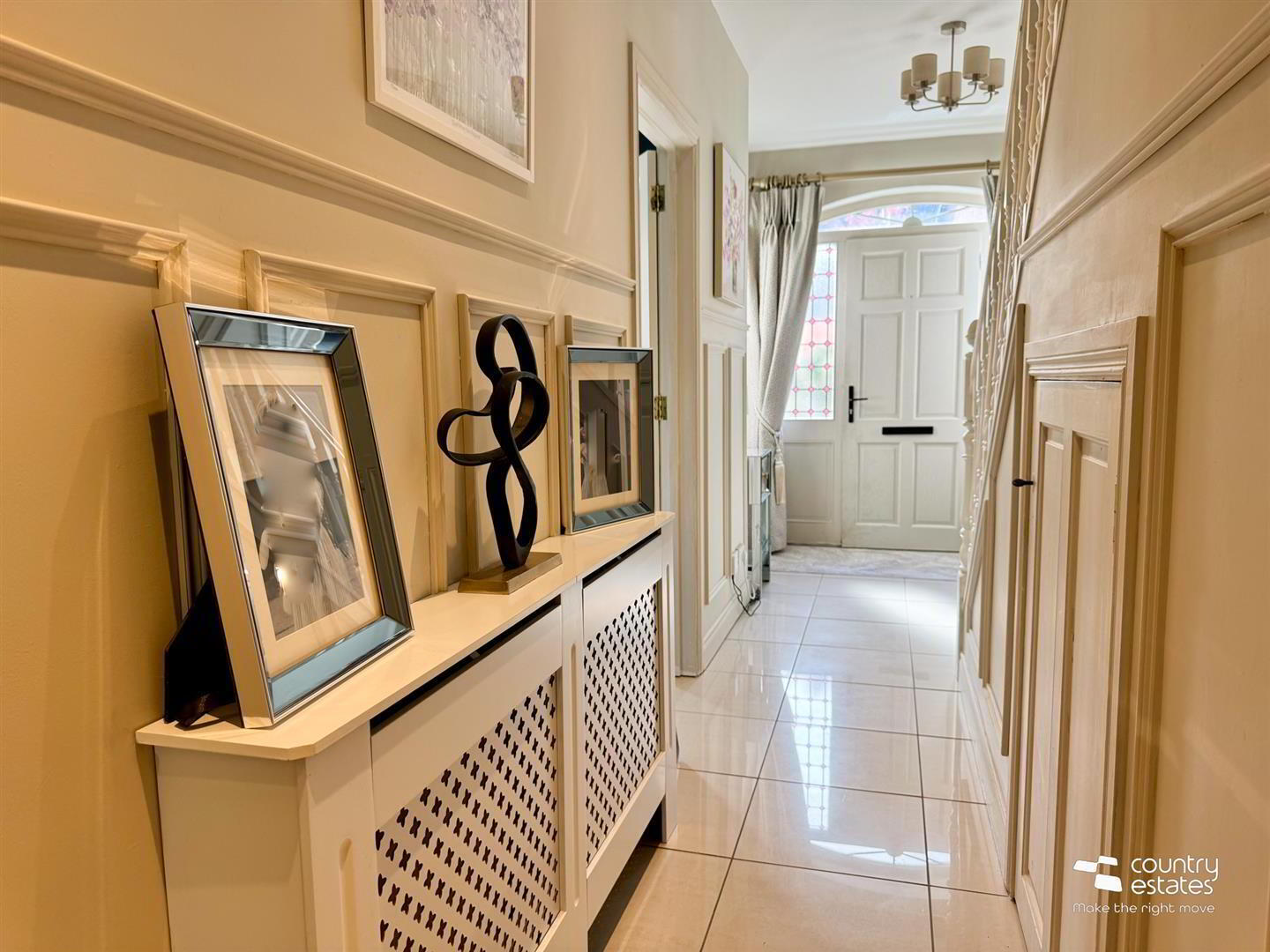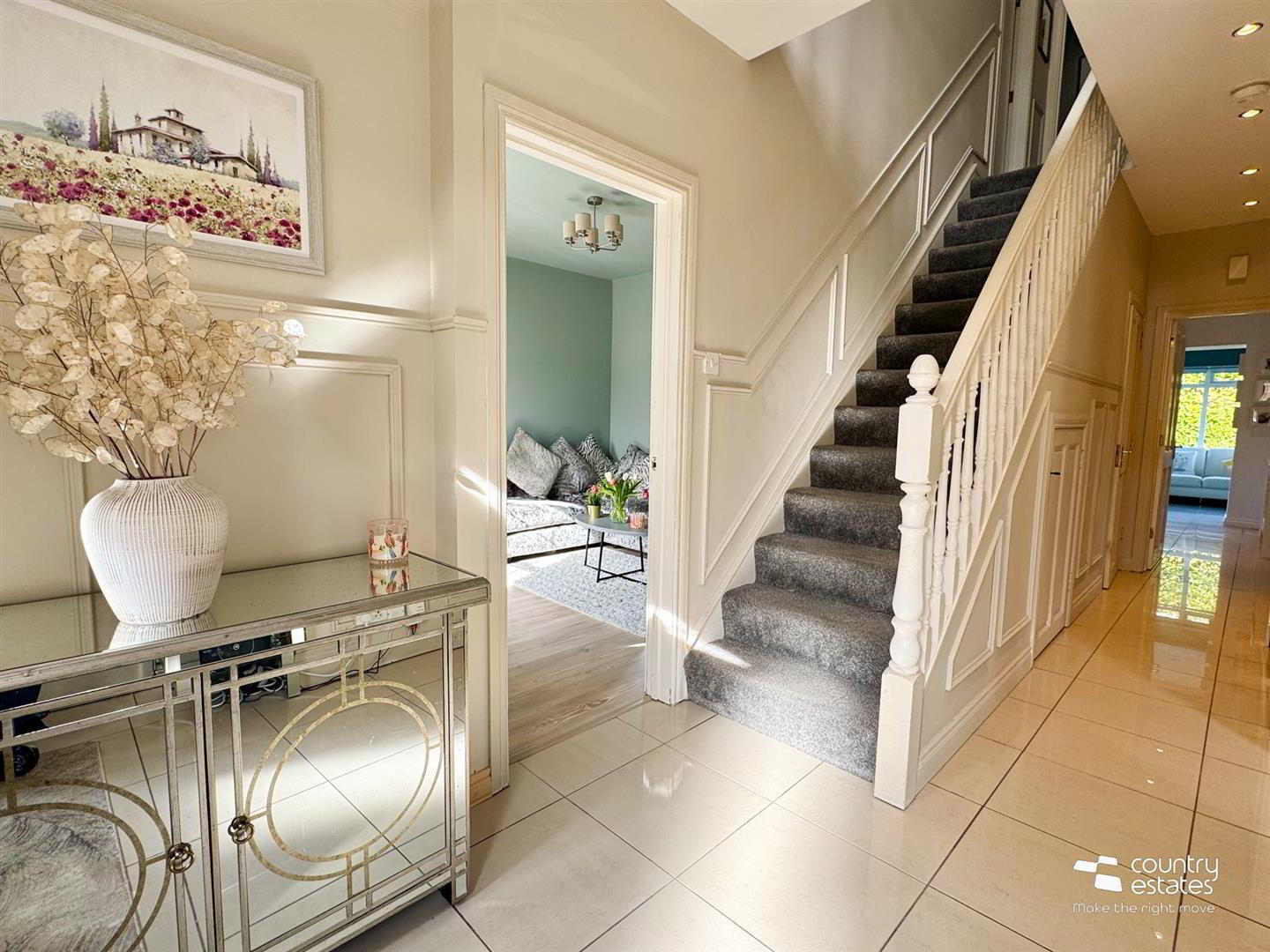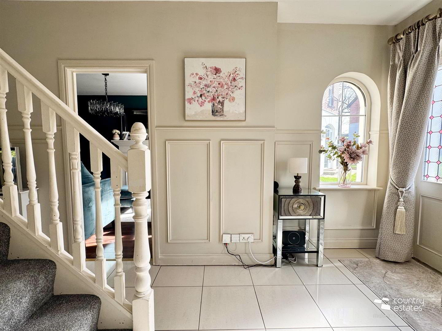- Welcoming and spacious entrance hall featuring a high-quality polished porcelain tiled floor, seamlessly extending through to the kitchen and sunroom. The space is enhanced by attractive half-height wainscoting with painted walls, complemented by low voltage recessed downlights. Staircase leading to the first floor and a useful understairs storage cupboard.