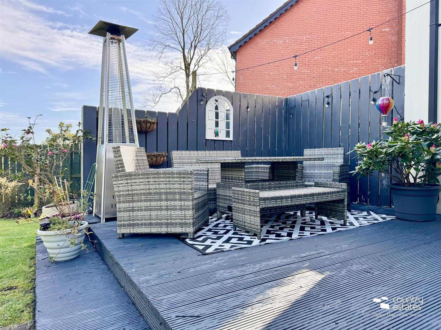 A spacious raised timber decked patio area creates a perfect setting for outdoor dining and entertaining, with a feature pathway connecting the different sections of the garden. In addition, a paved patio area offers further space for relaxing and enjoying the surroundings.