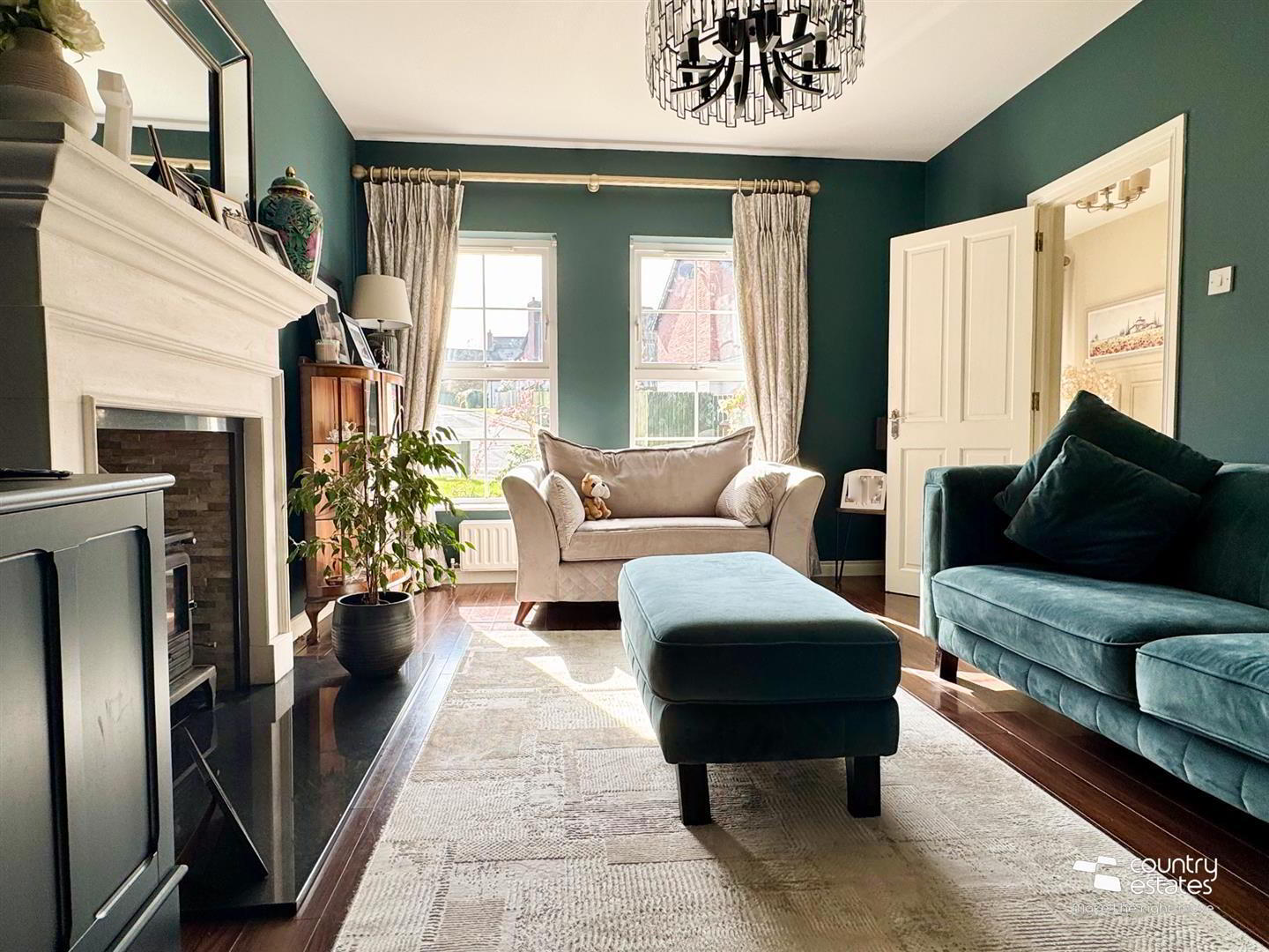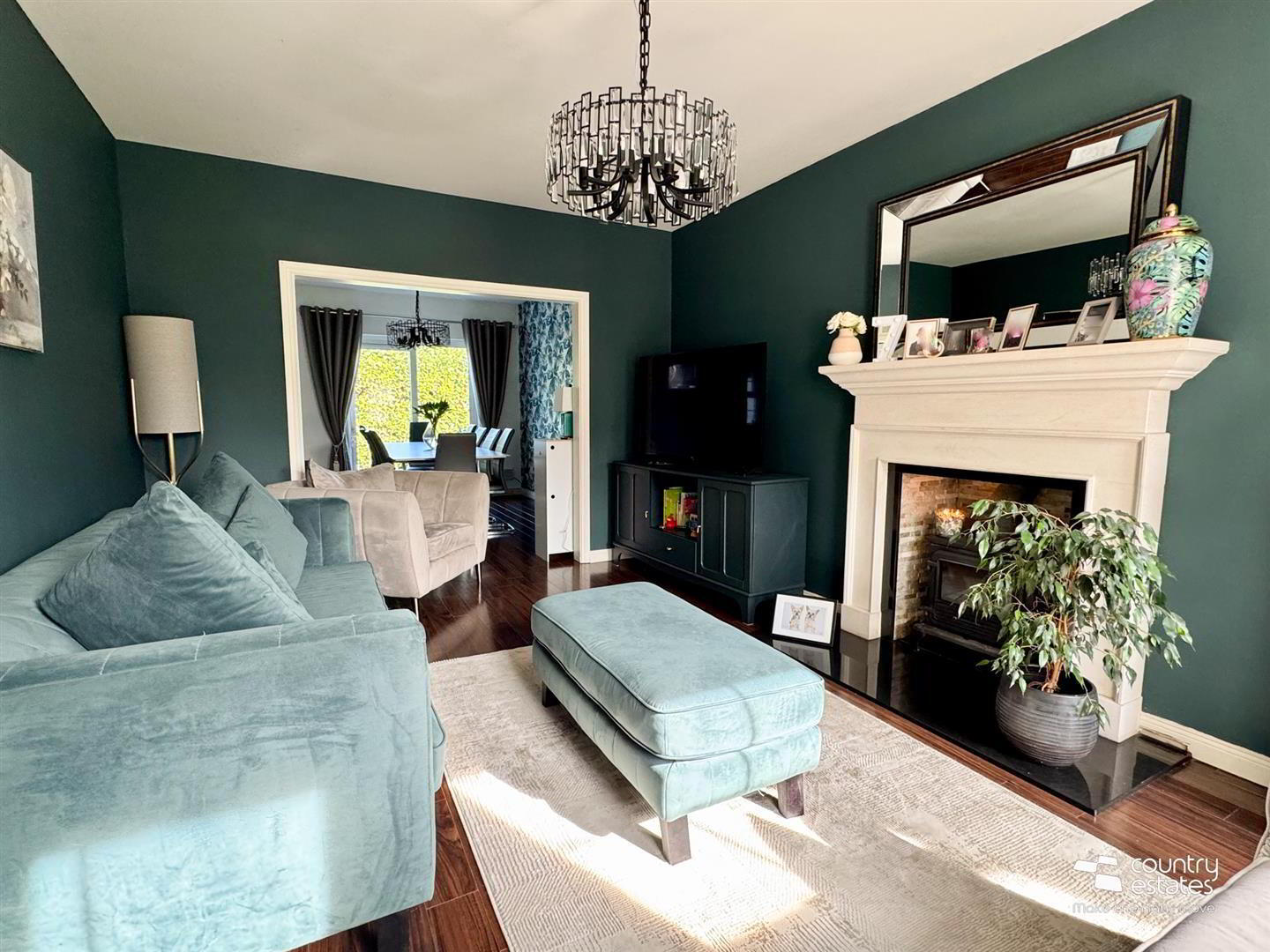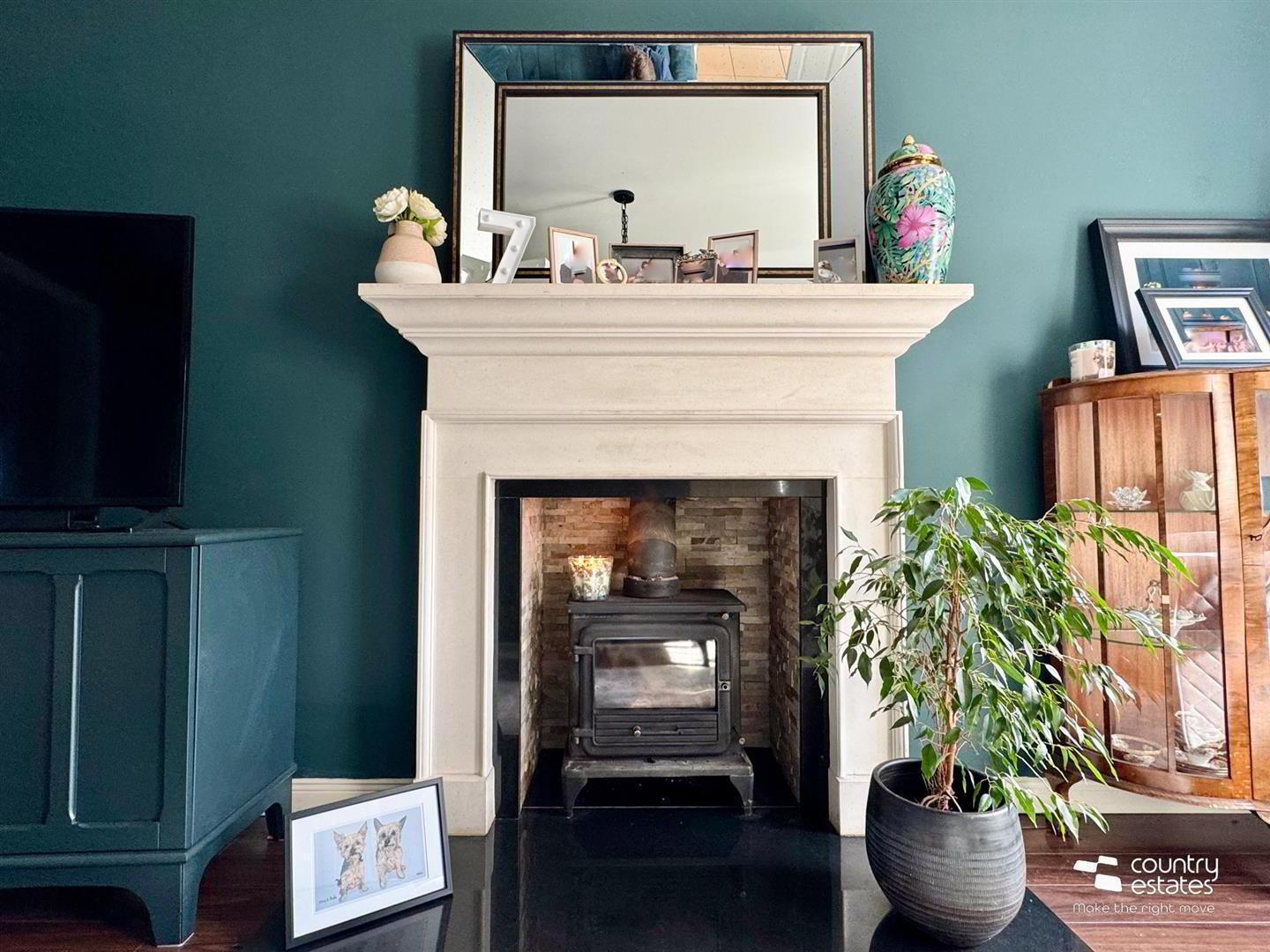- Elegant and inviting main reception room centred around a striking stone fireplace with cast iron wood-burning stove, set on a polished granite hearth. Twin front-facing windows provide excellent natural light, while walnut-effect flooring enhances the warmth of the space and flows seamlessly through an open square archway to:-