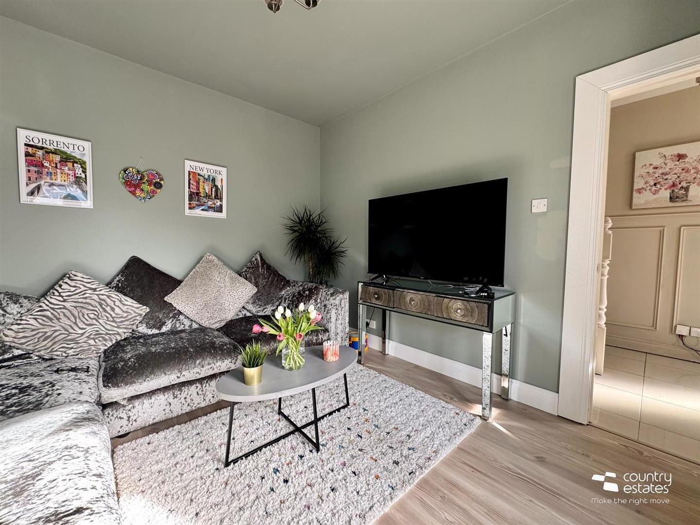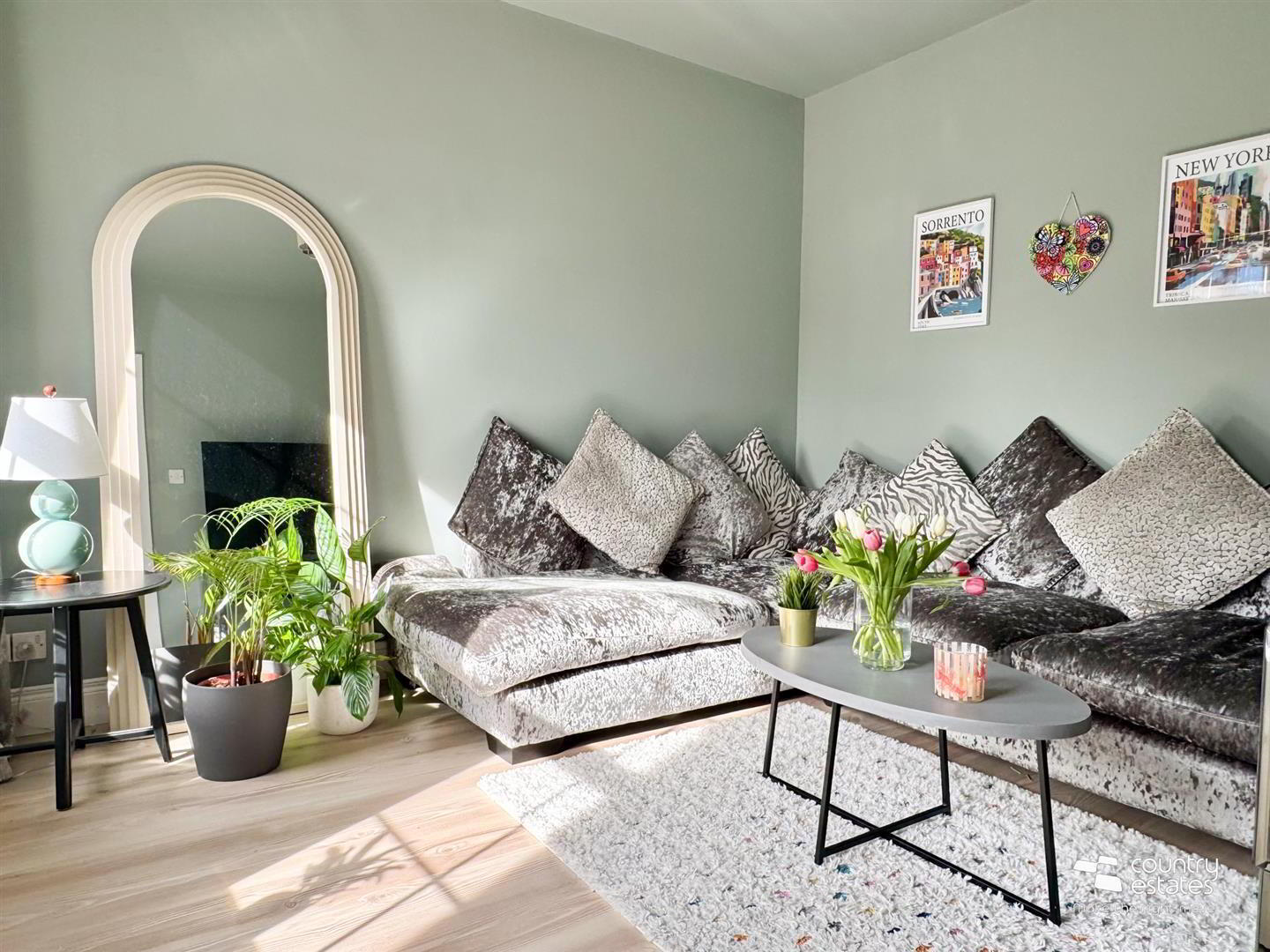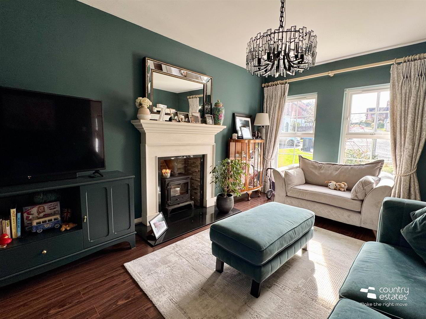 - Elegant and inviting main reception room centred around a striking stone fireplace with cast iron wood-burning stove, set on a polished granite hearth. Twin front-facing windows provide excellent natural light, while walnut-effect flooring enhances the warmth of the space and flows seamlessly through an open square archway to:-