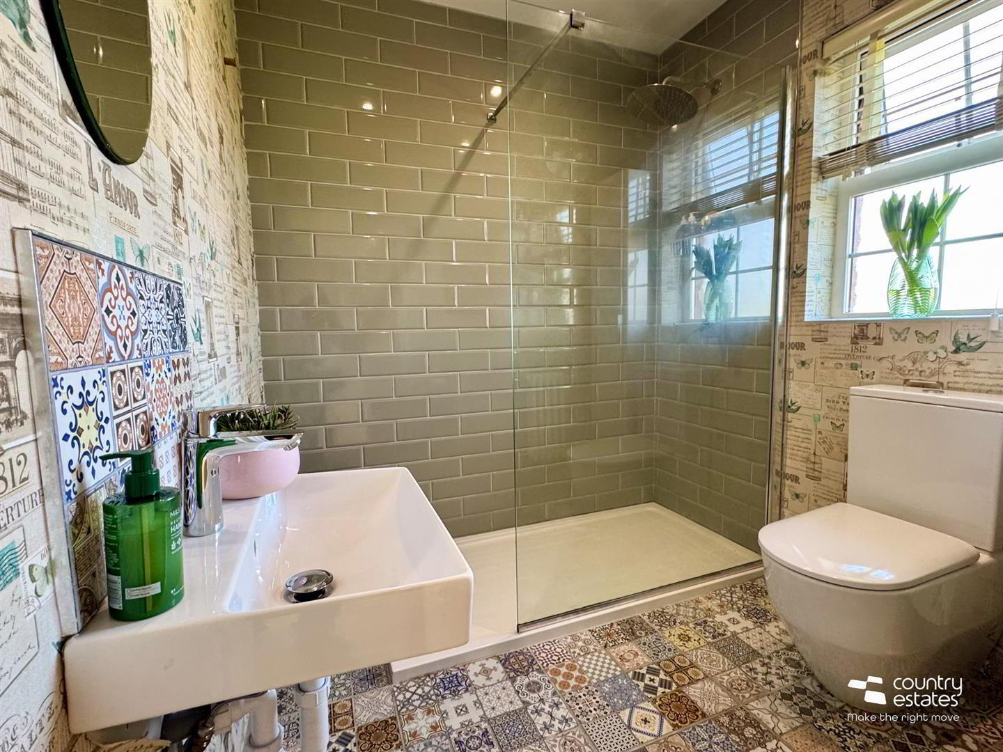 - Beautifully appointed modern ensuite comprising a Laufen Pro close-coupled WC and a Roca Ona wall-hung floating wash hand basin, finished with a Hansgrohe mixer tap. A generous shower enclosure with large tray, open wetroom-style screen and drench shower head provides a contemporary feel.
