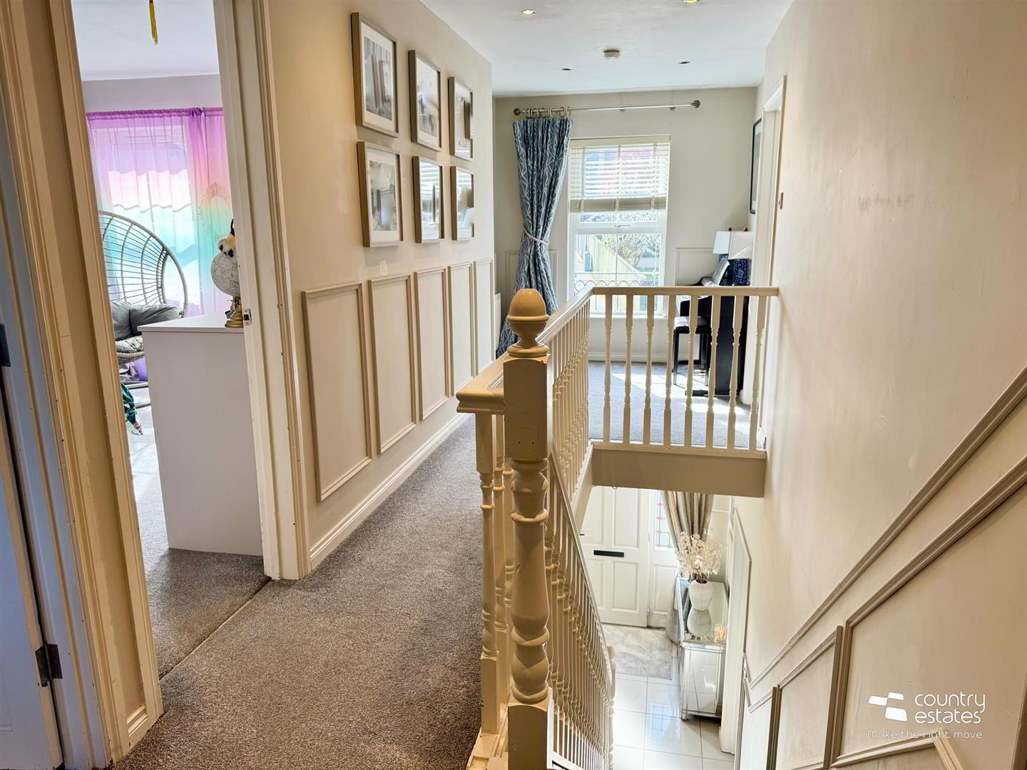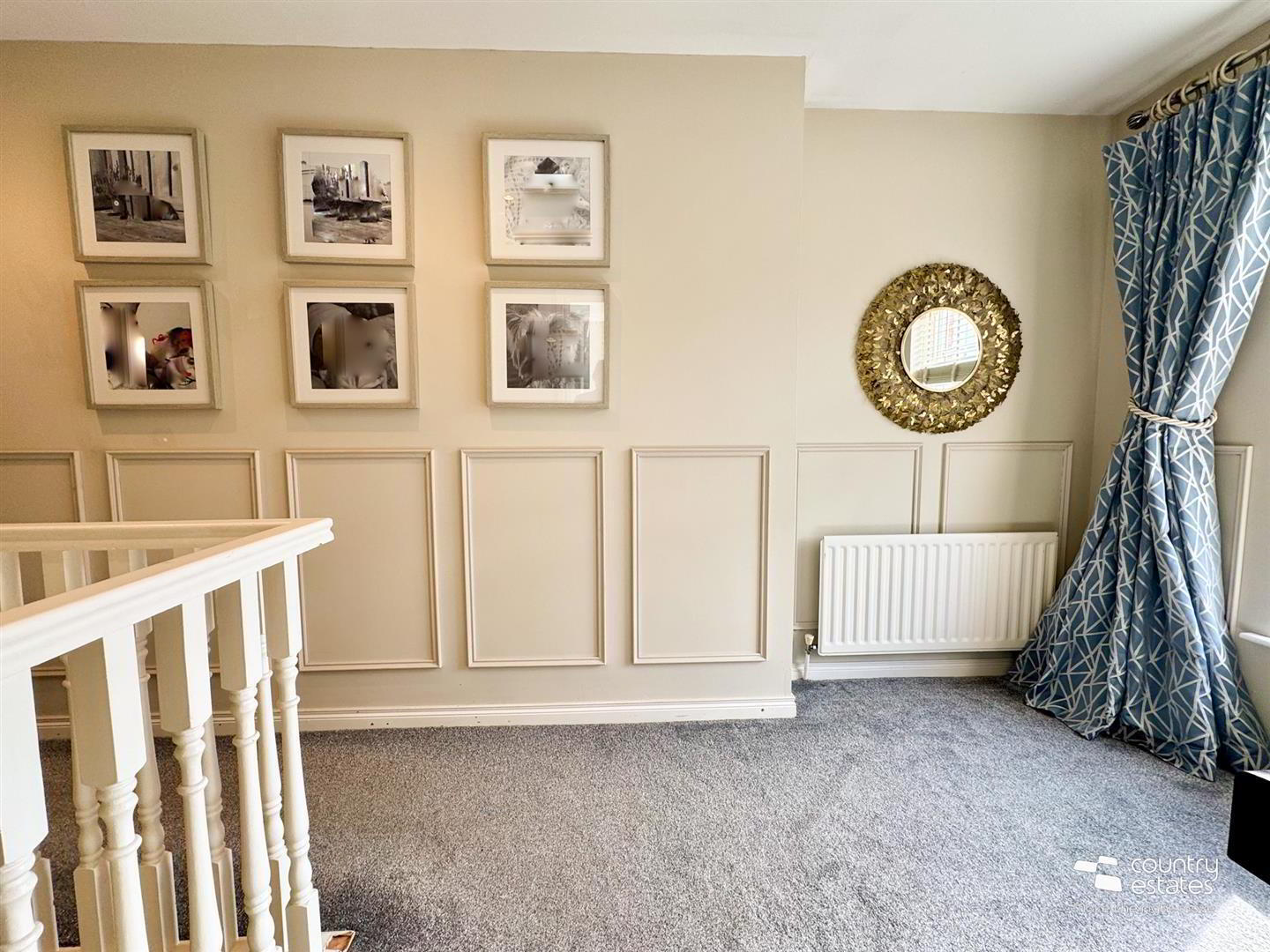 - Spacious gallery-style landing with a designated area ideal for an open study or reading space. Finished with feature half-height painted panelled walls and low voltage recessed downlighting. Access to roofspace.