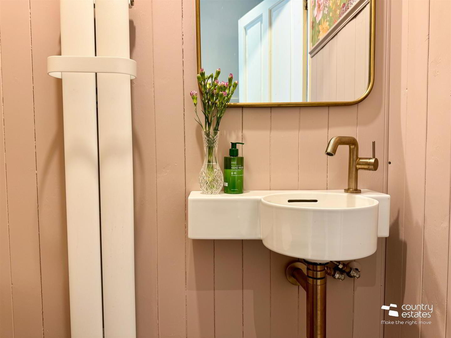 - Stylish, contemporary cloakroom fitted with a bespoke Utopia Roseberry storage unit incorporating a floor-mounted WC and wall-hung Laufen wash hand basin, complemented by a premium Hansgrohe brushed bronze mixer tap. Finished with half-height painted tongue and groove panelling and feature wallpaper above, creating a refined and elegant space.