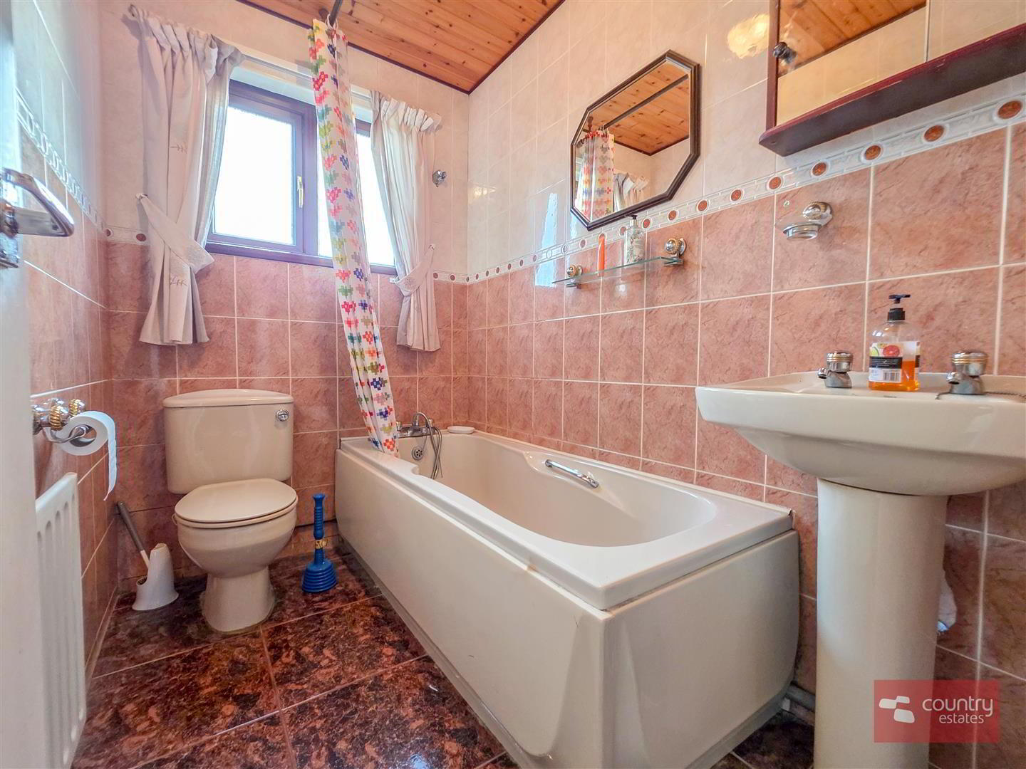 - Comprising Panel bath with Hand shower attachment, pedestal wash hand basin, and a button flush WC. Tiled walls. Tiled Floor. Panelled ceiling.