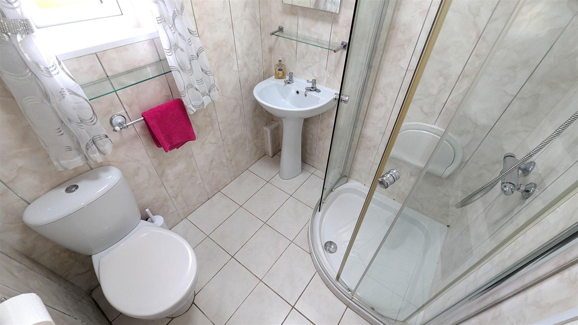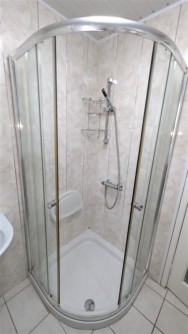 - Modern white suite comprising an enclosed corner shower with panelling glazed sliding door. Pedestal wash hand basin with stainless steel hot and cold tap. Low flush push button WC. Fully tiled floor. PVC panelled walls. Single radiator.