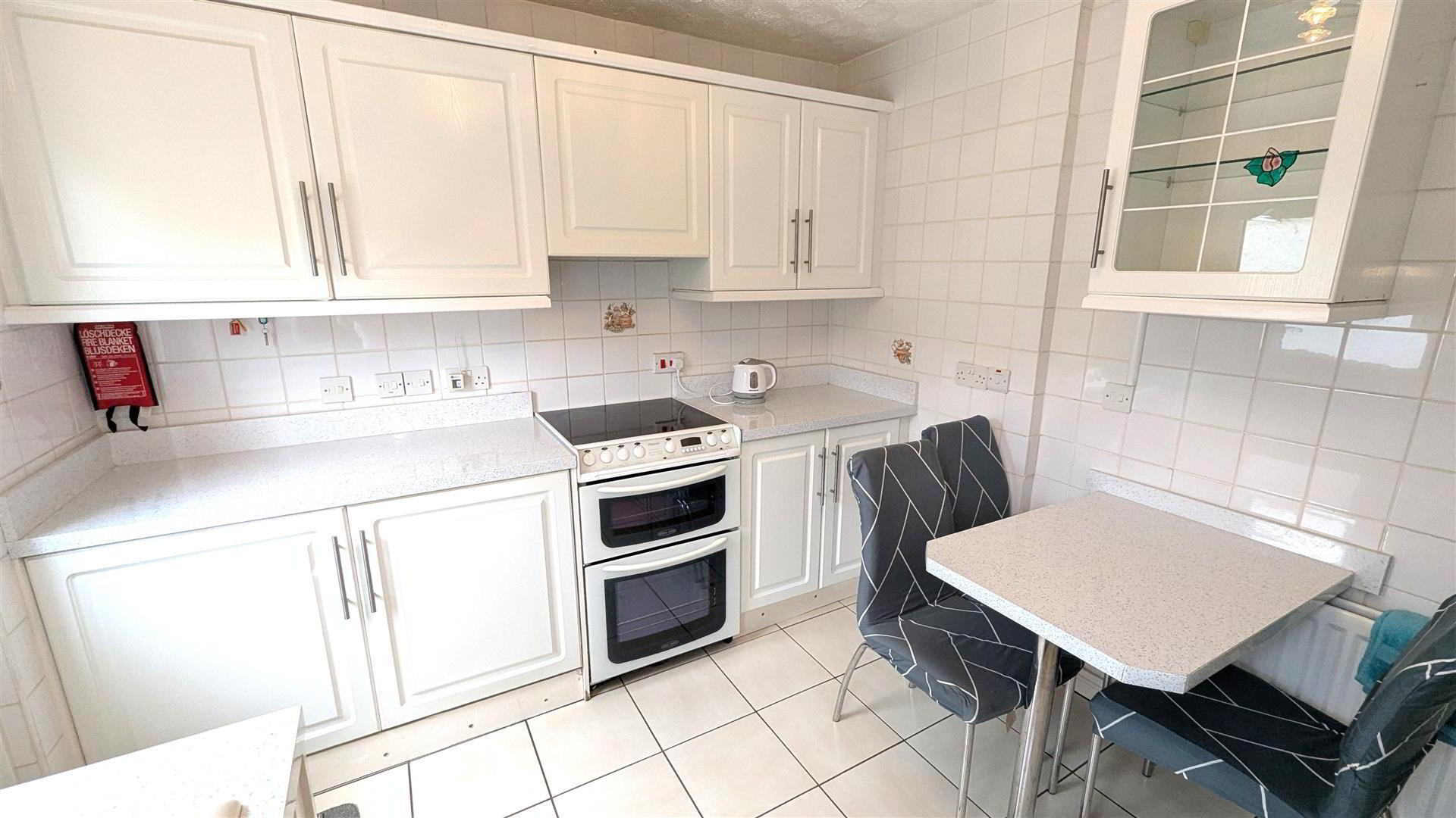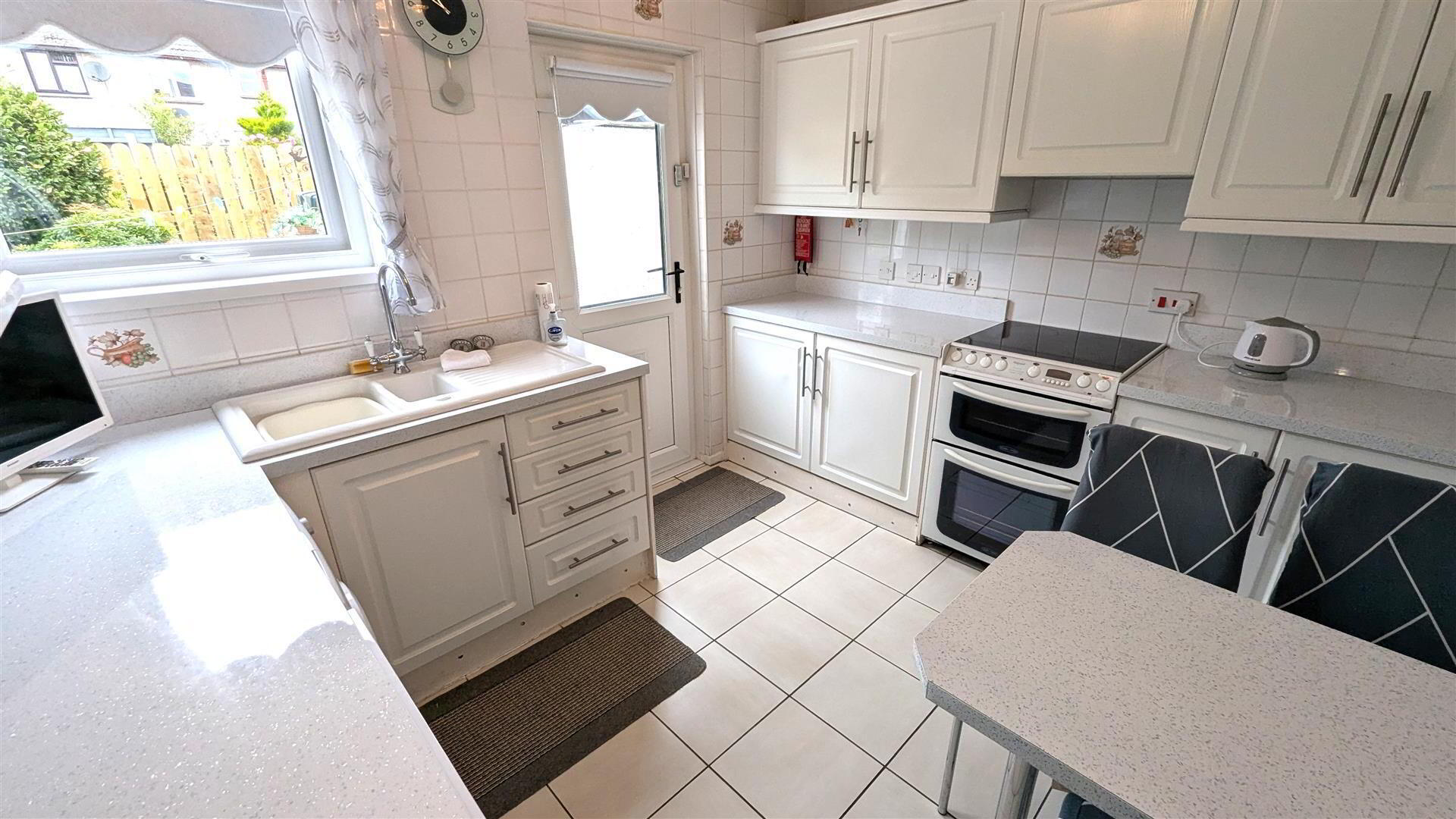- Full range of white high and low level kitchen units with white "sparkle grain" work tops, complimentary splash back tiling and short chrome handles. One and a quarter bowl ceramic sink unit with "Victorian" style chrome mixer tap. Integrated low level fridge and freezer. Space for cooker with hooded over head extractor fan. Space for washing machine and dish washer. Fully tiled floor. Double radiator. PVC double glazed door to rear.