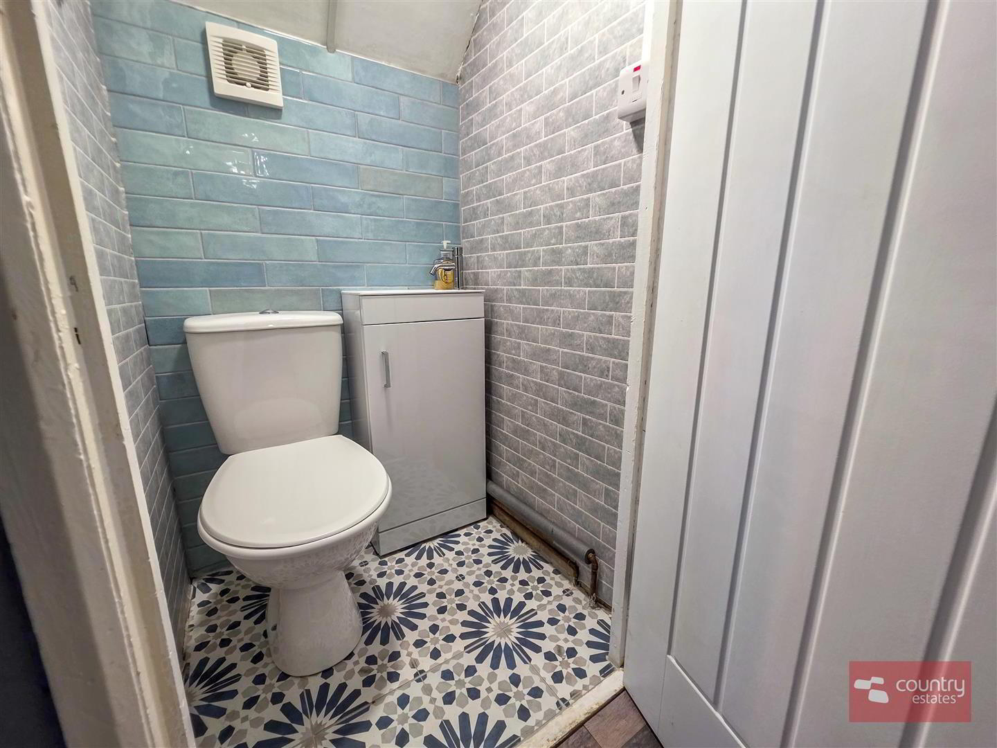 - Comprising vanity wash hand basin with monobloc tap and a button flush WC. Part tiled walls. Tiled floor.