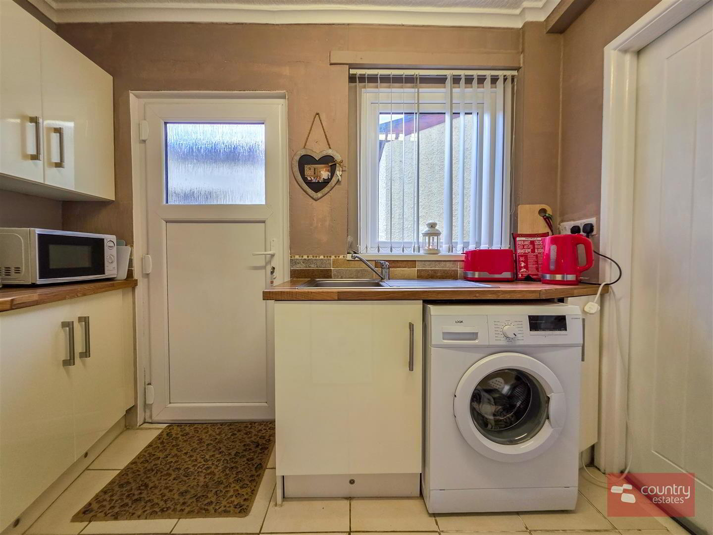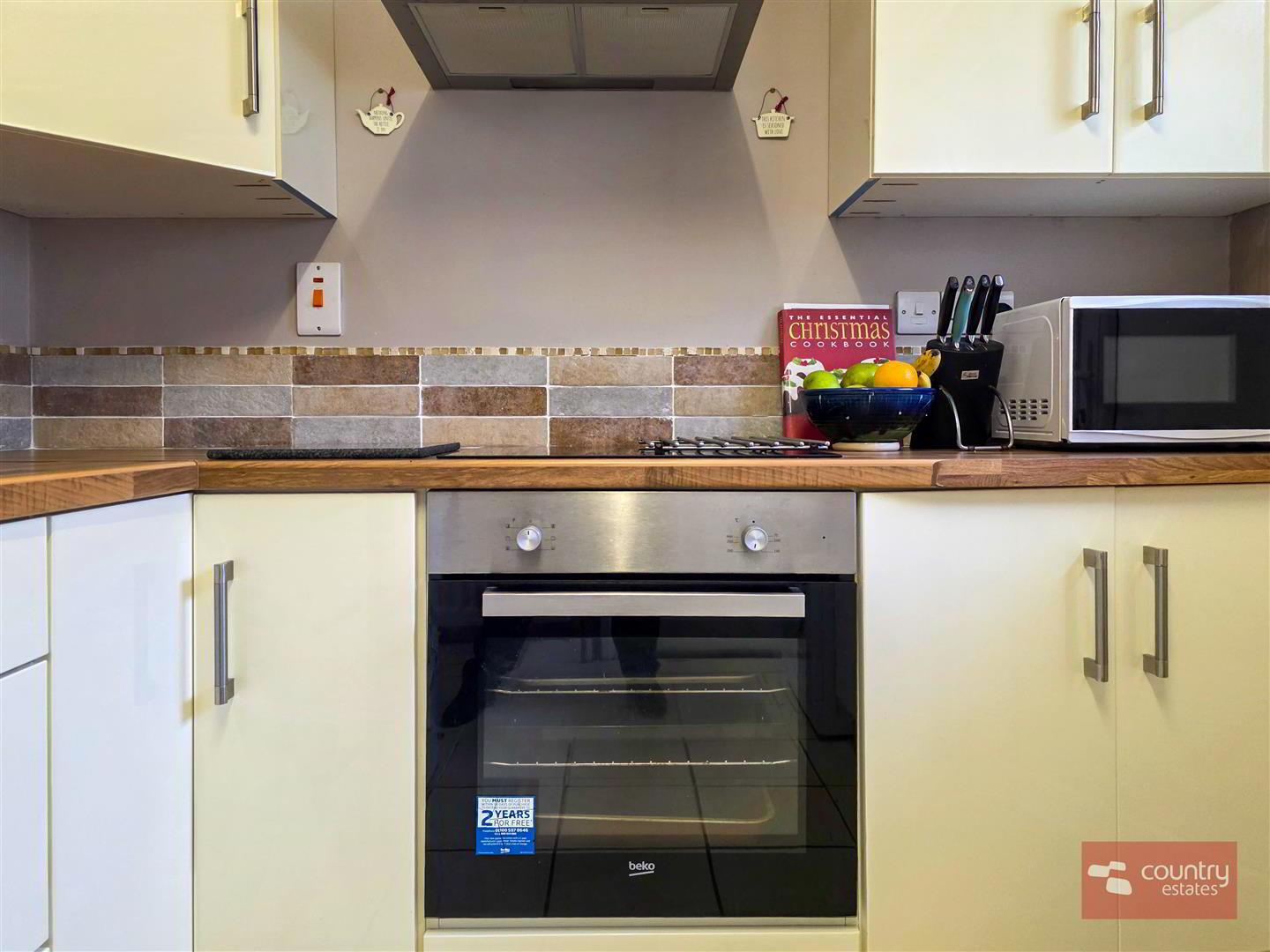 - Equipped with a range of high and low level gloss fitted units with contrasting butcher block effect work surfaces. Single drainer stainless steel sink unit. Integrated oven with separate four ring electric hob and overhead extractor fan housed in stainless steel canopy. Plumbed for washing machine. Space for free standing under counter fridge. Part tiled walls. Tiled floor. PVC double glazed door to rear.