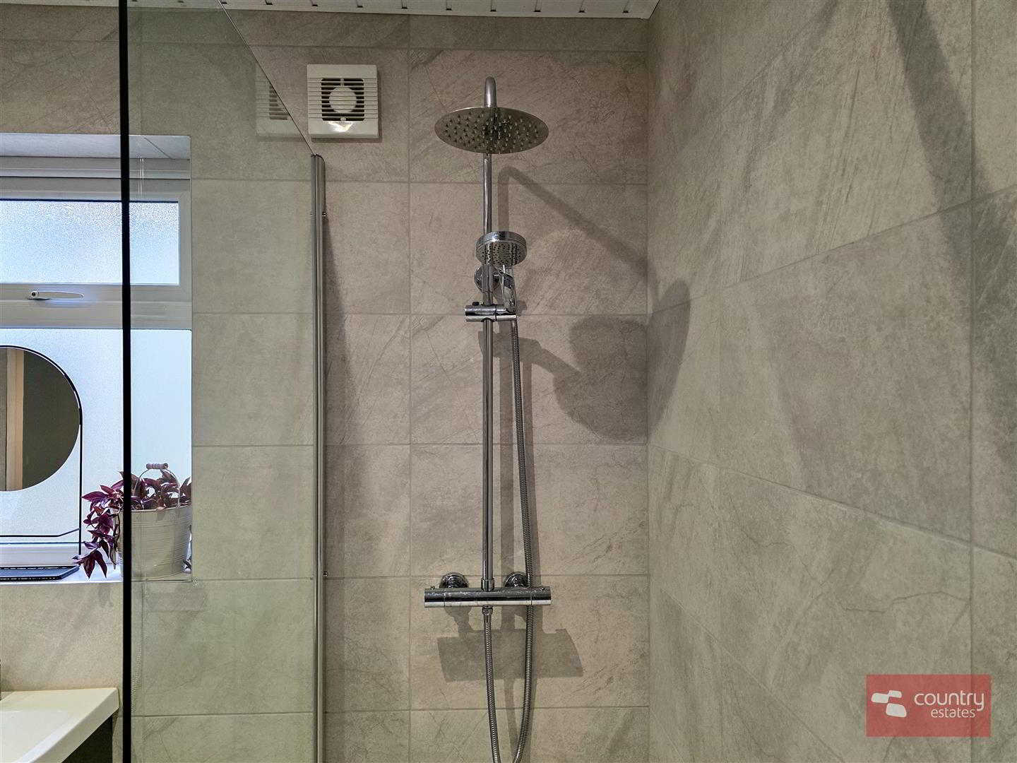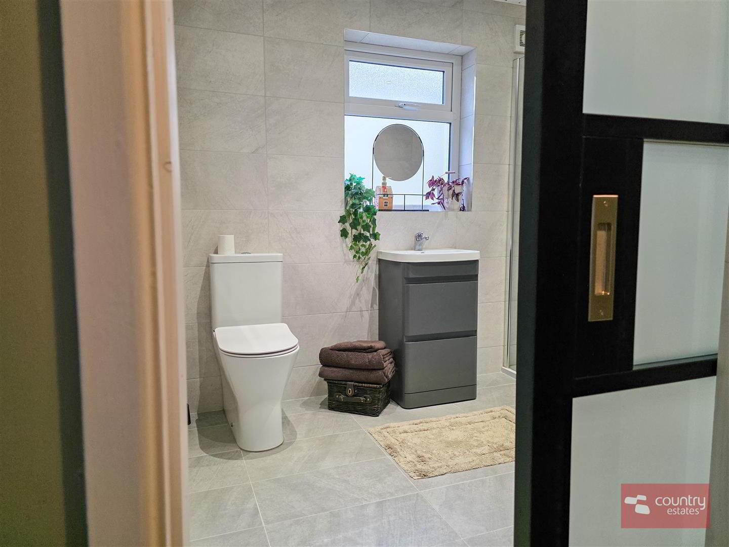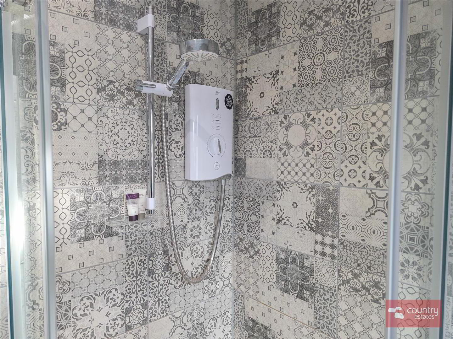 - Comprising walk in shower cubicle with thermostatically controlled drench style shower and hand shower attachment, vanity wash hand basin with monobloc tap and a button flush WC. Fully tiled. Chrome towel radiator. PVC panelled ceiling with recessed downlighting. Built to allow for wheelchair accessibility.