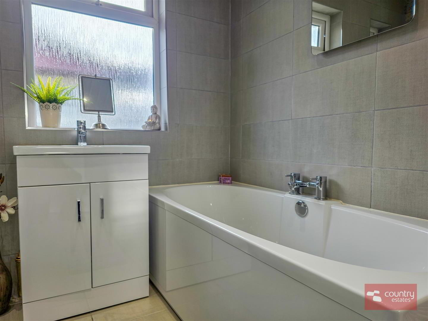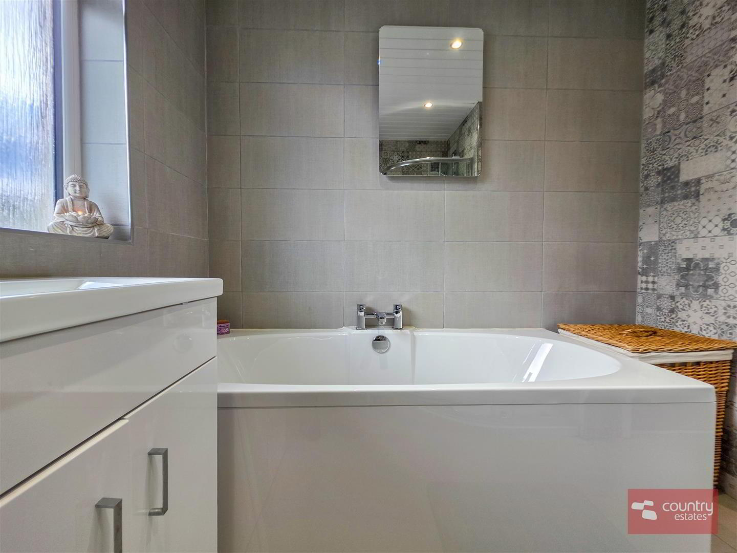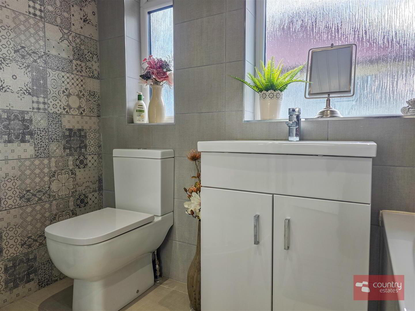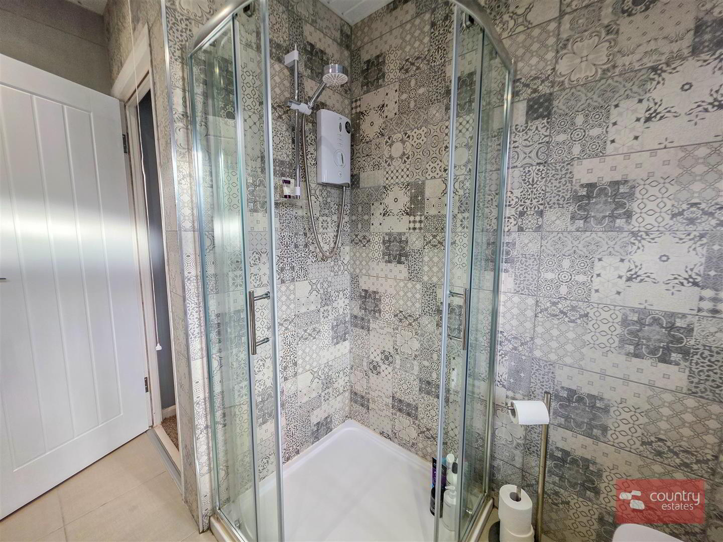 - Comprising double ended panel bath, quadrant shower cubicle with electric shower unit, vanity wash hand basin with monobloc tap and a button flush WC. Part tiled walls. Tiled floor. PVC panelled ceiling. Chrome towel radiator.