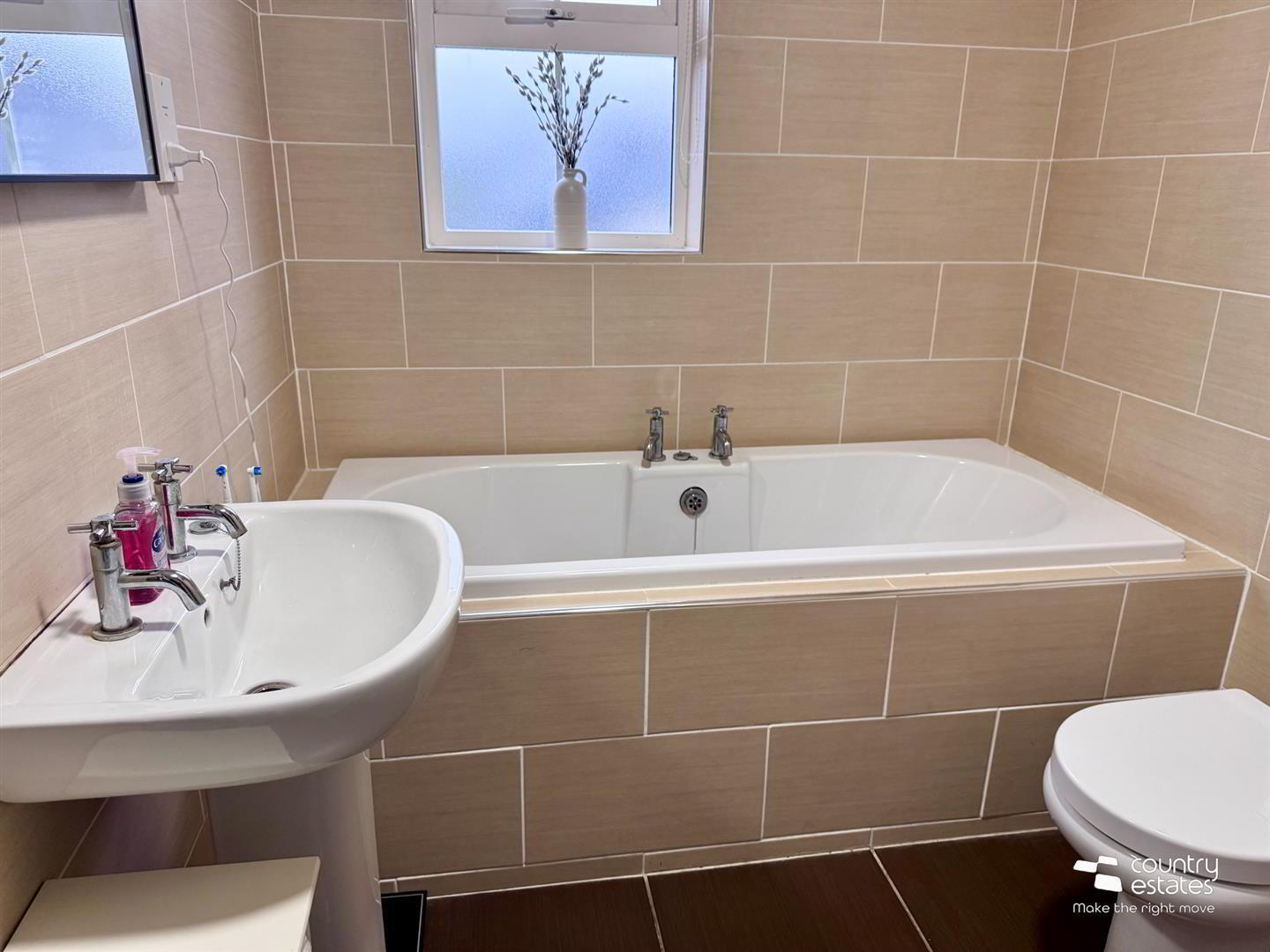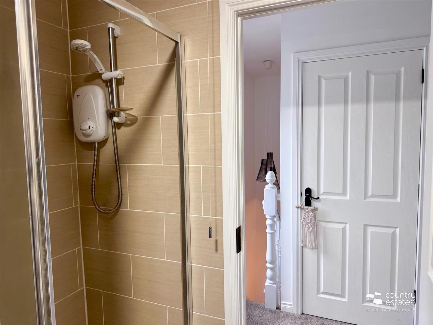 - Modern 4 piece suite comprising fully tiled bath and separate shower cubicle with power shower over and sliding screen door, button flush w.c. and pedestal wash hand basin. Chrome heated towel rail. Shaver point. Ceramic tiled floor. Fully tiled walls.