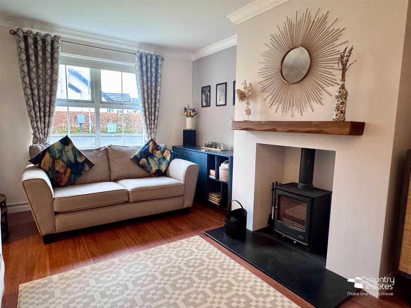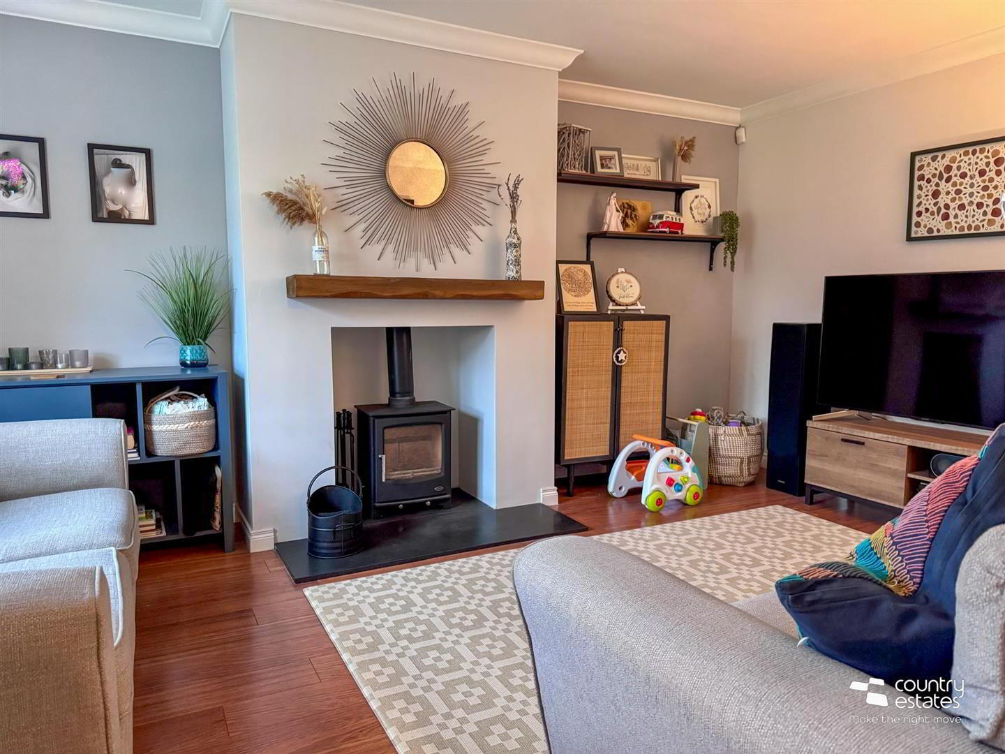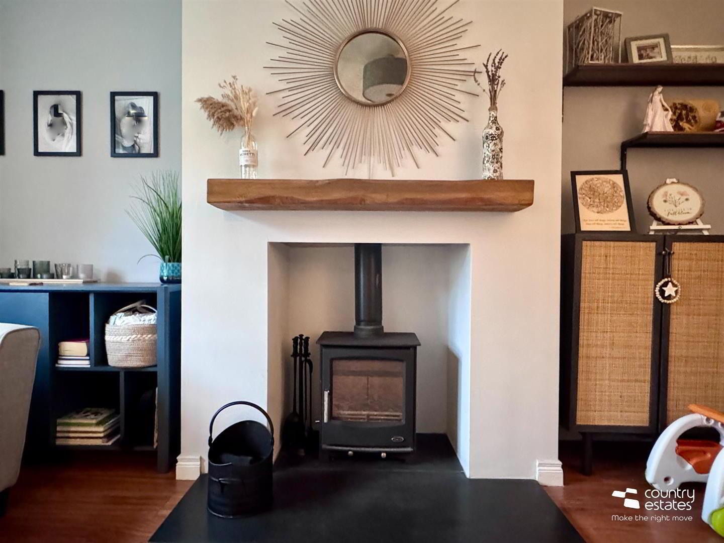 - Attractive Inglenook style fireplace with inset multi fuel cast iron stove on slate hearth and rustic wooden mantle. Laminate flooring. Ceiling cornicing.