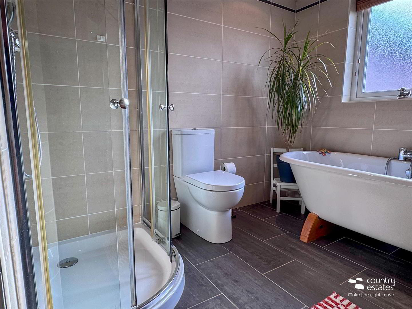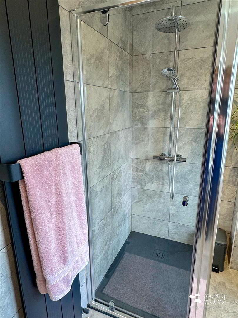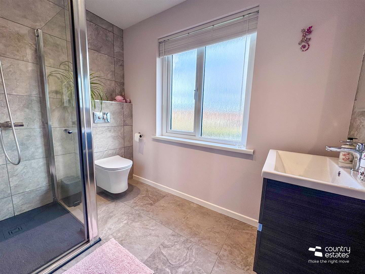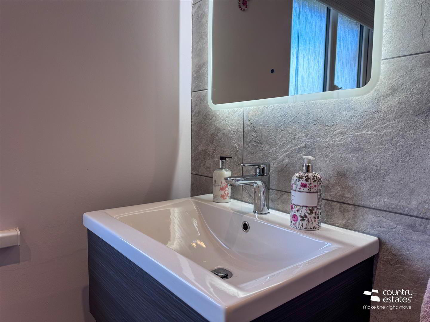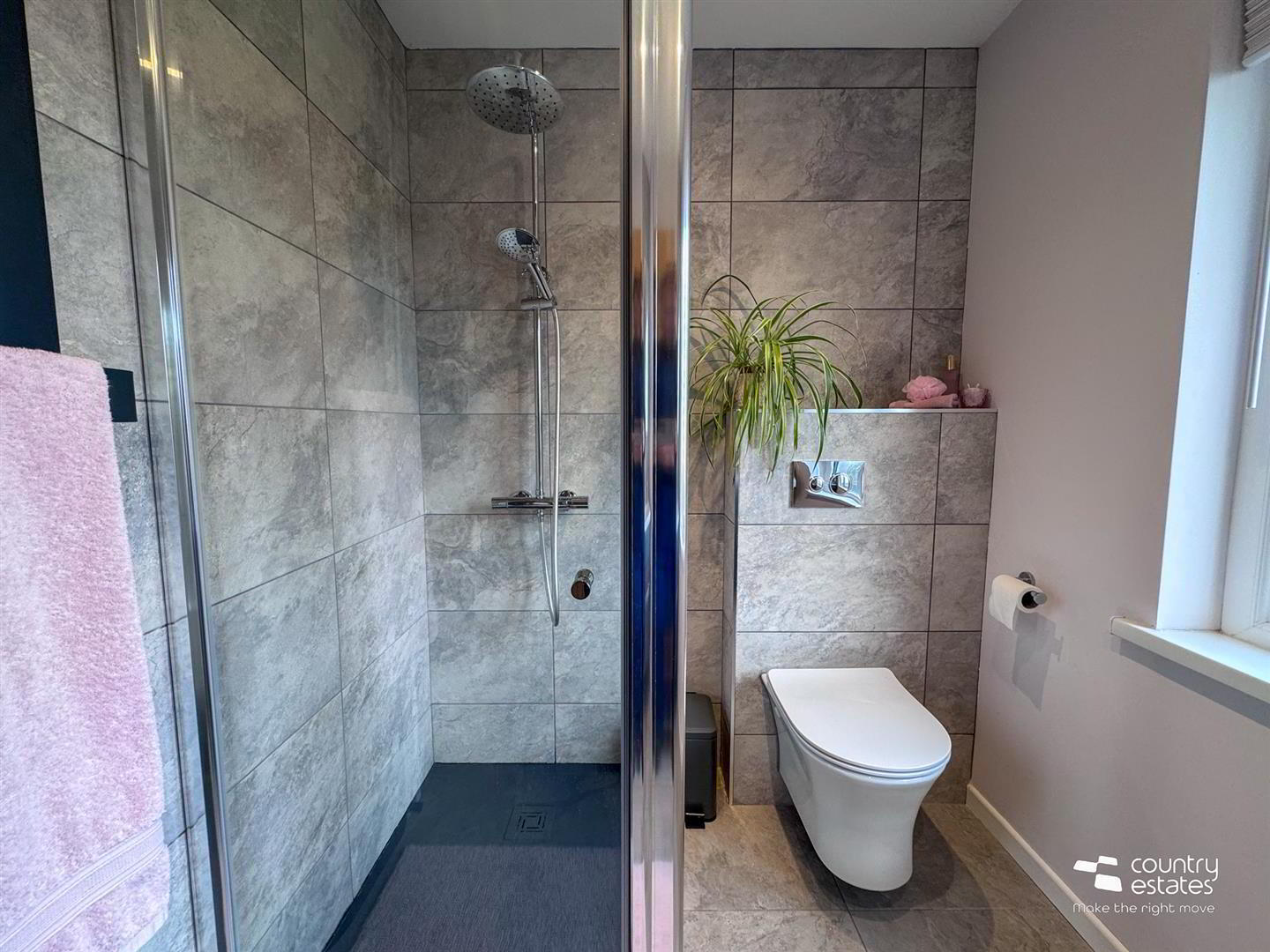 - Modern recently installed suite comprising wall push w.c, fully tiled shower enclosure with drench style shower and hand shower attachment and modern floating vanity unit with monobloc tap. Tiled accent wall with fitted LED mirror. Tiled floor.