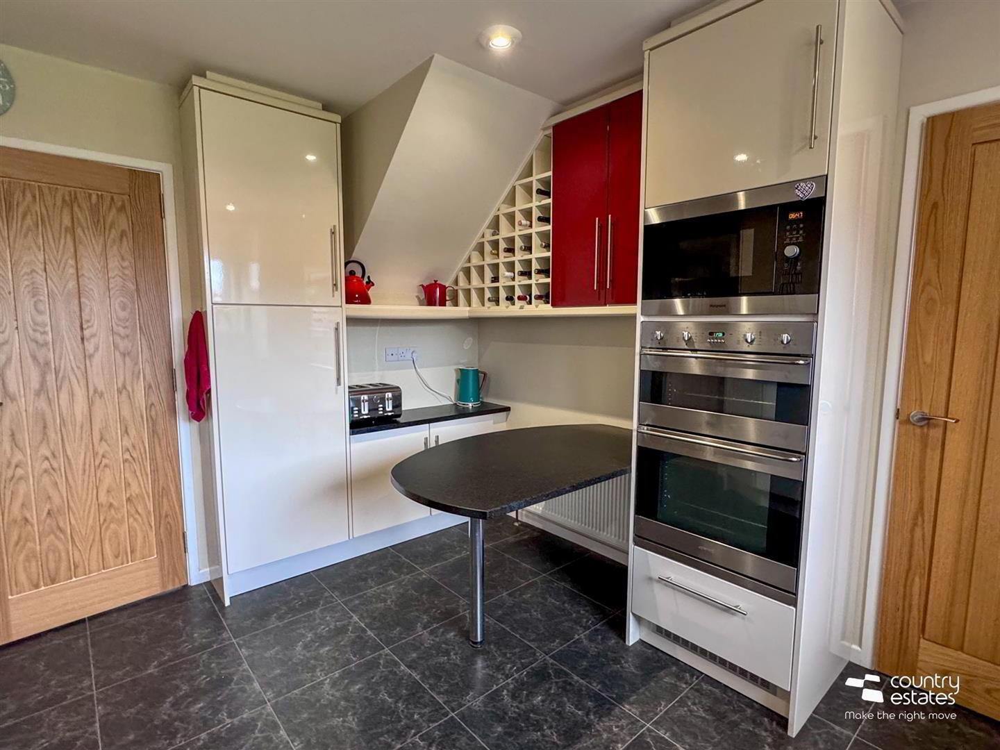 - Modern kitchen equipped with a comprehensive range of high and low level gloss fitted units in contrasting colours and quality worksurfaces with matching upstands. Inlaid FRANKE stainless steel one and half bowl sink unit with swan neck mixer tap. Integrated ceramic 4 ring hob with overhead extractor fan housed in stainless steel chimney and glass hood. Integrated double eye level oven and microwave oven. Integrated fridge freezer and dishwasher. Tiled floor. Fitted breakfast bar table for casual dining. Built in wine rack. Frosted glass corner cabinet. Tiled floor.