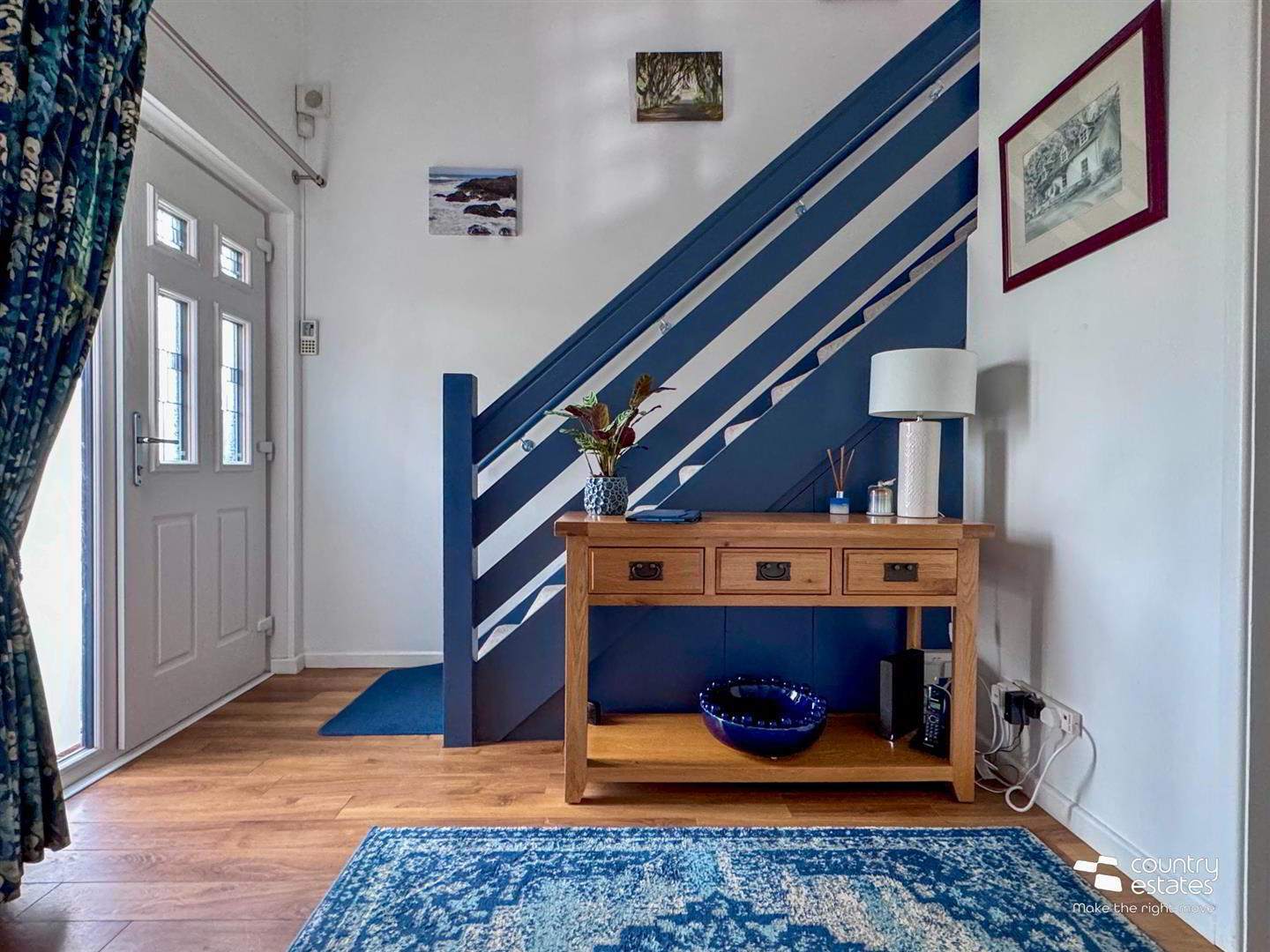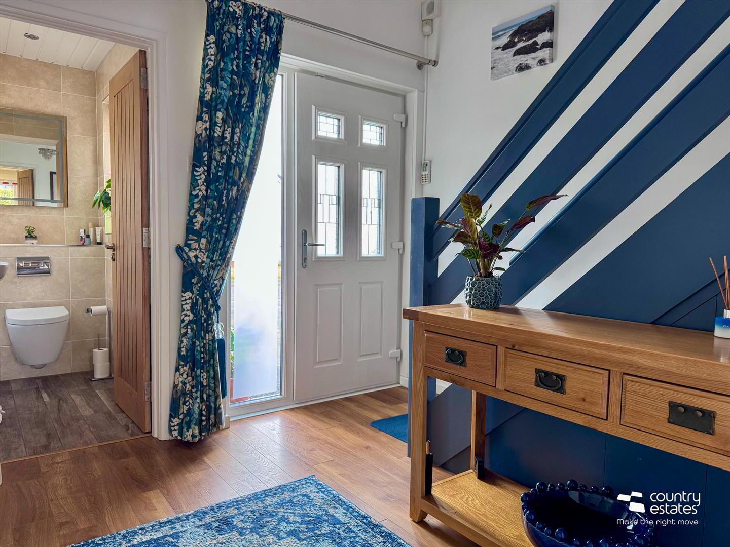 - Composite double glazed front door with matching full height PVC double glazed side screen. Stairwell to first floor. Access to bespoke fitted understairs storage bays. Quality Oak laminate plank flooring.