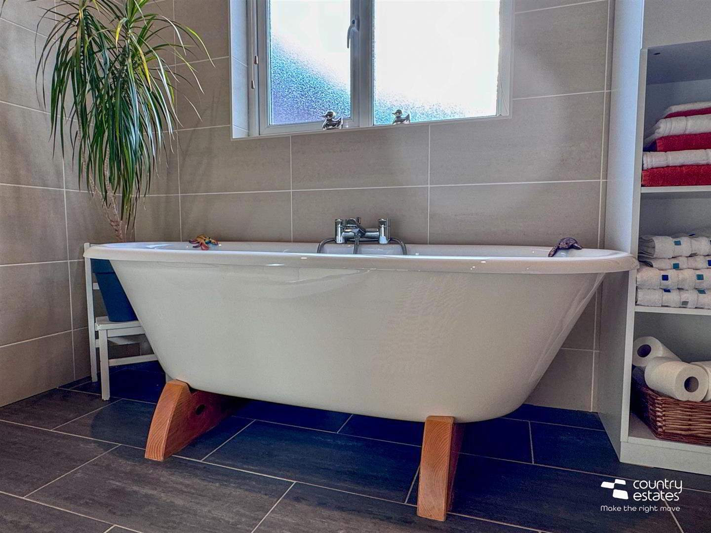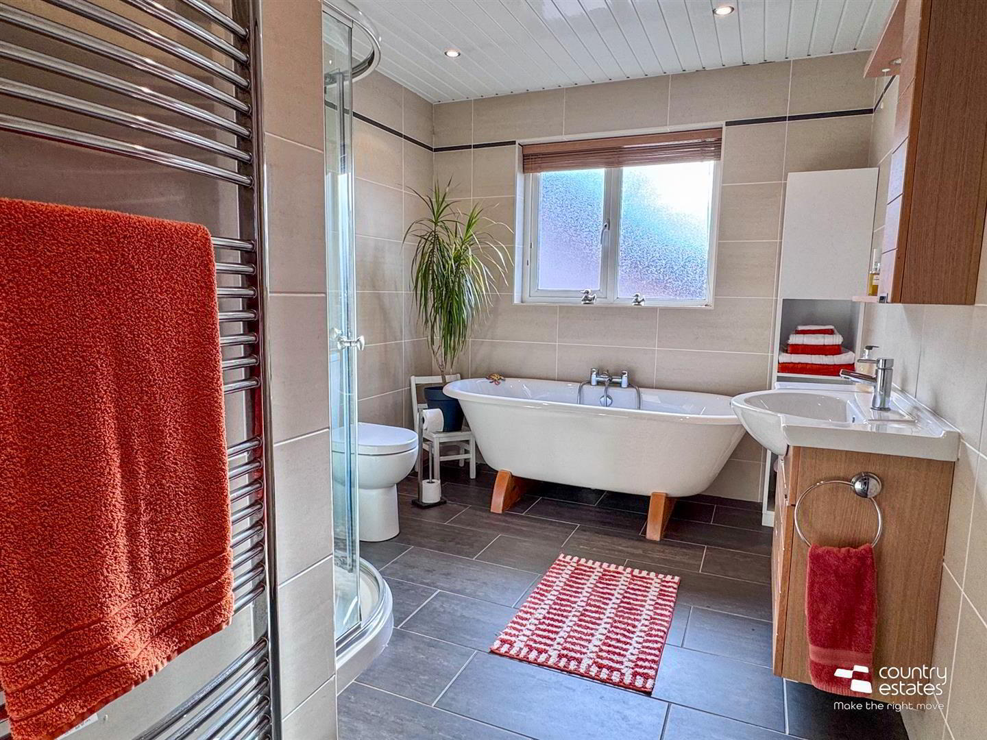 - Contemporary white four piece suite comprising modern freestanding roll top bath, separate quarter rounded shower enclosure, floating vanity unit with monobloc tap and matching fitted storage unit with fixed mirror and button flush w.c. Thermostatically controlled mains shower unit. Chrome towel radiator. PVC panelled ceiling.