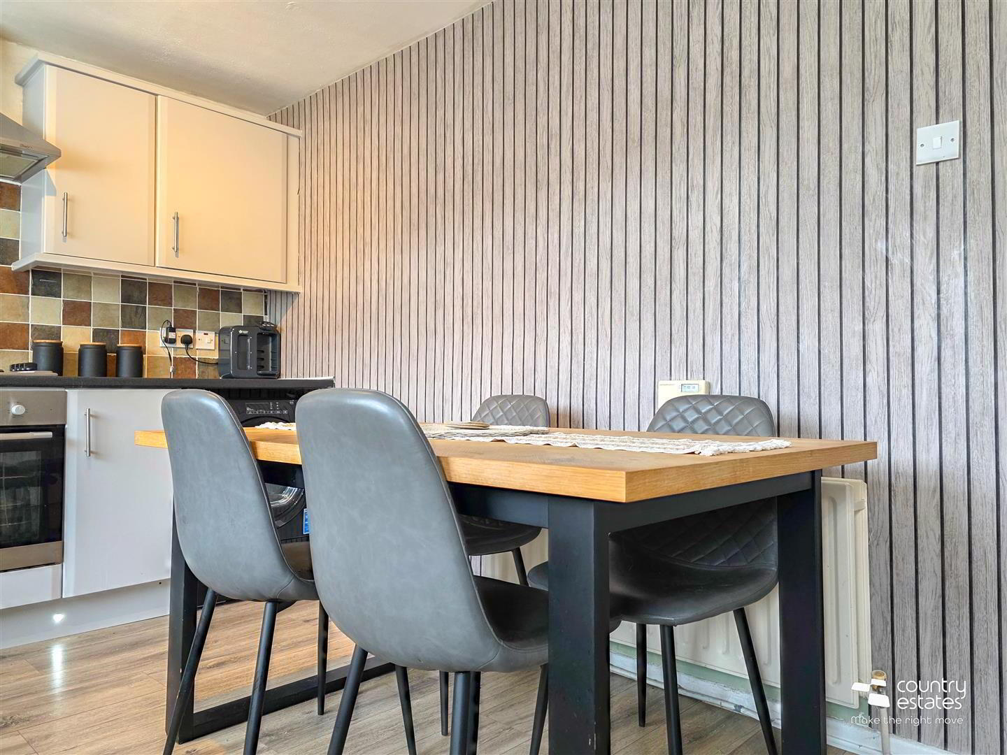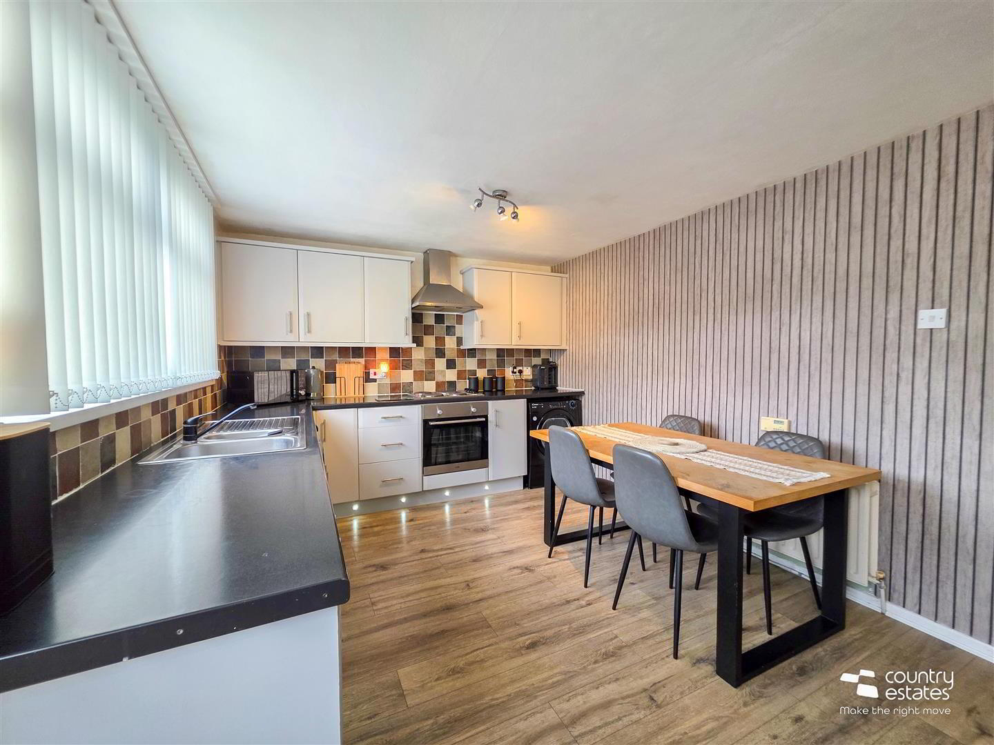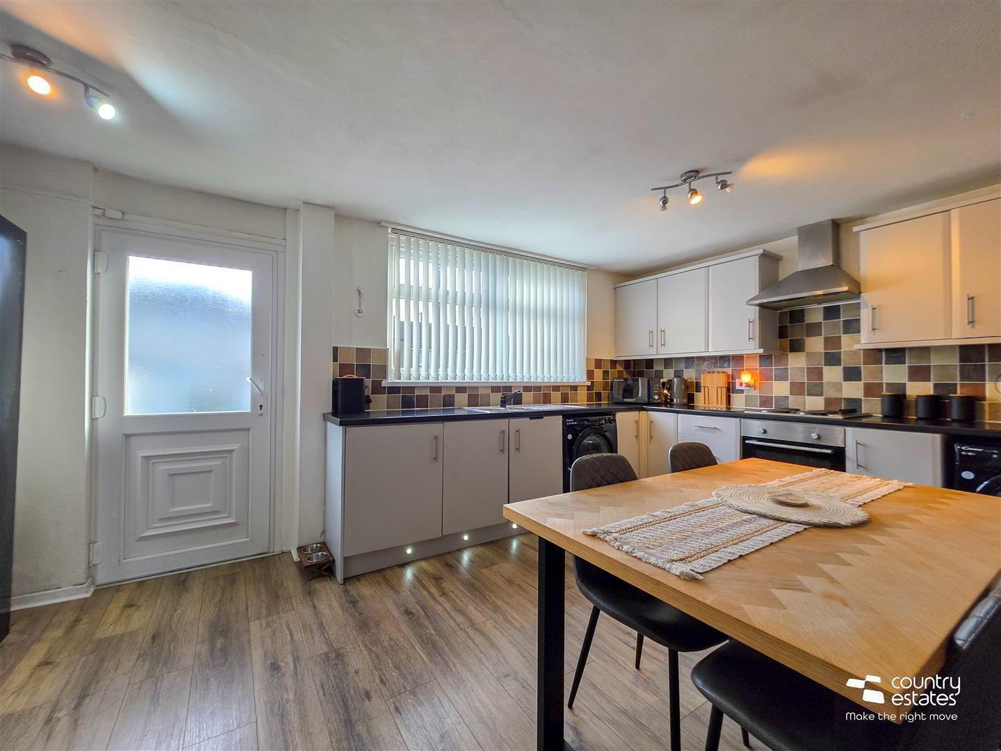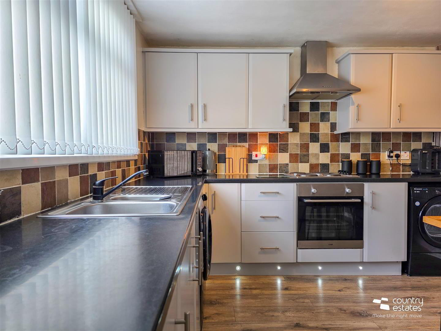 - Equipped with a comprehensive range of high and low level fitted units with contrasting work surfaces. One and a half bowl single drainer stainless steel sink unit. Integrated appliances to include oven, four ring electric hob and overhead extractor fan housed in stainless steel canopy. Plumbed for washing machine. Space for tumble dryer. Quality laminate flooring. PVC double glazed door to rear garden.