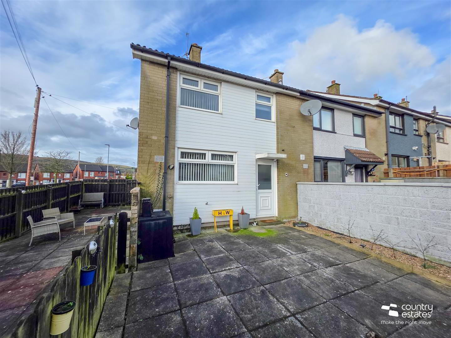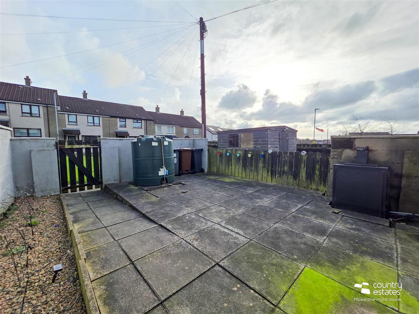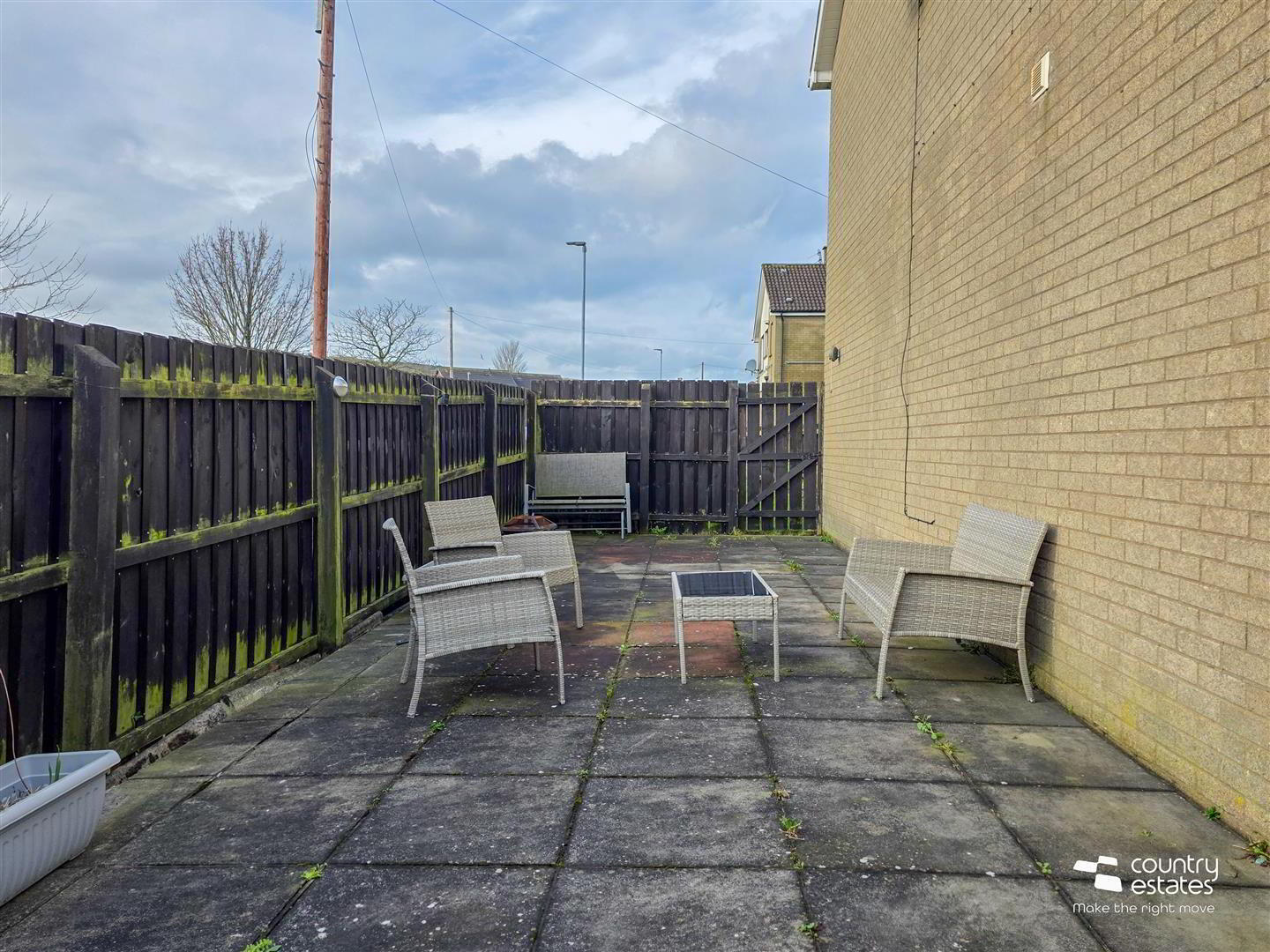 Hard landscape garden to side, screened by perimeter fence.