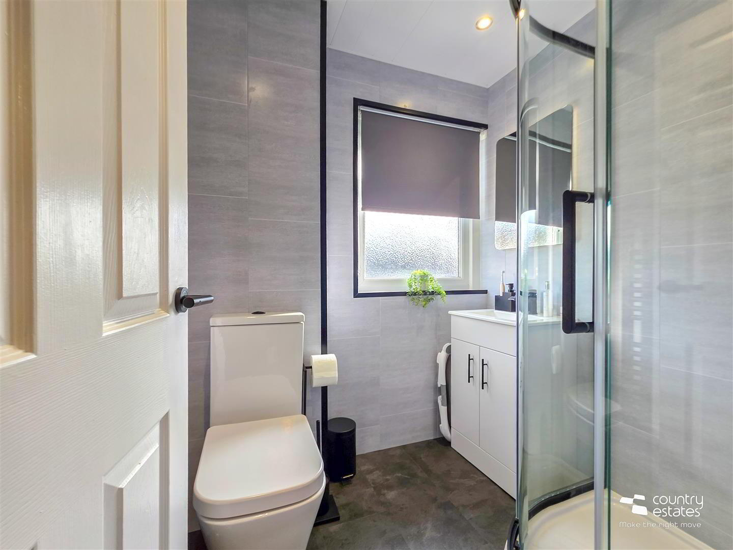 - Comprising quadrant shower cubicle with electric shower unit, vanity wash hand basin with monobloc tap and a button flush WC. PVC panelled walls. PVC panelled ceiling. Recessed down lighting. Towel radiator. Quality laminate flooring.