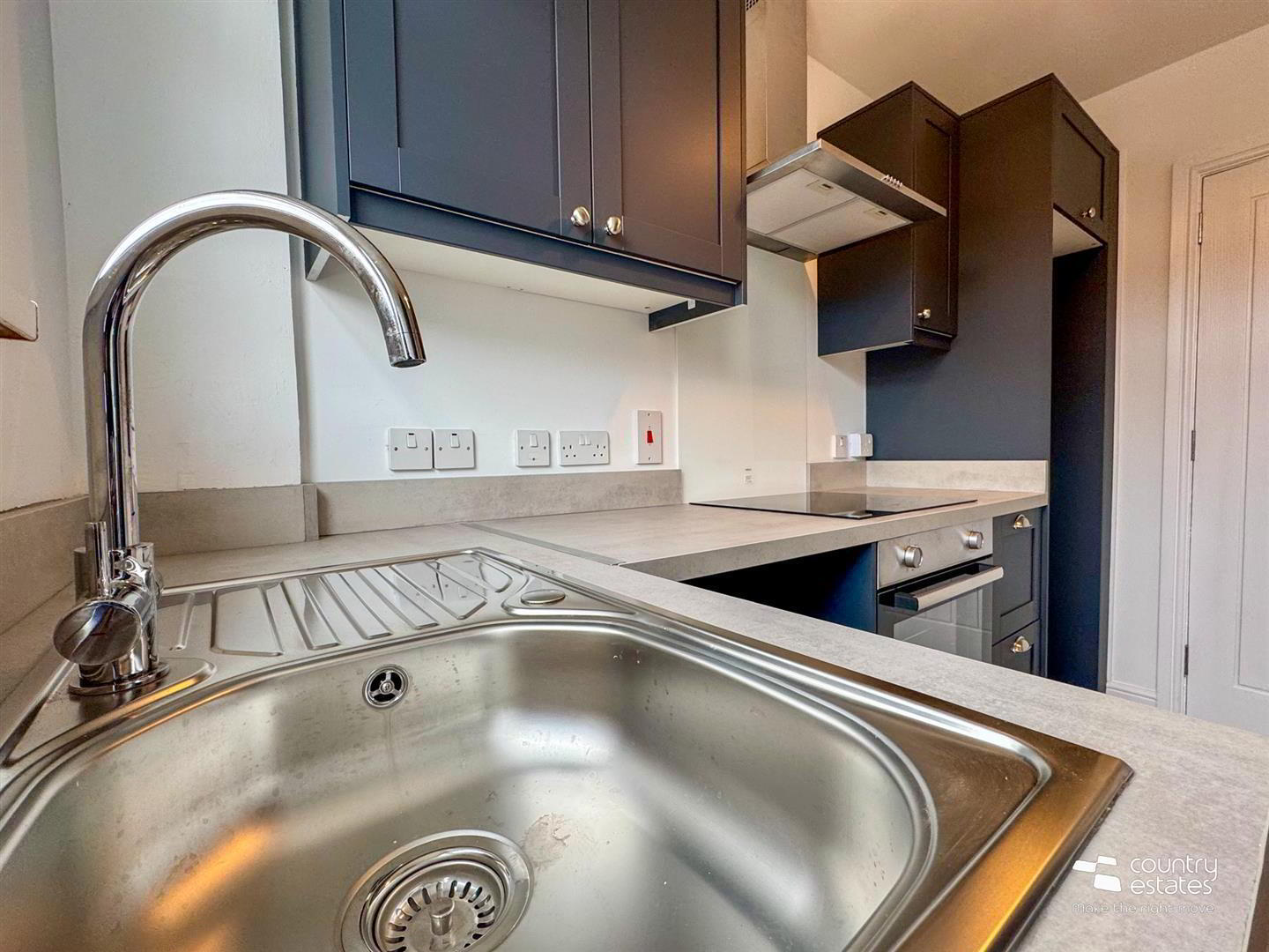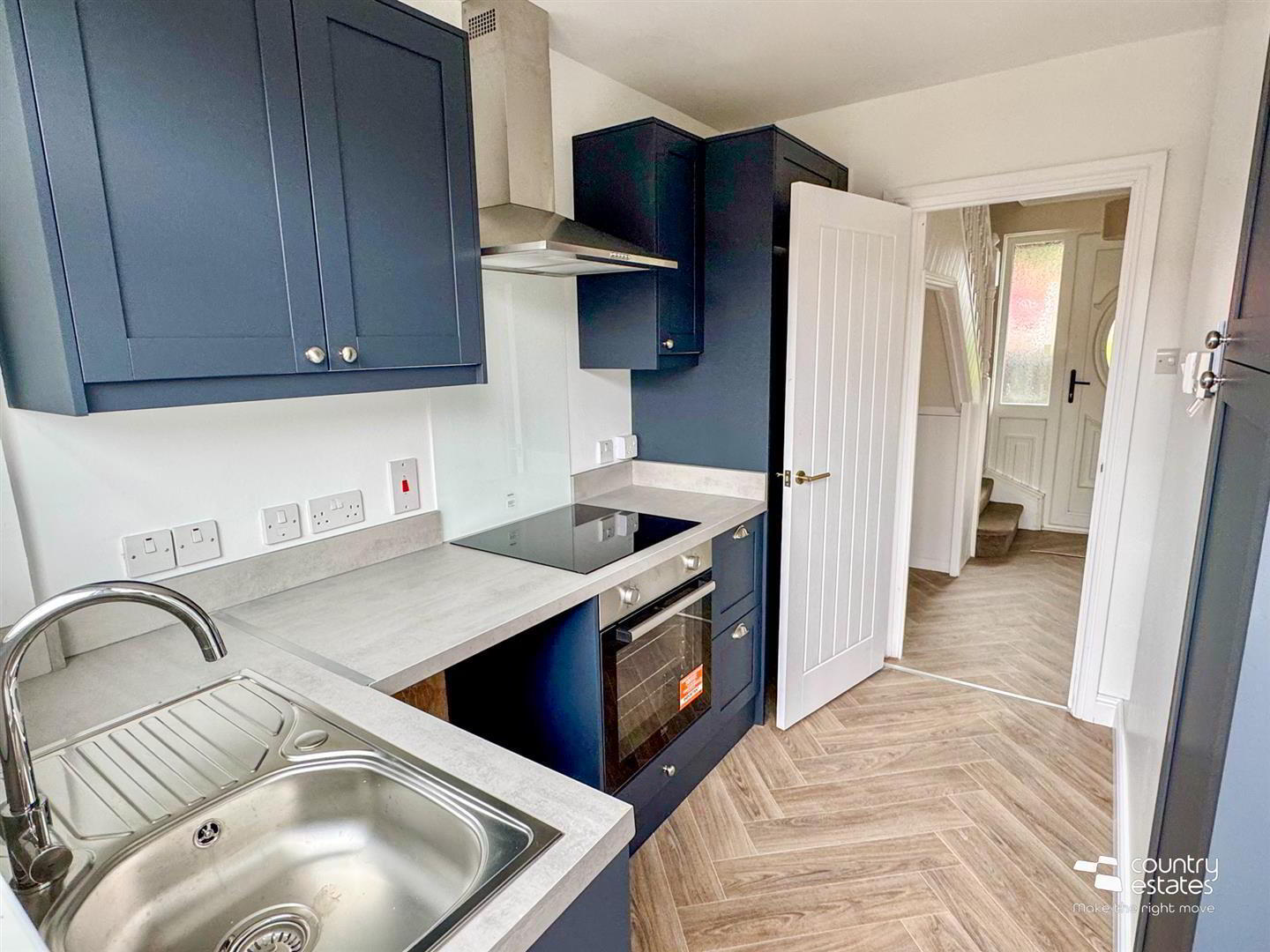 Approximately. Equipped with a range of high and low level 'midnight blue' shaker style units with contrasting stone effect works surfaces and upstands. Integrated oven with four ring hob, overhead extractor fan housed in stainless steel canopy and glass splashback. Single drainer stainless steel sink unit with swan neck tap. Plumbed for washing machine. Space for freestanding fridge/ freezer. Fitted large style cupboard. Fixed full height shelving bays.