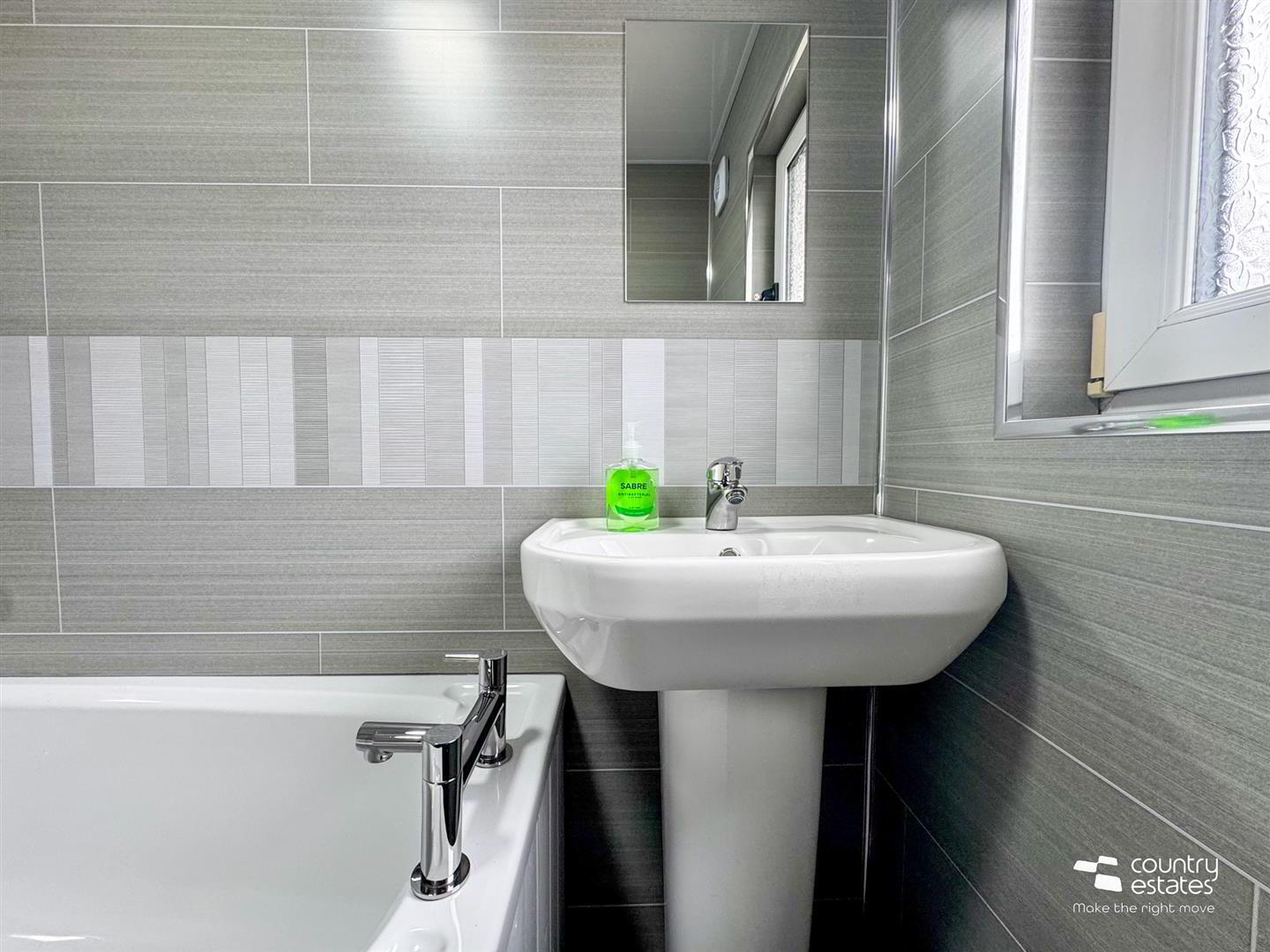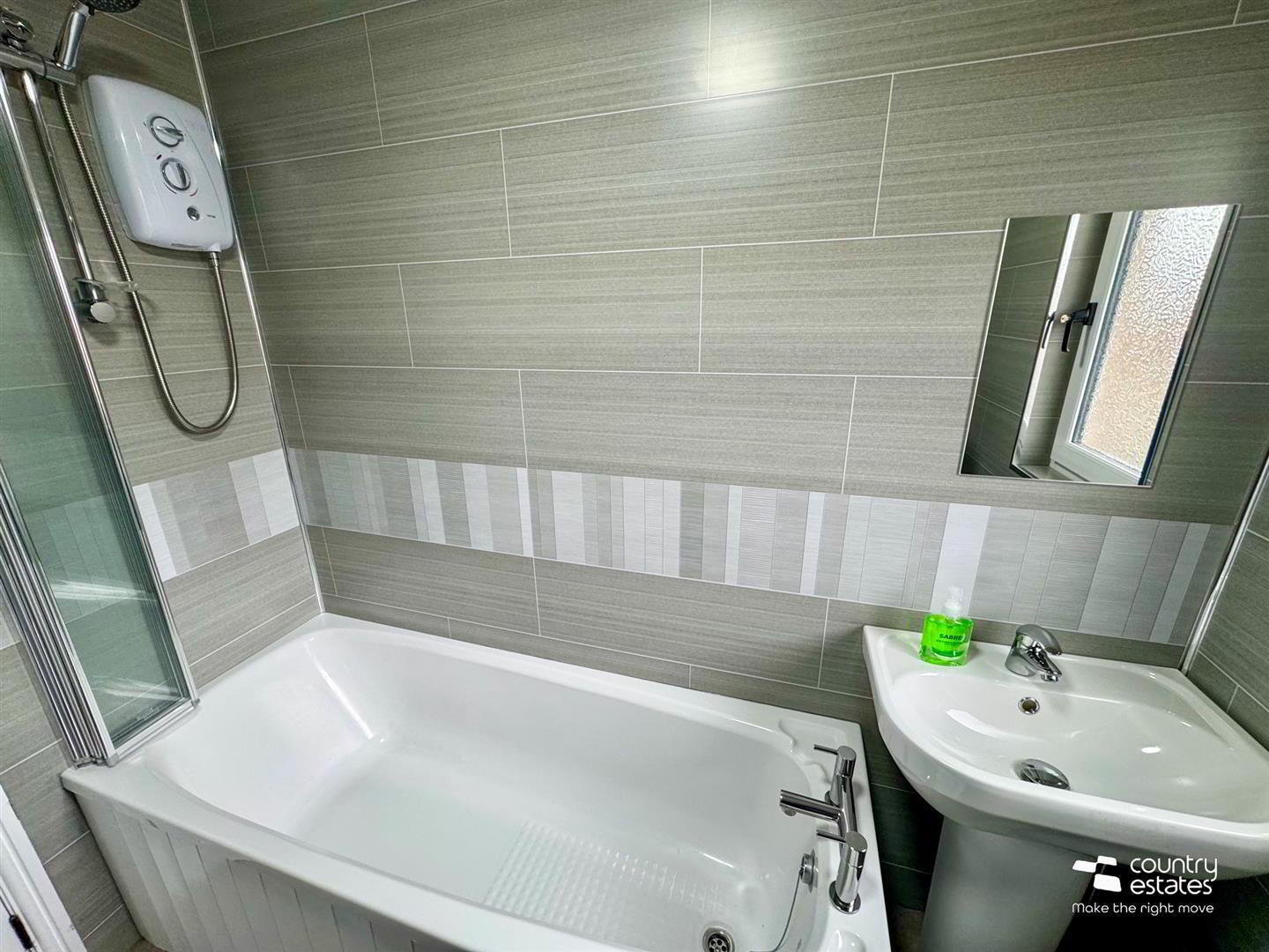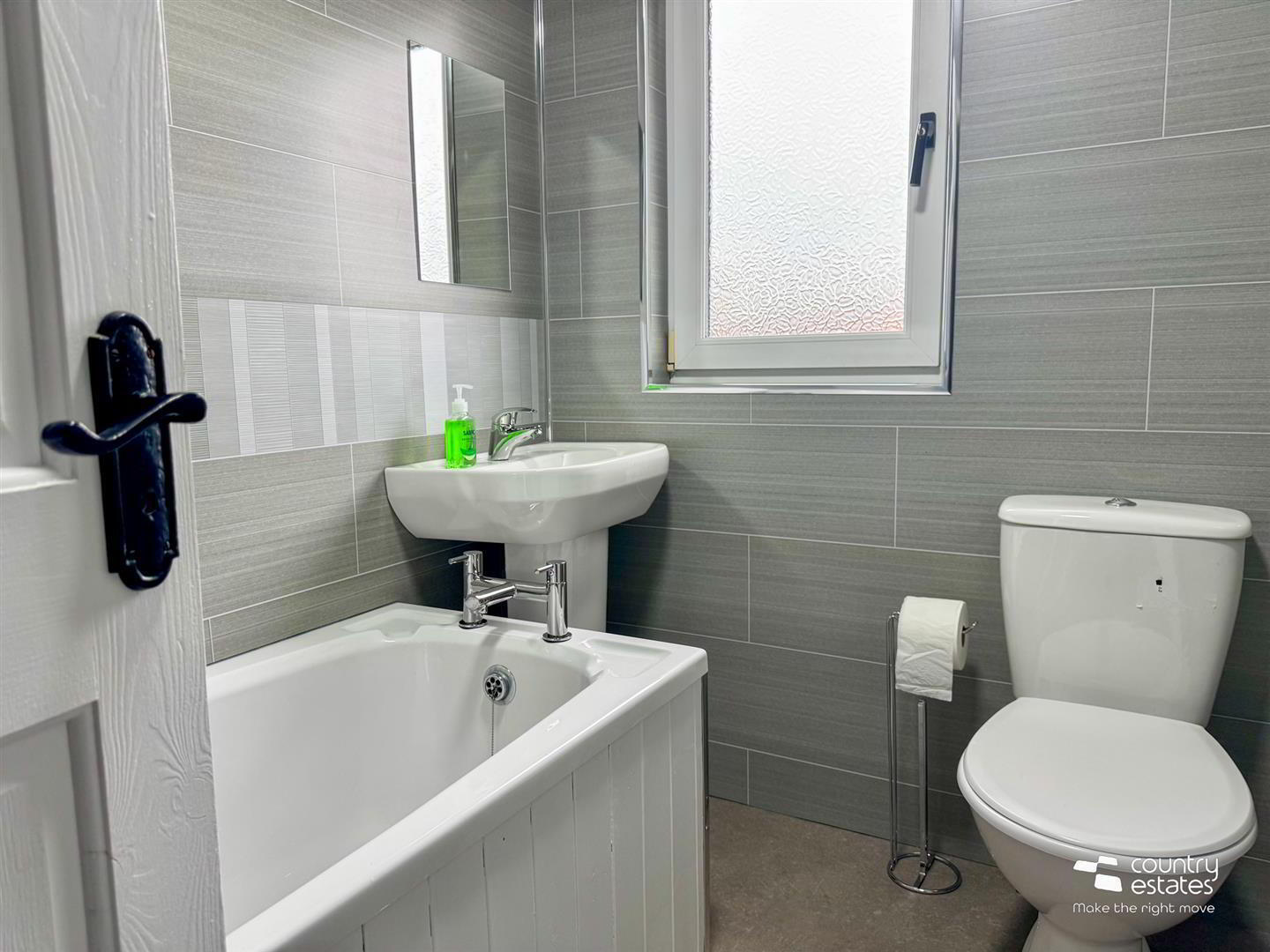 Comprising bath with folding shower screen and electric shower unit, pedestal wash hand basin with monobloc tap and button flush WC. Tile effect PVC wall panelling. PVC panelled ceiling.