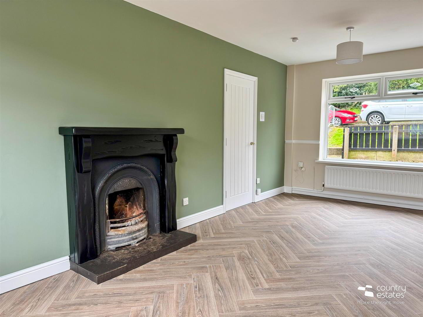 Horseshoe style cast iron open fireplace with tiled hearth and painted wooden surround. Dual window aspect.