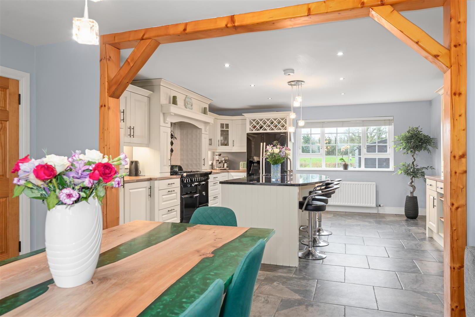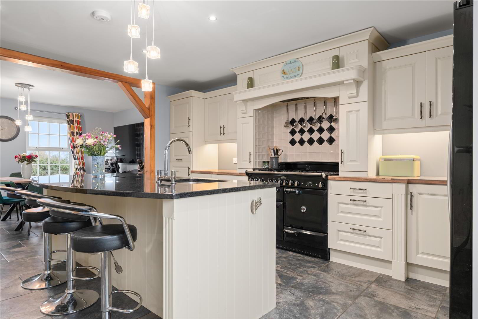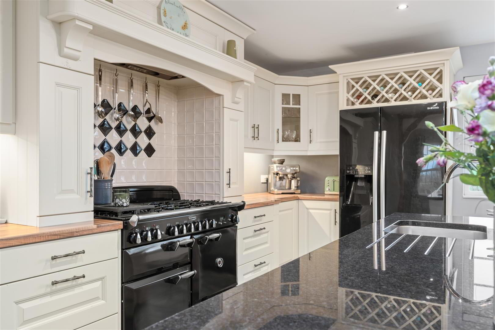 Full range of country style high and low level kitchen units with twisted handles, contrasting butcher bloc style work surfaces, display cabinet, integrated wine wrack and matching kitchen island with polished granite work surface and breakfast bar style seating. Additional kitchen units to opposite side with display cabinets. Integrated single drainer stainless steel sink unit with chrome mixer tap to kitchen island. Integrated dishwasher. Space for range cooker plumbed for gas, with concealed overhead extractor fan. Space for 'American' style fridge freezer. Over counter lighting. Low voltage down lighting. Fully tiled flooring. Double radiator. Open to;