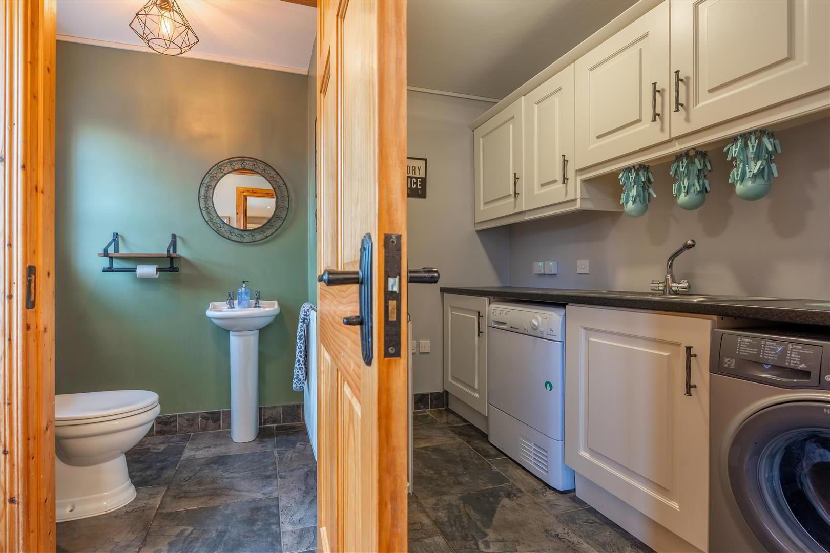 • Utility room with high and low level kitchen units with contrasting work surfaces. Single drainer stainless steel sink unit with chrome mixer tap. Space for washing machine and tumble dryer and lead