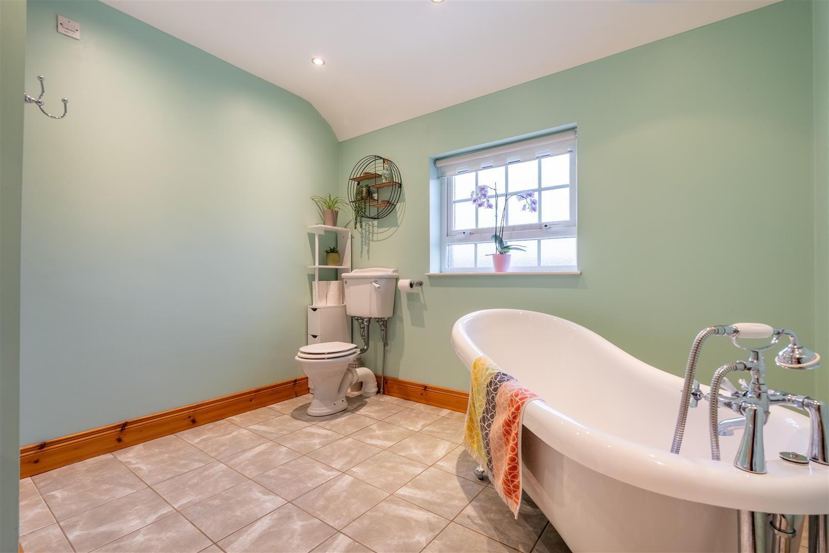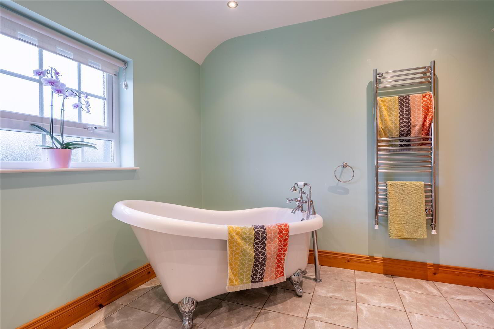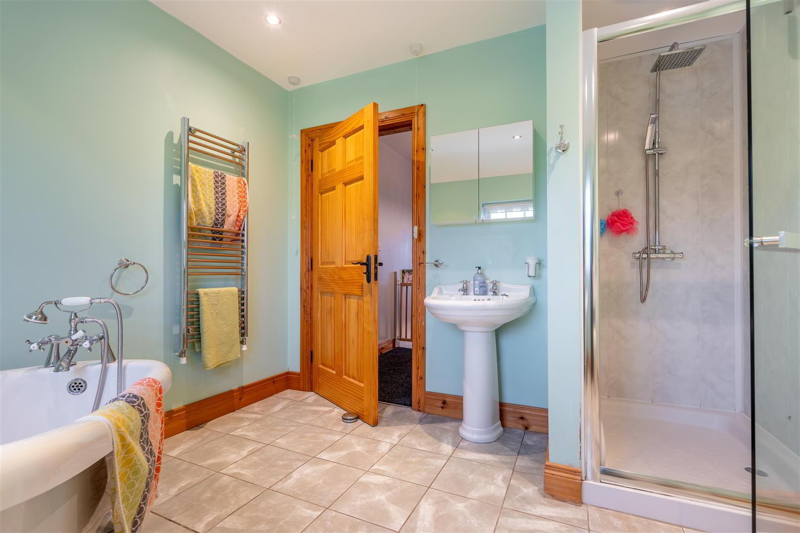 Luxury four piece suite comprising a freestanding claw foot bath with 'Victorian' style chrome mixer tap and shower attachment. An enclosed wall to wall shower with PVC wall panelling, drench shower head, secondary attachment and glazed door. A pedestal 'Victorian' style wash hand basin with chrome hot and cold taps. Low flush WC. Fully tiled floor. Low voltage down lighting. Extractor fan. Chrome tower radiator.