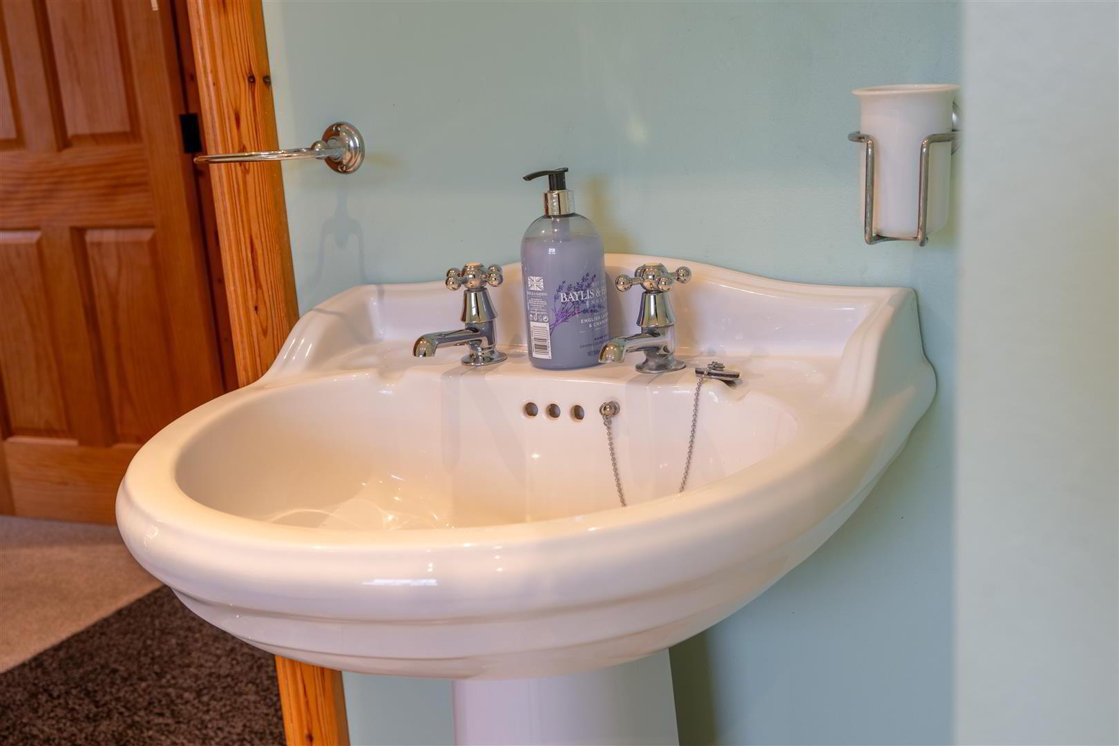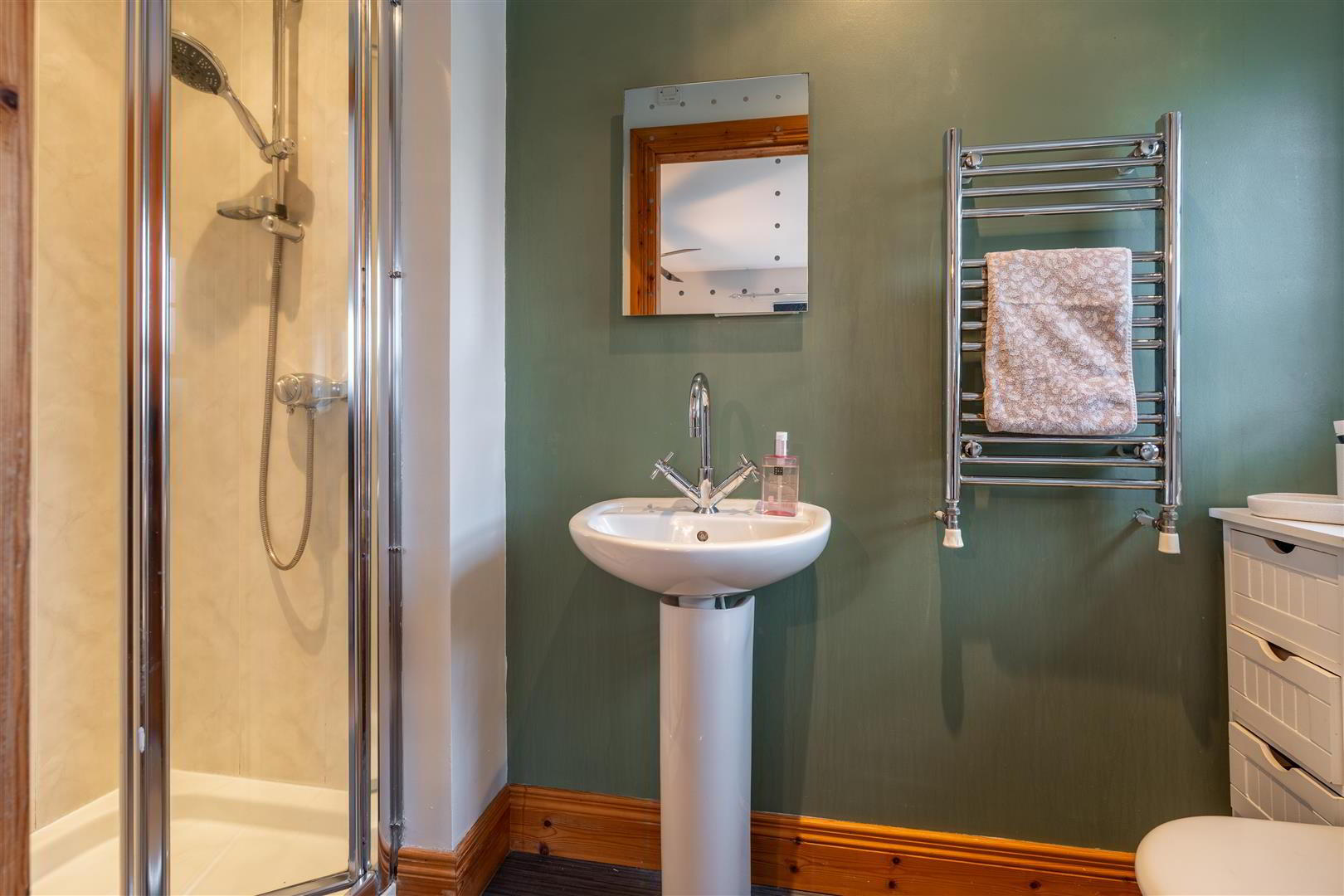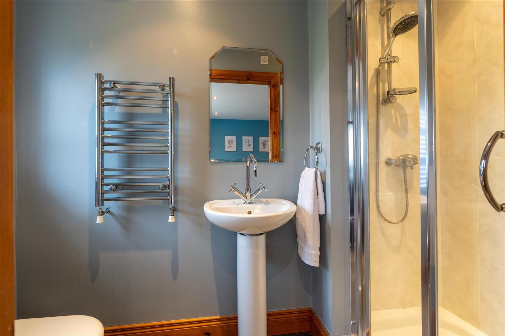 Luxury four piece suite comprising a freestanding claw foot bath with 'Victorian' style chrome mixer tap and shower attachment. An enclosed wall to wall shower with PVC wall panelling, drench shower head, secondary attachment and glazed door. A pedestal 'Victorian' style wash hand basin with chrome hot and cold taps. Low flush WC. Fully tiled floor. Low voltage down lighting. Extractor fan. Chrome tower radiator.