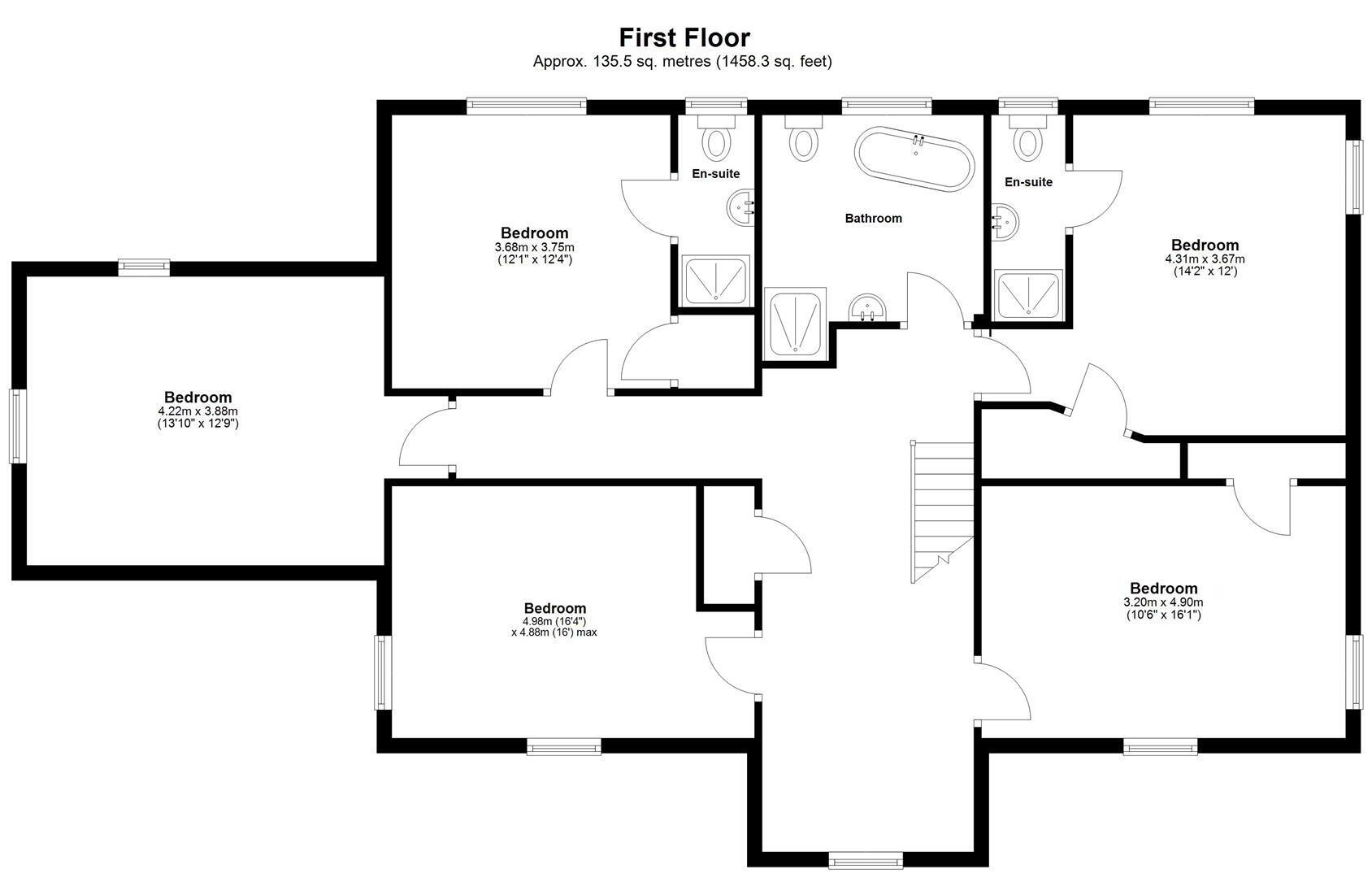 To the first floor are five exceptionally well-proportioned bedrooms, two of which benefit from superb ensuite shower rooms, along with a luxurious four-piece family bathroom finished to a high standard.