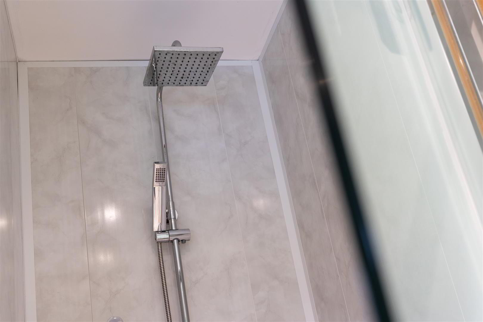 Modern white suite comprising a wall to wall shower with PVC wall panelling and partially glazed folding door. Pedestal wash hand basin with chrome mixer tap. Low flush push button WC. Extractor fan. Low voltage downlight. Chrome towel radiator.