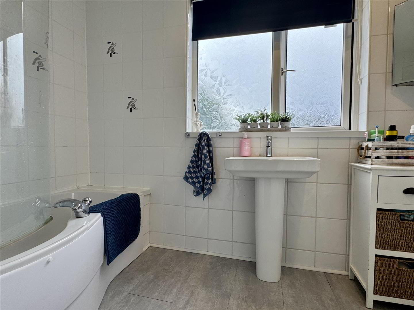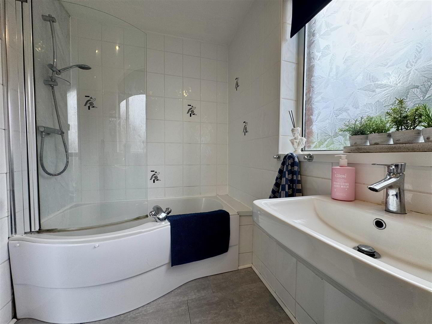 - Comprising pedestal wash handbasin with mono block top. Button flush w.c. Offset bath with fixed curved shower screen and thermostatically controlled shower over. Fully tiled walls.