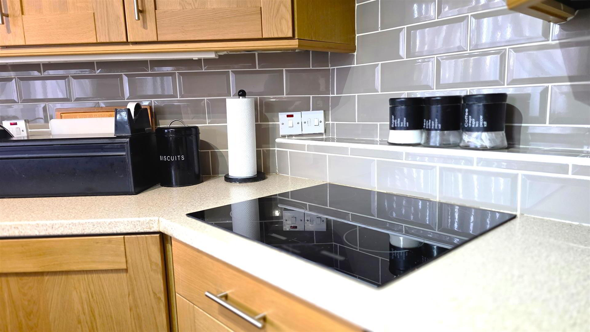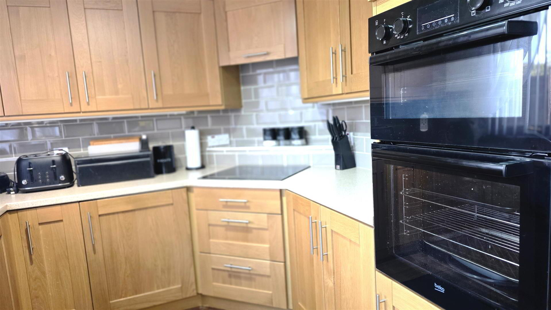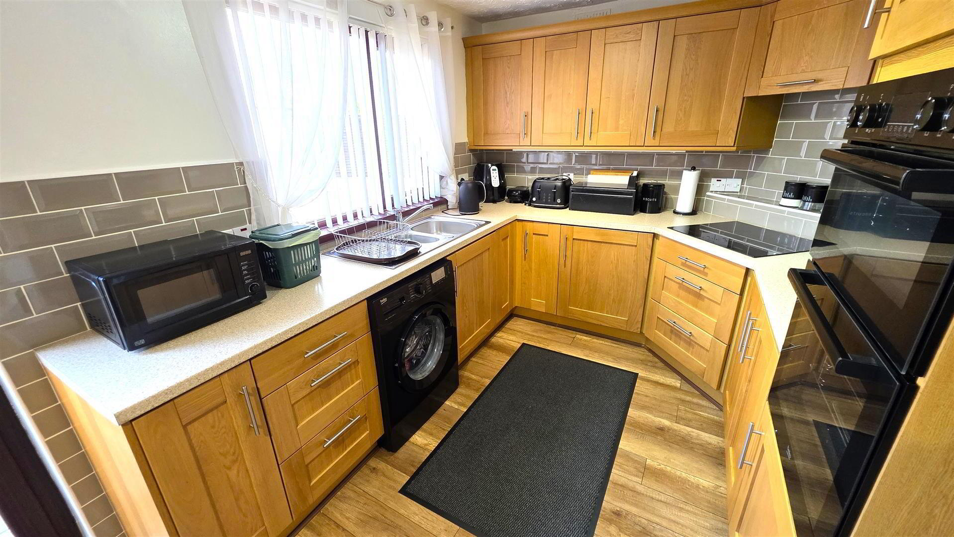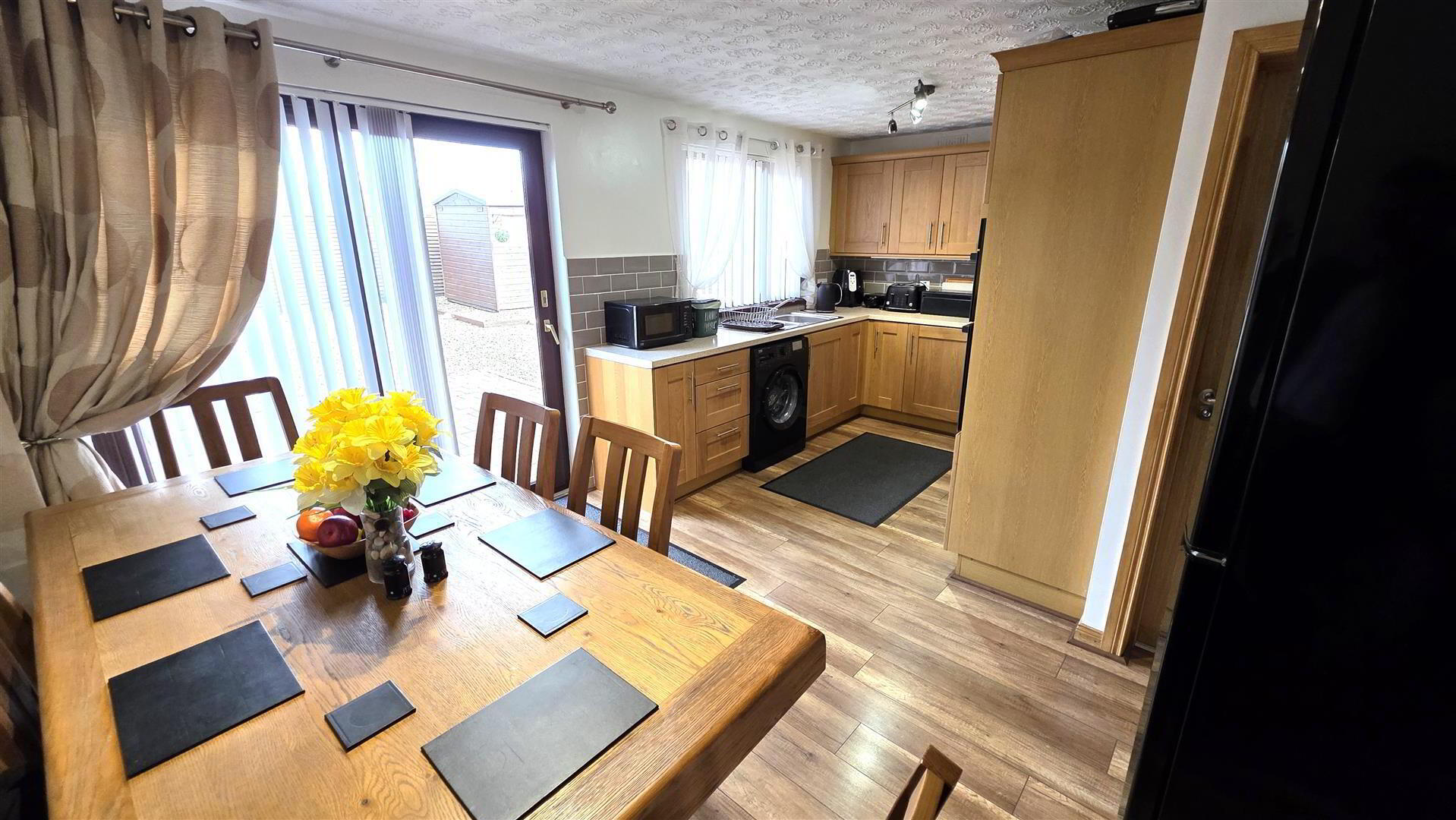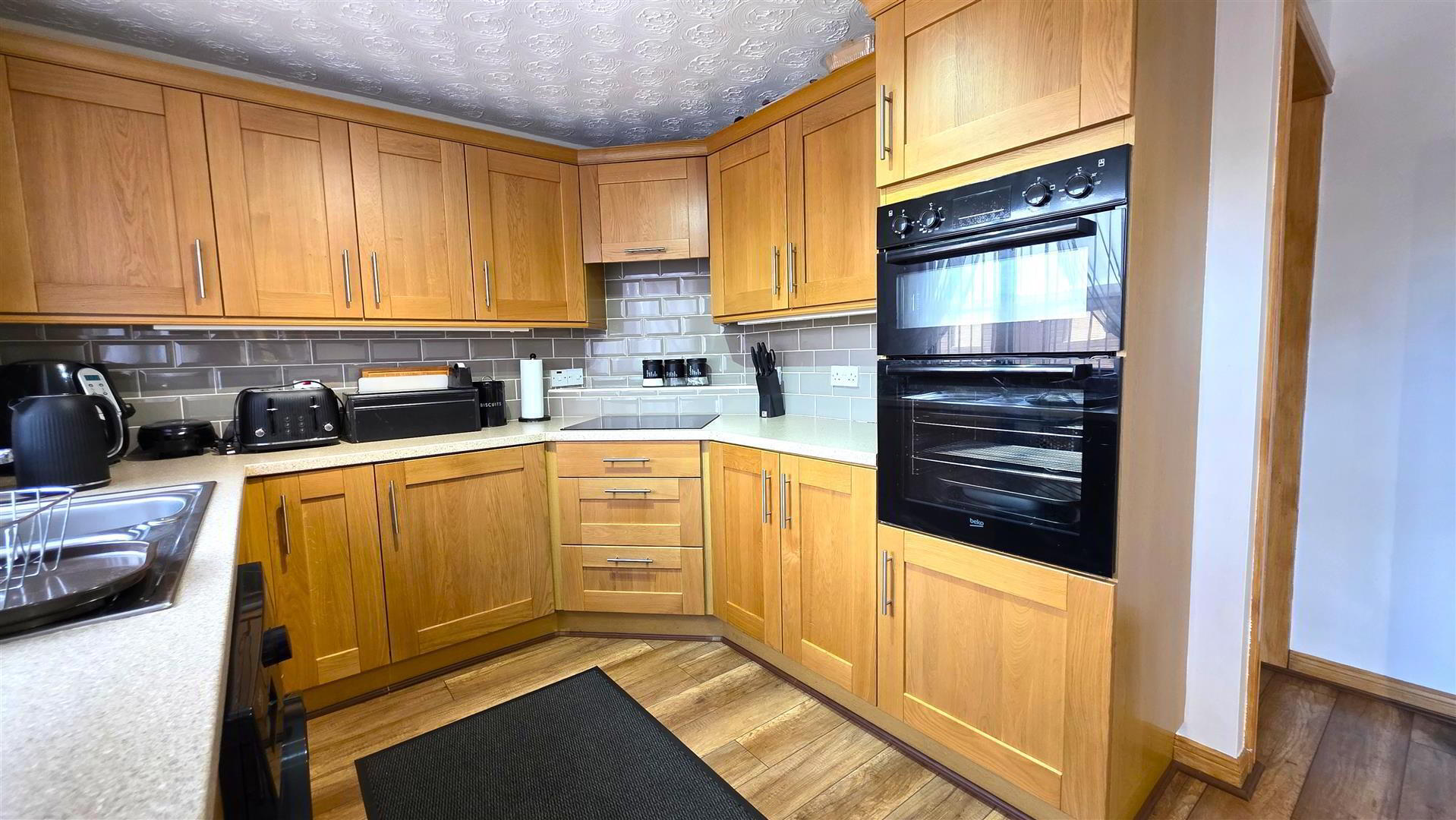 - Full range of solid oak shaker style, high and low level kitchen units with complimentary work surfaces and bevered subway style, splashback, tiling. One and one quarter bowl stainless steel sink unit with chrome mixer tap. Integrated four ring halogen hub with hooded overhead extractor fan. Integrated mid level double oven and grill. Space for fridge freezer and washing machine. Wood laminate flooring. Mahogany affect PVC, double glazed, sliding patio door to rear. Single radiator.