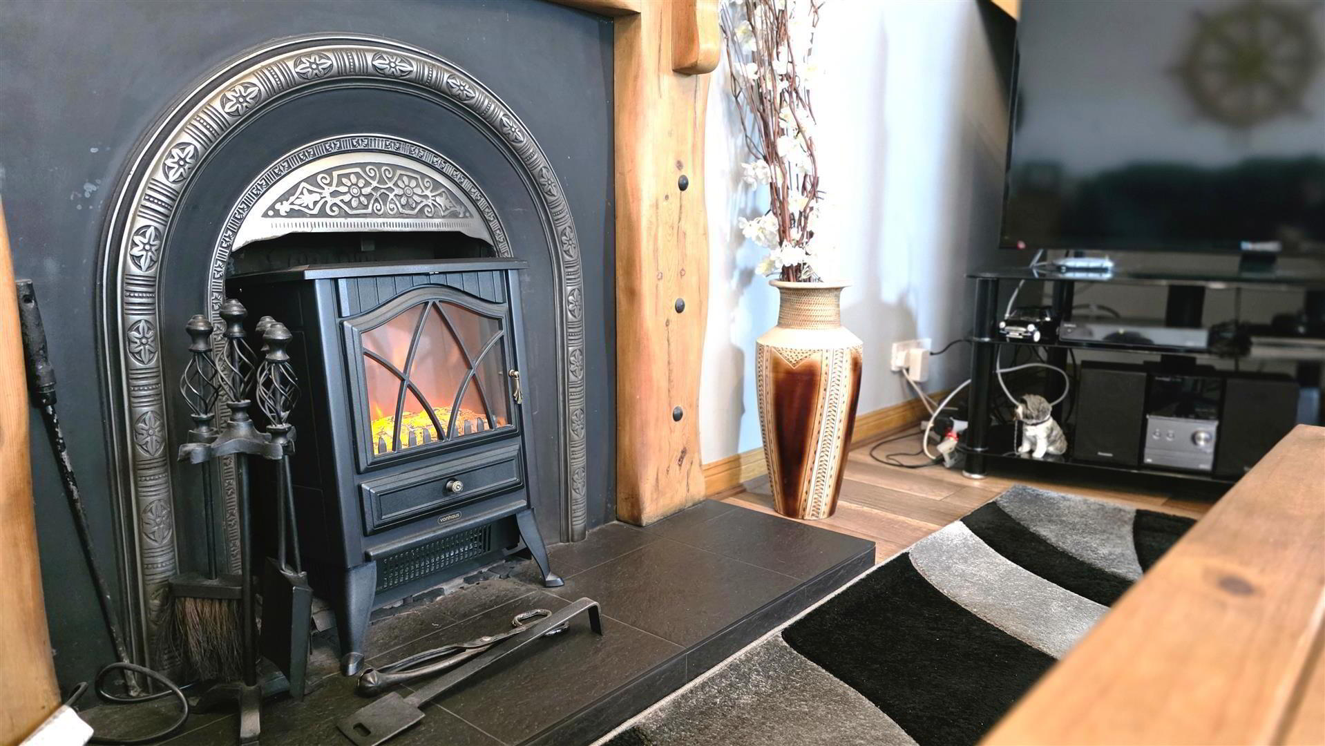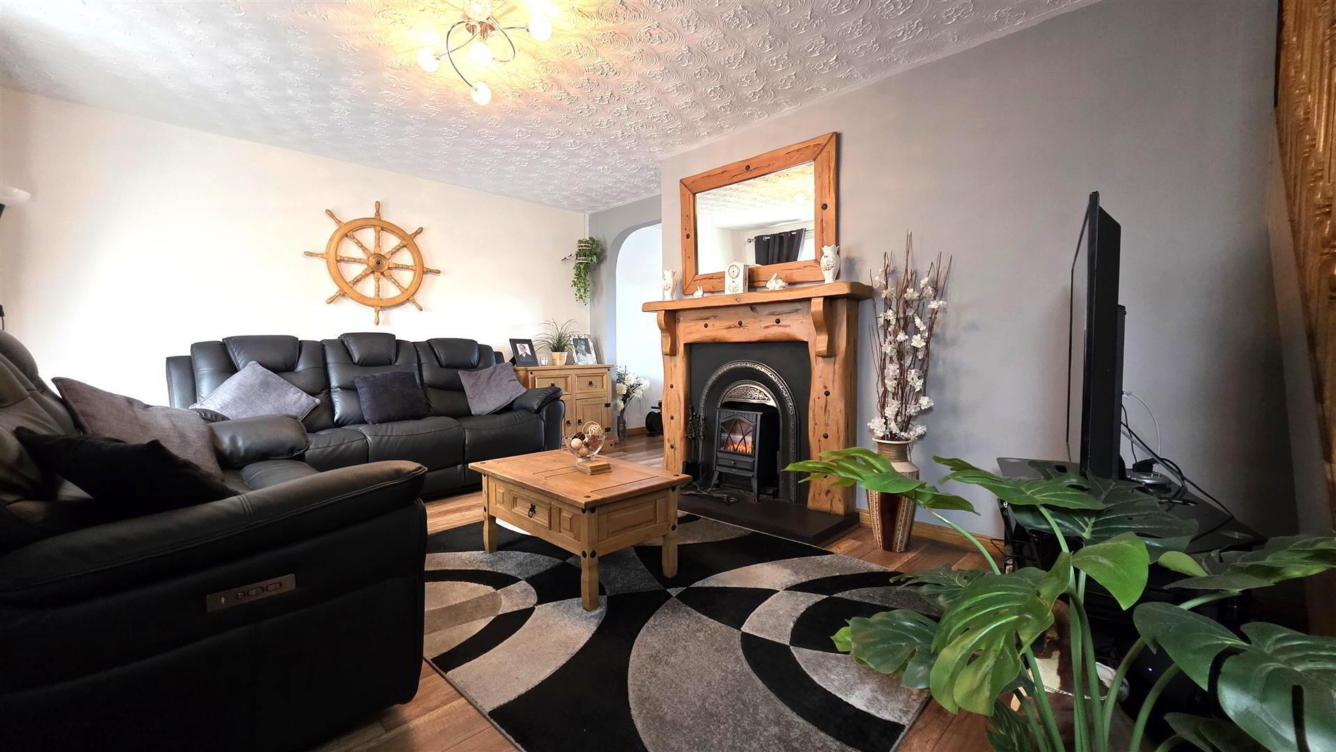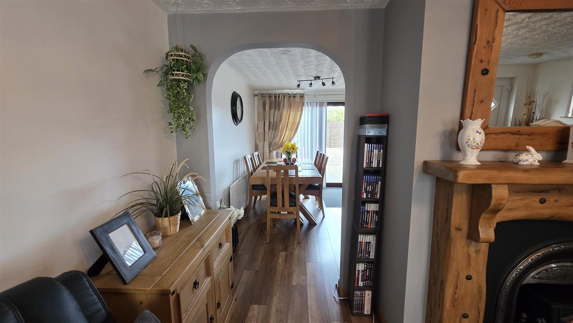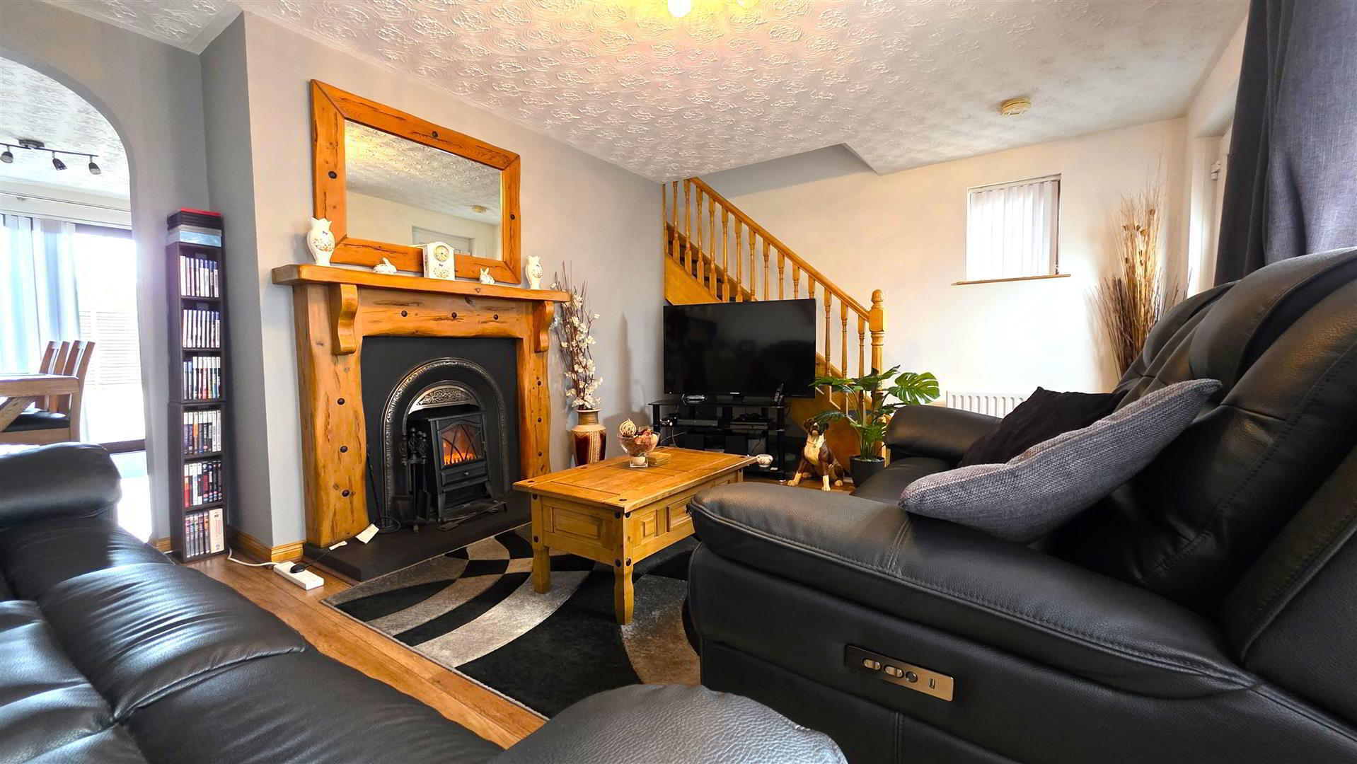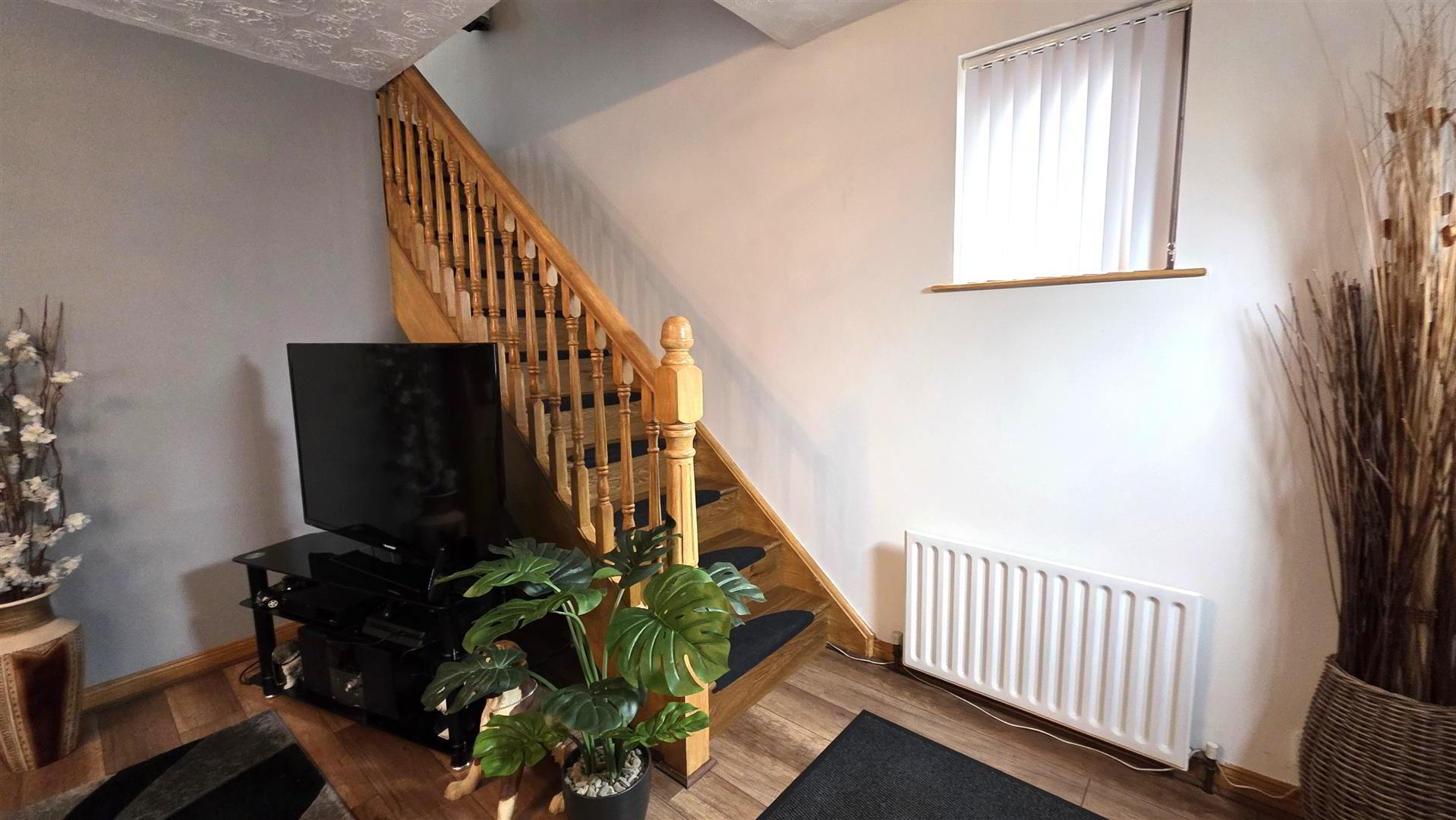 - Open fire with back boiler, cast iron inset, decorative wooden surround and slate effect tiled hearth. Solid Oak Staircase to first floor with moulded, handrail and turned balustrading. Wood laminate flooring. Single radiator. Arch open to;