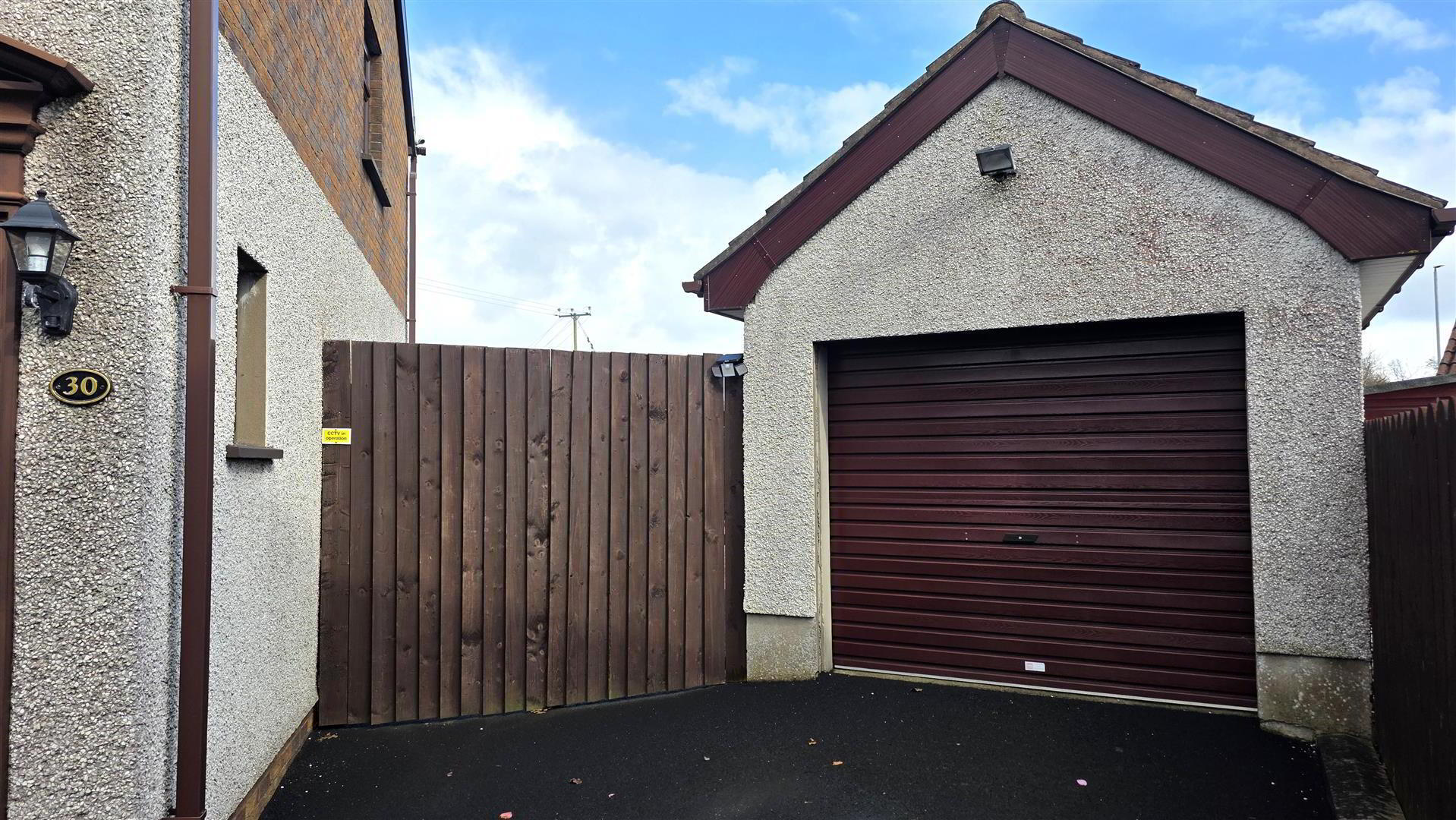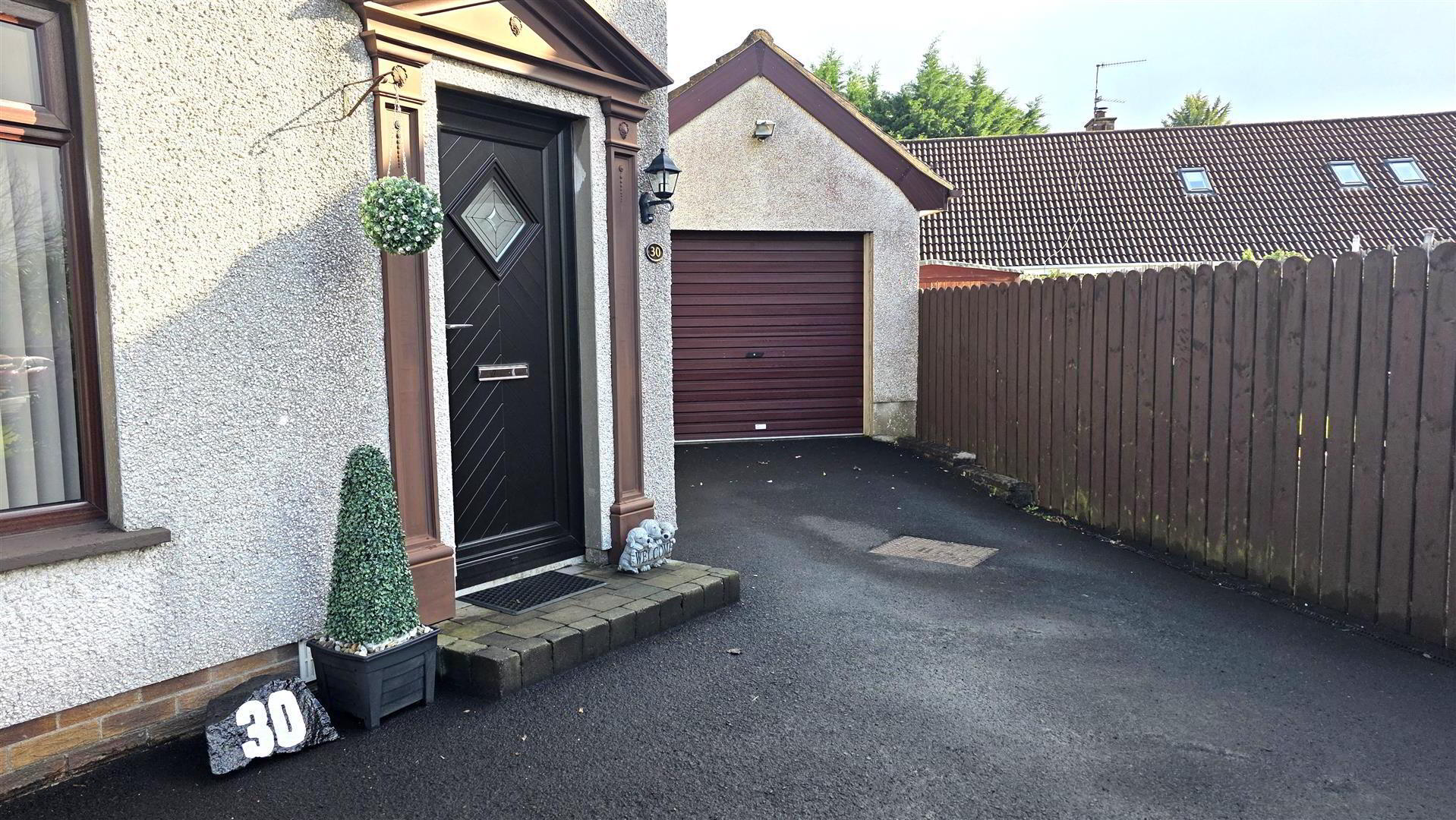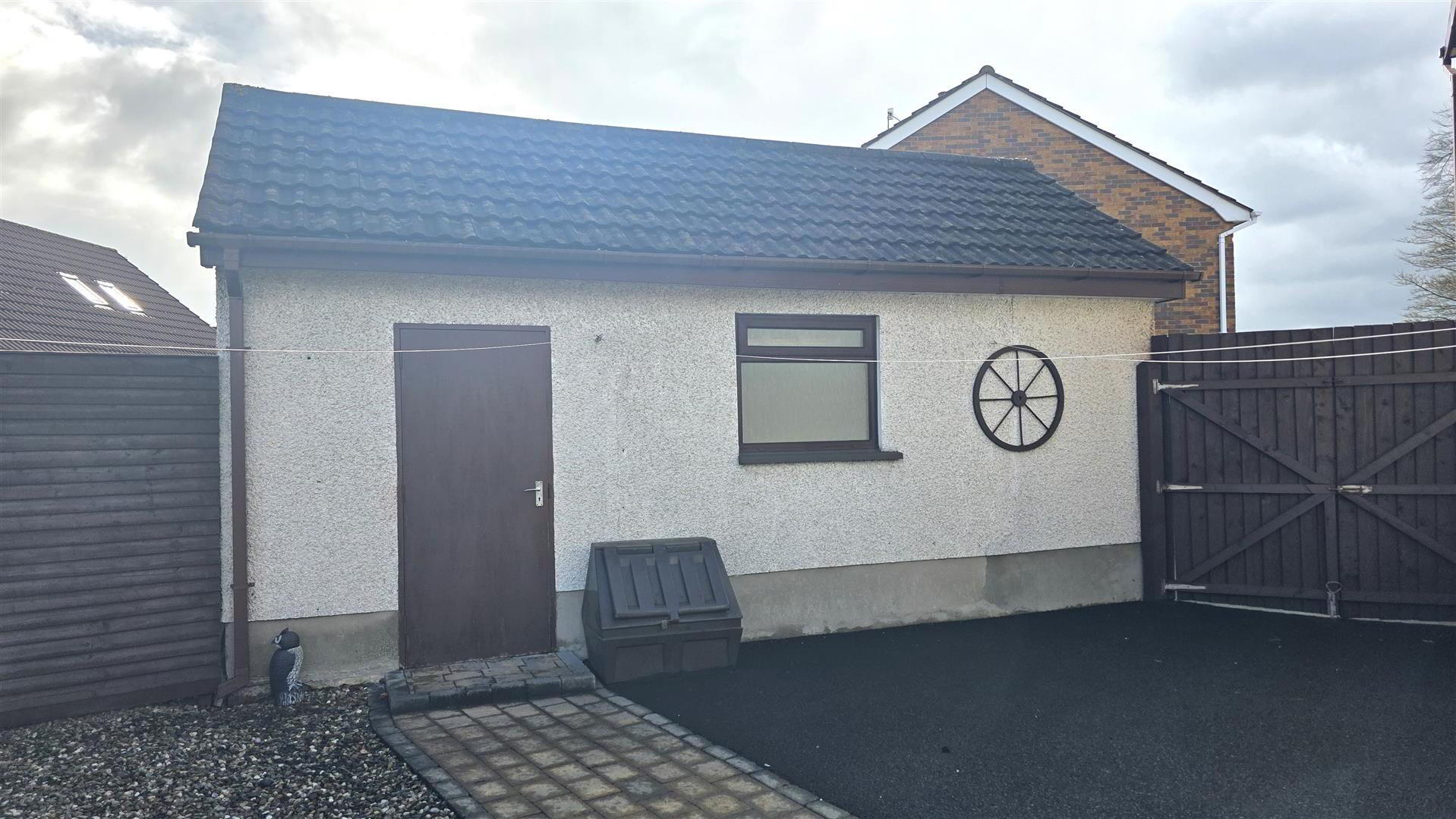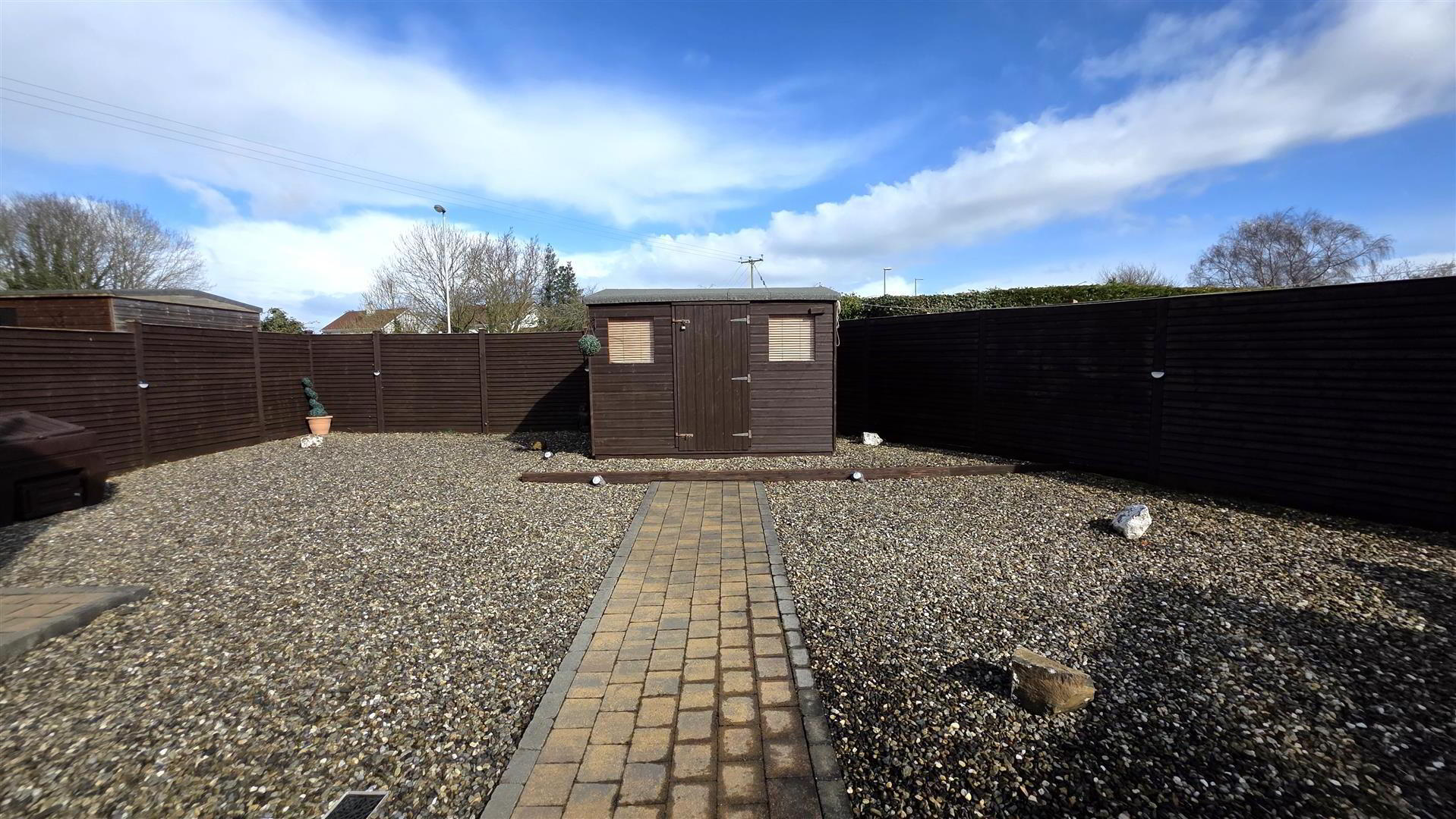 - Fully enclosed and low maintenance rear garden, offering exceptional privacy. Large paved patio and mixed stone bedding. Paved pathway leading to garden shed and garage. Outside tap and outside lighting. 6 ft timber fencing and double gates to front.