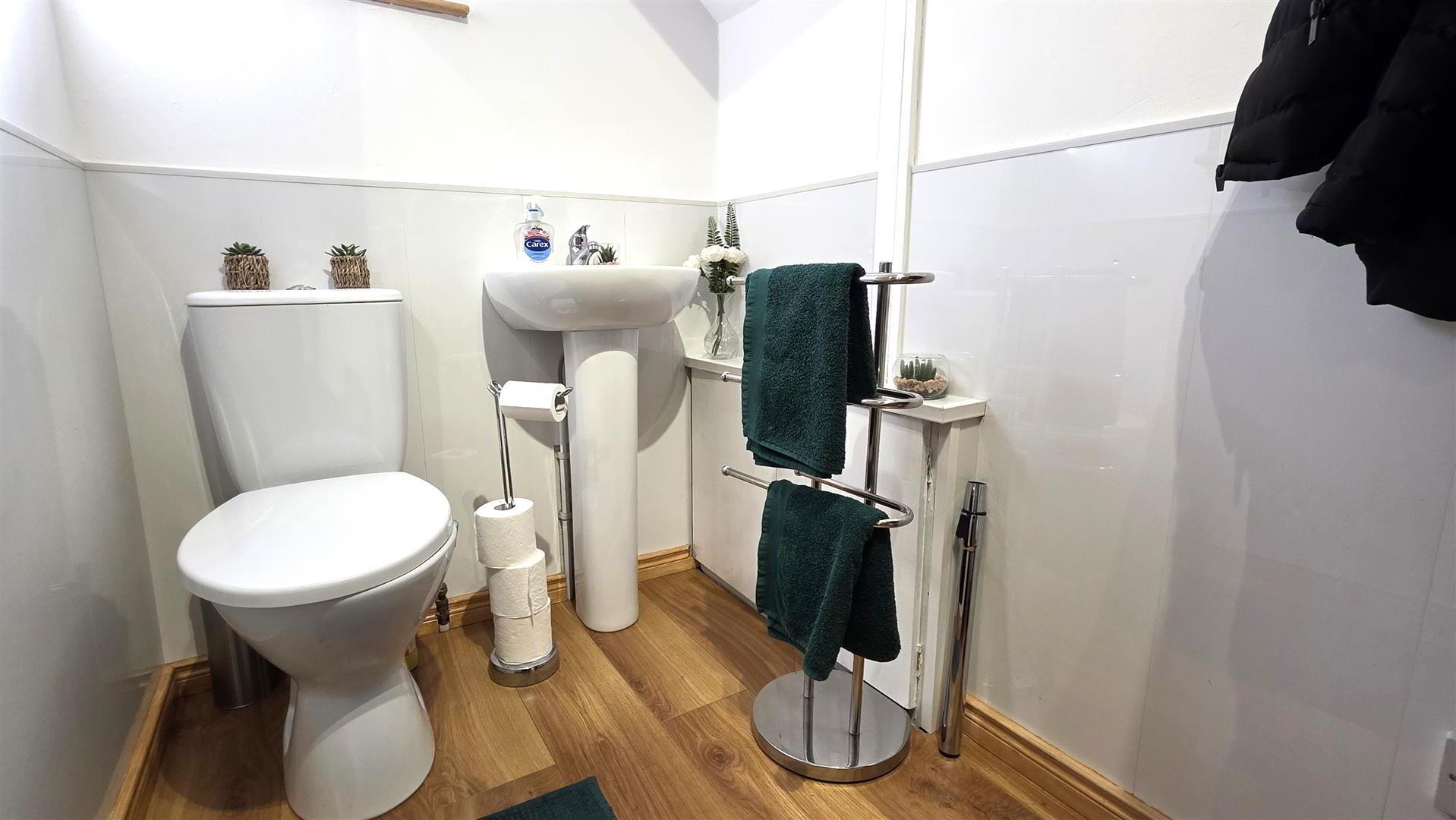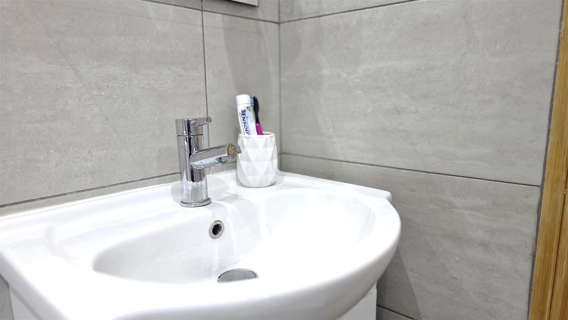 - Modern white suite prising, a pedestal wash hand basin with chrome 'Monobloc' mixer tap. A low flush push button WC. Partial PVC wall panelling. Wood laminate flooring. Electric meter cupboard.