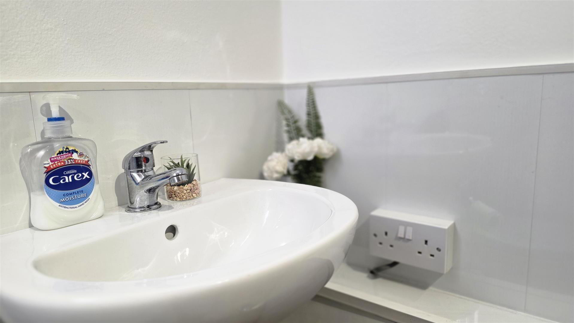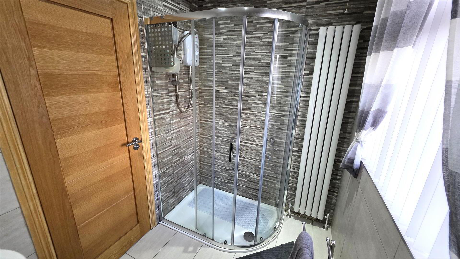 - Modern white suite comprising a large enclosed shower with feature tiled splashback, 'Redring expressions' electric shower and partially glazed sliding door. A 'Vanity' wash hand basin with chrome 'Monobloc' mixer tap and storage below. A low flush push button WC. Fully tiled walls and fully tiled flooring. Low voltage downlighting. Extractor fan. Designer vertical radiator.