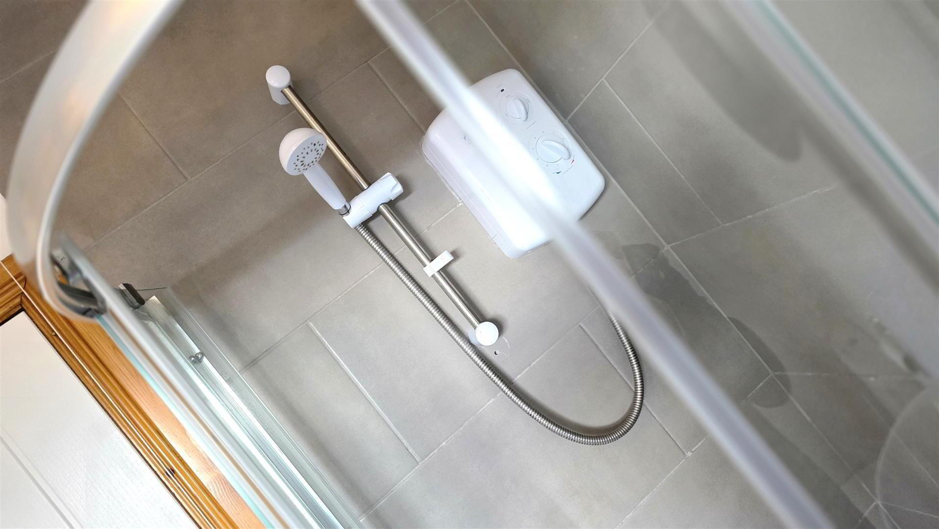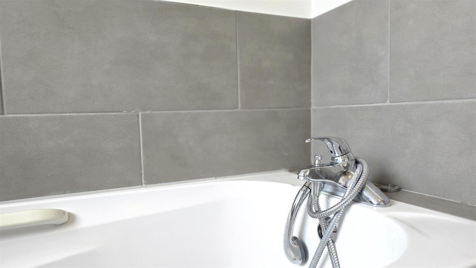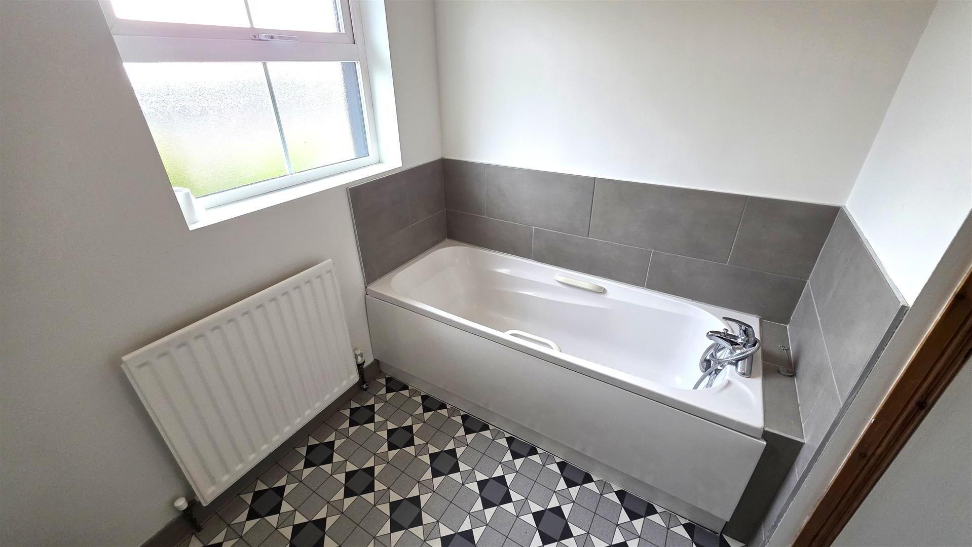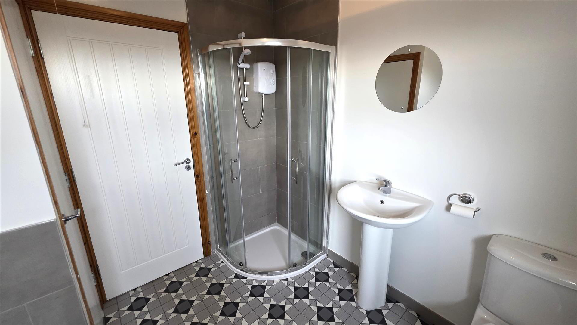 - Modern white four piece suite comprising a panel bath with fully tiled splashback and feature chrome mixer tap with shower attachment. A quadrant enclosed shower with fully tiled splashback and 'Triton' electric shower, fully tiled splashback and partially glazed sliding doors. A pedestal wash hand basin with 'Monobloc' chrome mixer tap. A low flush push button WC. Tiled skirting. Extractor fan. Hot press with insulated copper cylinder. Single radiator.