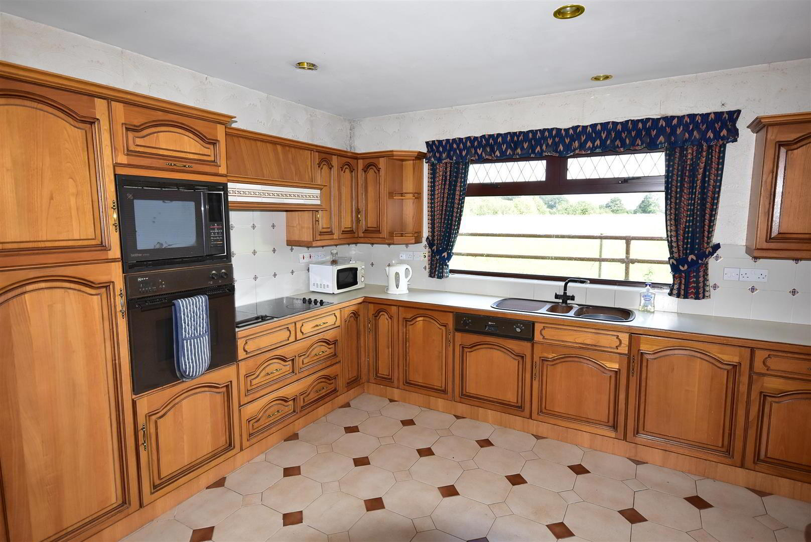 - Full range of wooden "Alwood" high and low level units with open displays and contrasting work surfaces. One and a quarter bowl single drainer sink unit and mixer tap. Integrated four ring halogen hob with adjoining inset deep fat fryer. Mid level "Neff" oven and grill with microwave above. Integrated fridge and "Neff" dishwasher. Part tiled walls to work surfaces. Superb view to side over adjoining field and up to Donegore Hill. Double radiator. Mahogany open tread staircase to first floor. Door to formal dining room. Part single glazed door to rear hall. Inset downlights. Fully tiled floor through to: