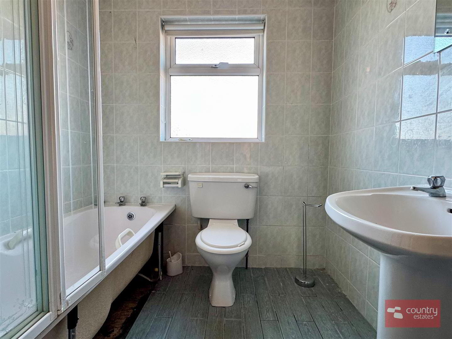 - Three piece suite comprising bath with wall mounted electric shower over and fixed folding shower screen, low flush w.c. and pedestal wash hand basin. Shelved hot press. Matching ceramic tile floor.
