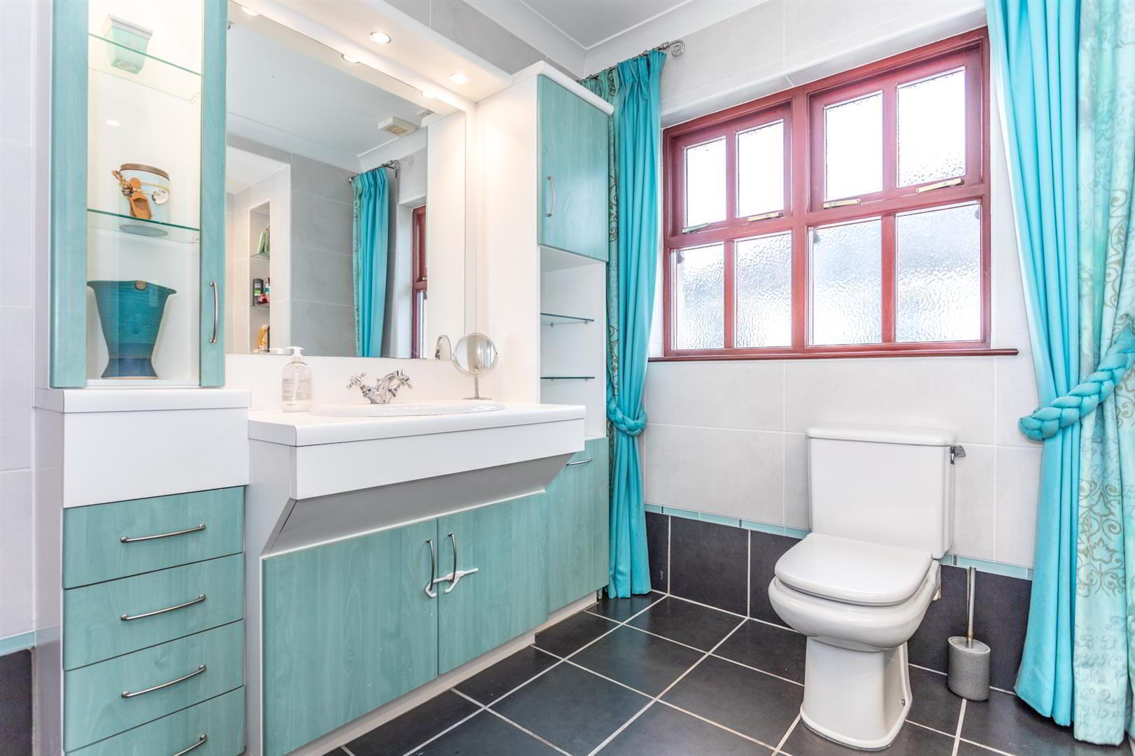 White suite comprising low flush W/C and pedestal wash hand basin with mixer taps and tiled splash back. Fully tiled floor. Low voltage down lights. High level meter cupboard. Single radiator.