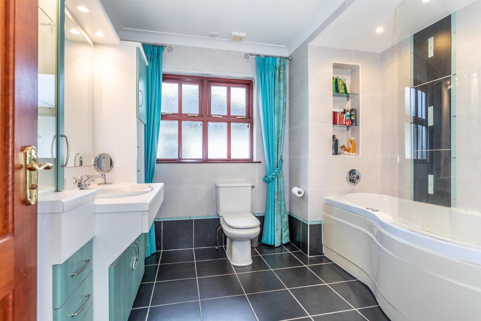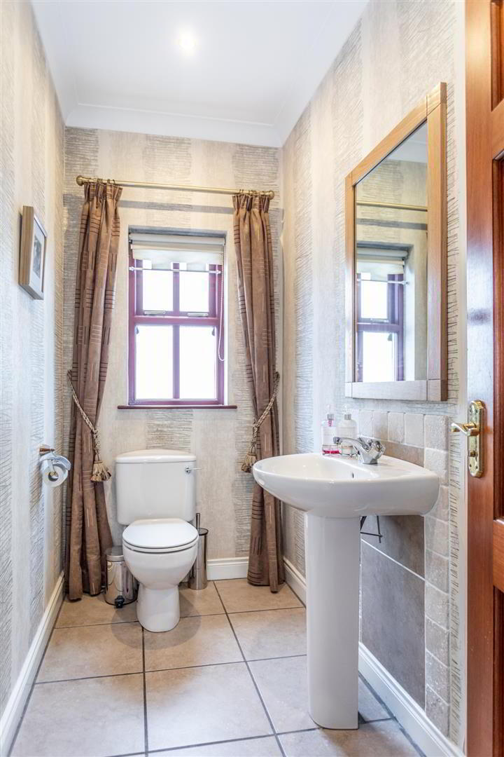 • First floor landing with access to hotpress / Corniced ceiling / Family bathroom with modern white suite to include curved shower bath