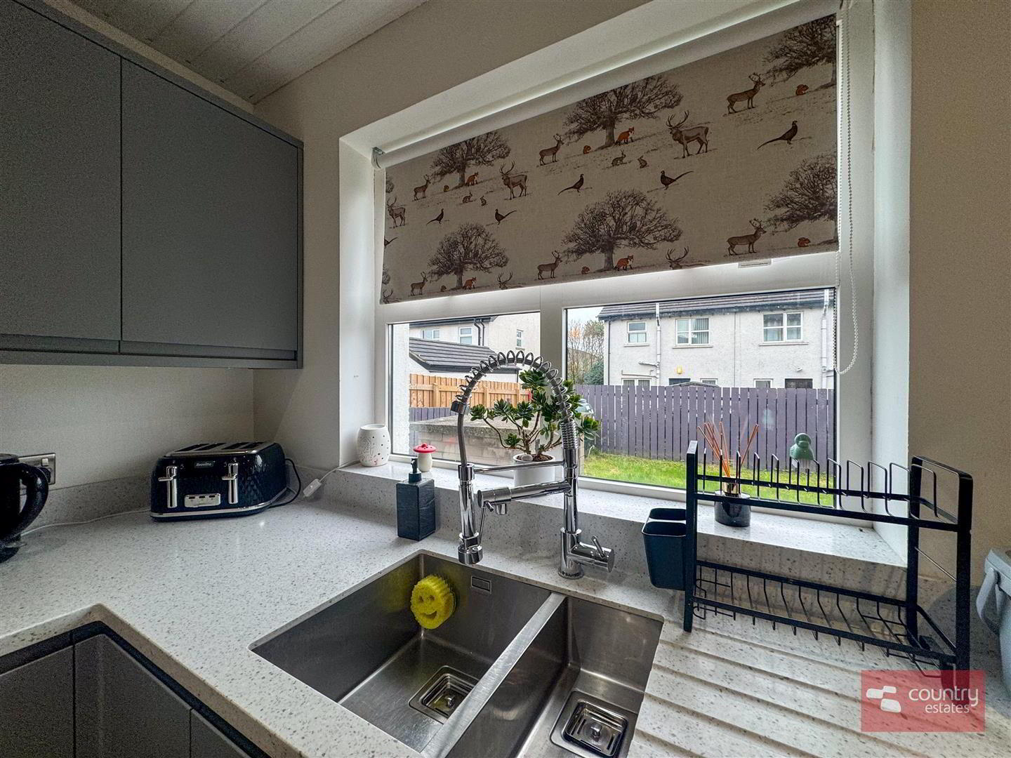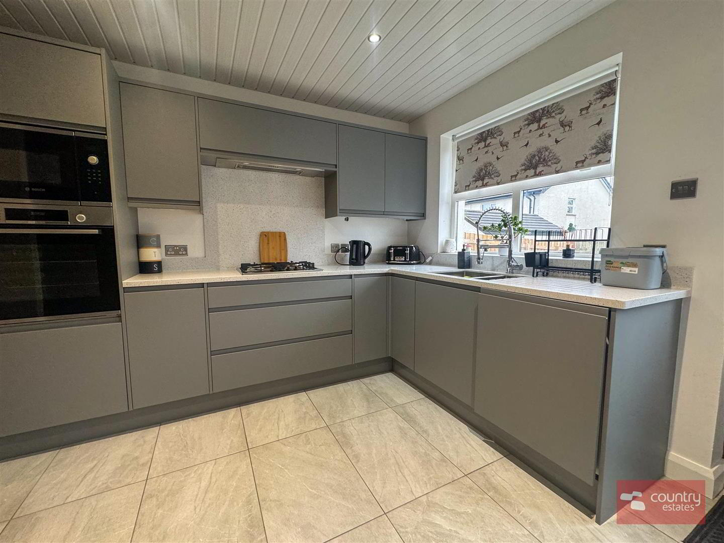 - Equipped with a comprehensive range of high and low level fitted units in matt grey with contrasting corian work surfaces. A host of integrated appliances including eye level oven, microwave, separate 4 ring gas hob, concealed overhead extractor fan, washing machine and fridge freezer. Inlaid stainless steel sink unit with flexible hose tap. Integrated larder cupboard.
