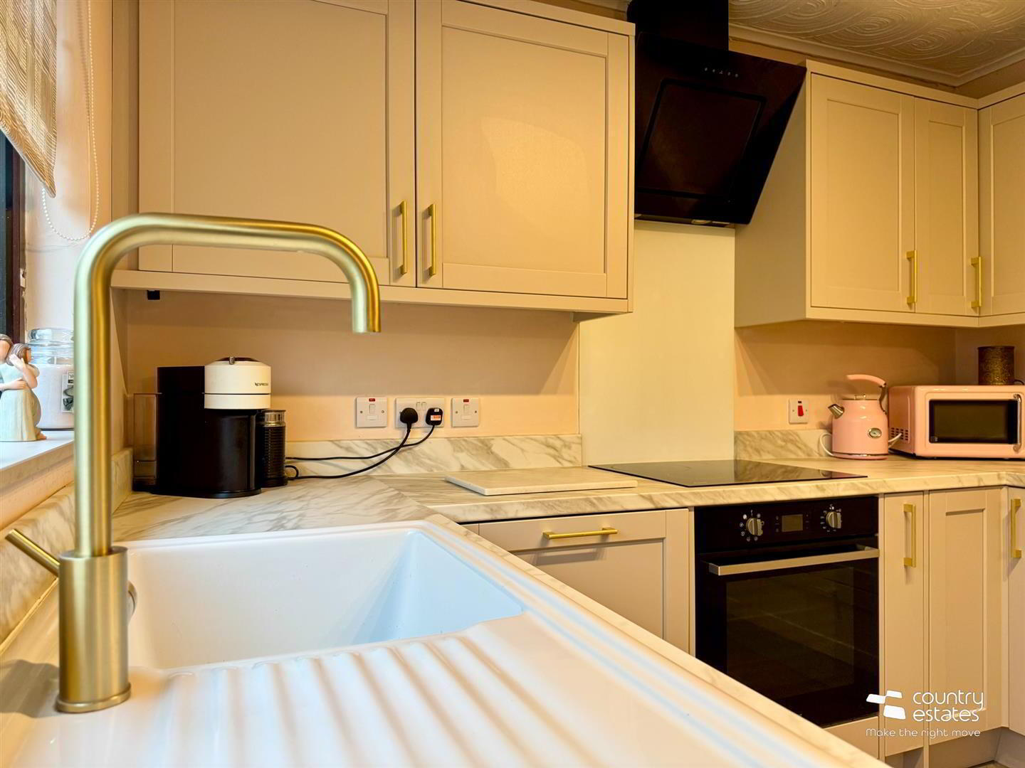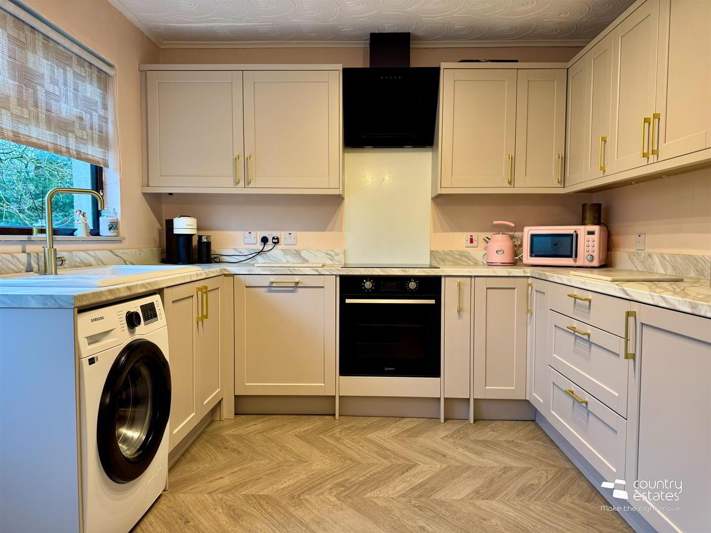 Equipped with a comprehensive range of high and low level fitted shaker style units with contrasting work services and upstands. Ceramic single drainer sink unit with swan neck tap in brushed gold effect. A range of Integrated appliances including oven with four ring hob and modern angled overhead extractor fan. Dishwasher and fridge freezer. Plumbed for washing machine. PVC mahogany effect double glazed door to garden.