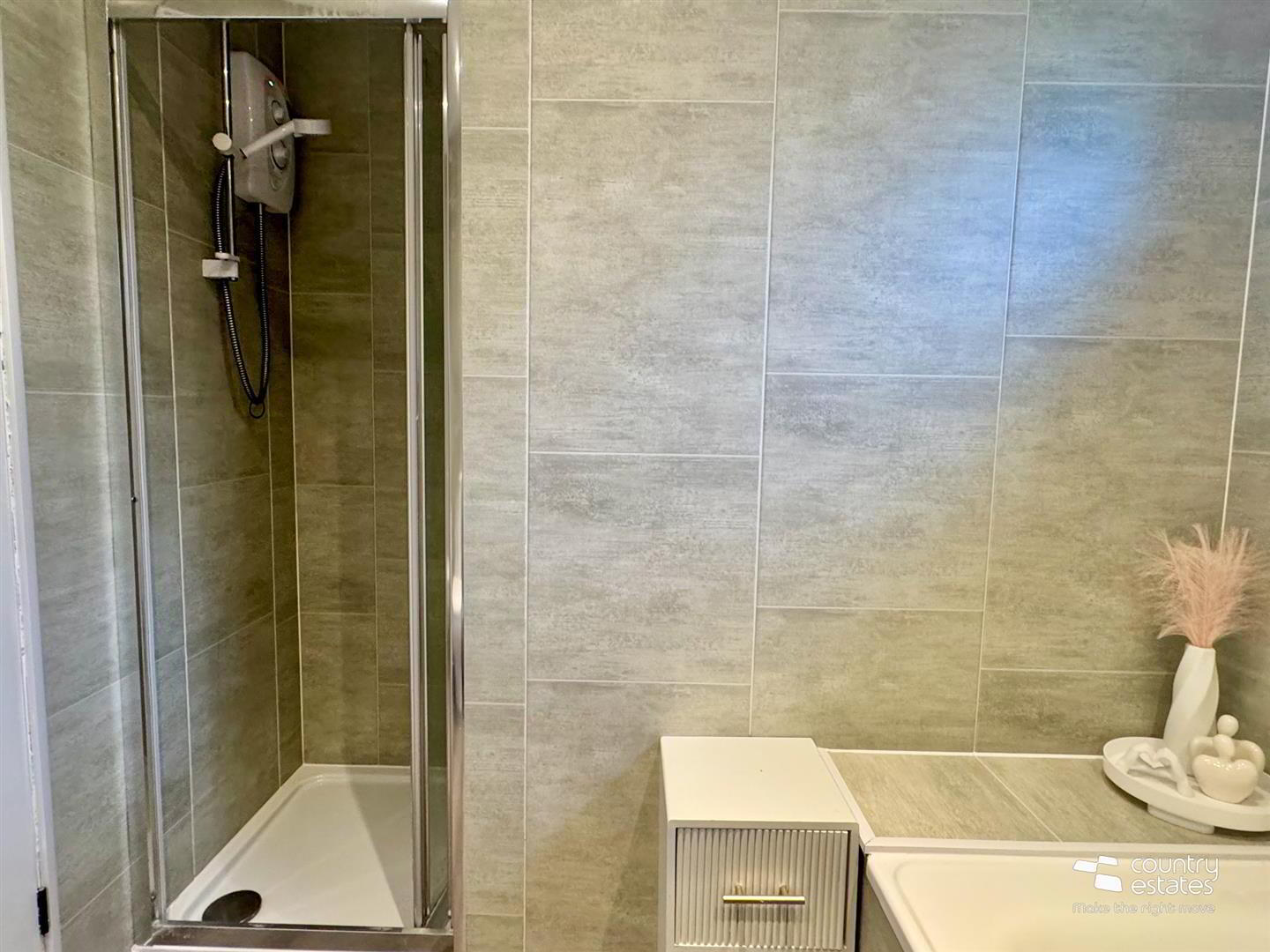 Comprising button flush w.c, pedestal wash hand basin with monobloc tap, panelled bath and separate shower enclosure with electric shower. Tile effect PVC panelled walls.